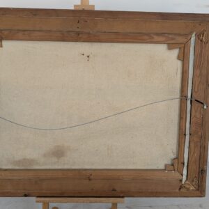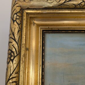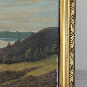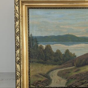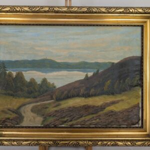 A picturesque oil landscape on canvas in a wooden gilt frame. The painting depicts a mountainous landscape with a winding road, forests and a lake in the background. The colour scheme of the painting is subdued and the painting technique suggests that it is the work of an artist from the past.