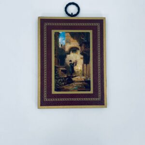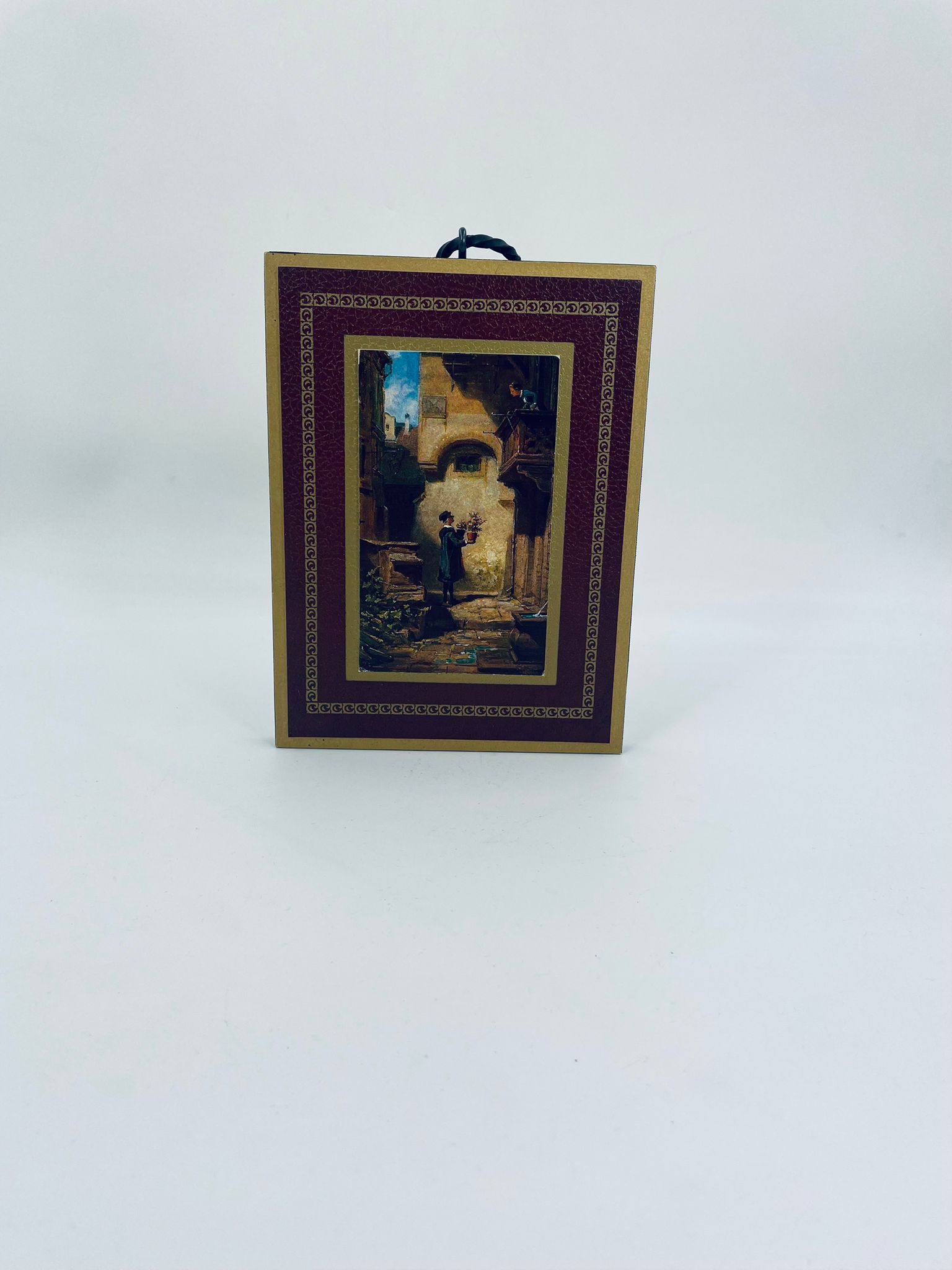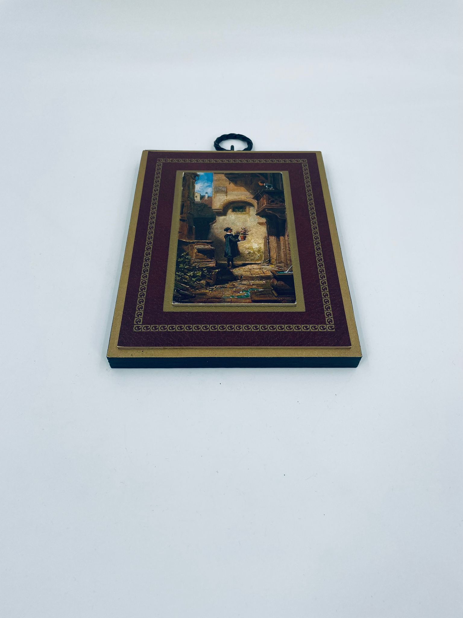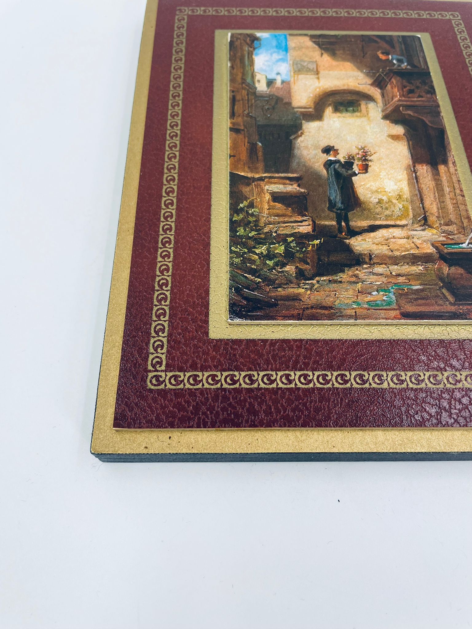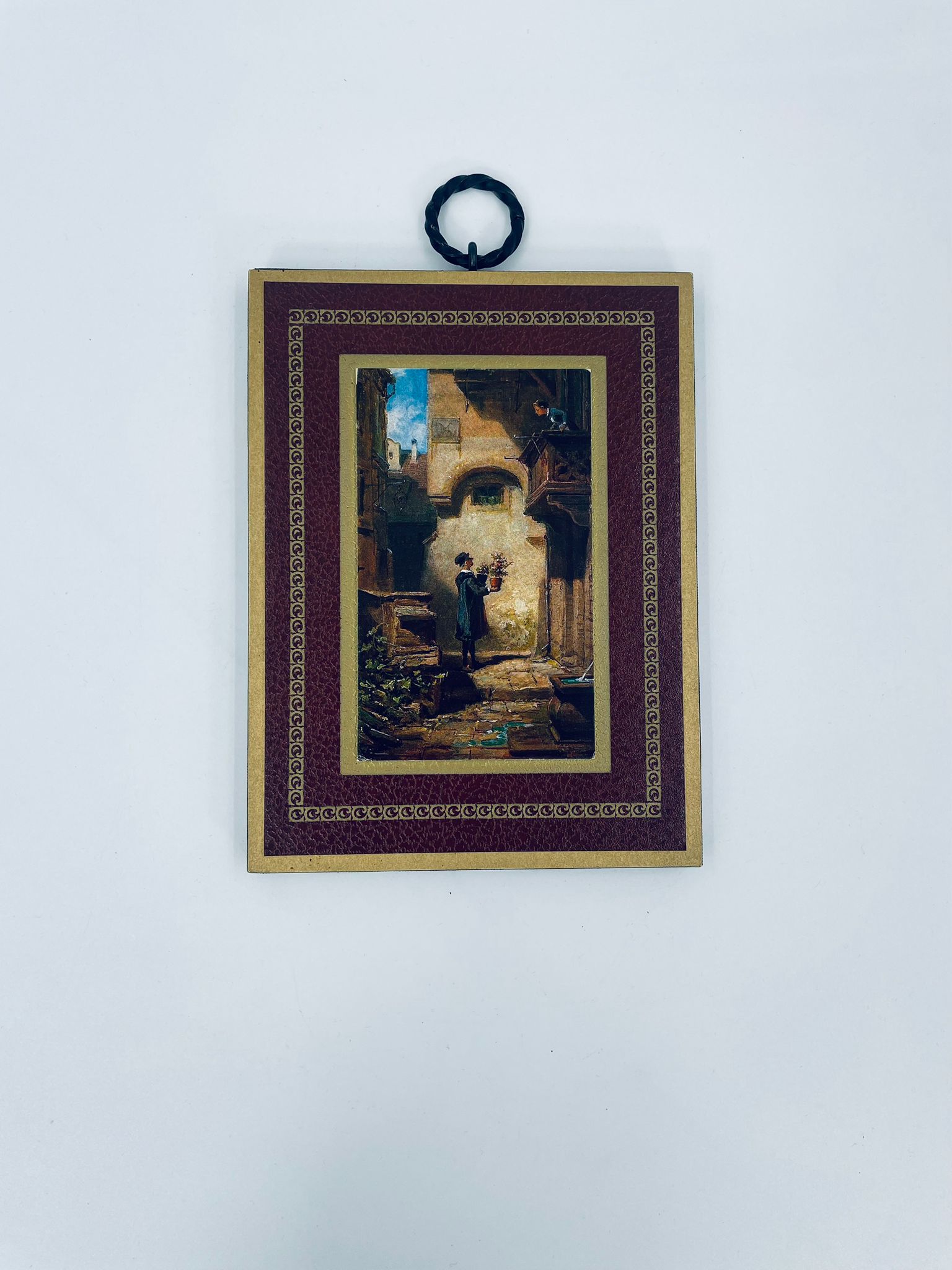 A picture by the German painter Carl Spitzweg (1808-1885) framed on a maroon background with gold patterns. The picture shows a Man in dark clothing with a bouquet of flowers in his hand, standing in a courtyard, looking up at a Woman looking out over a balcony.