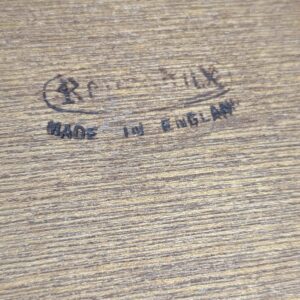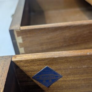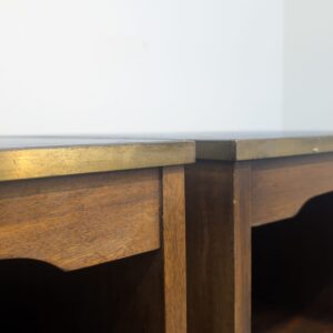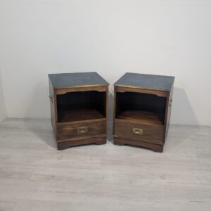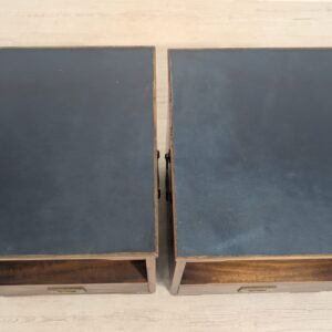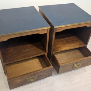 Zestaw dwóch angielskich szafek nocnych w stylu retro. Wykonane z drewna, z ciemnoniebieskim blatami skórzanym Beven Funell.