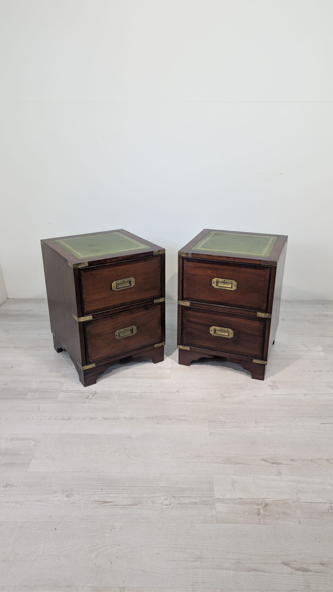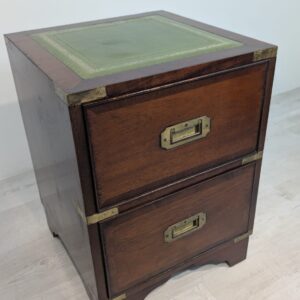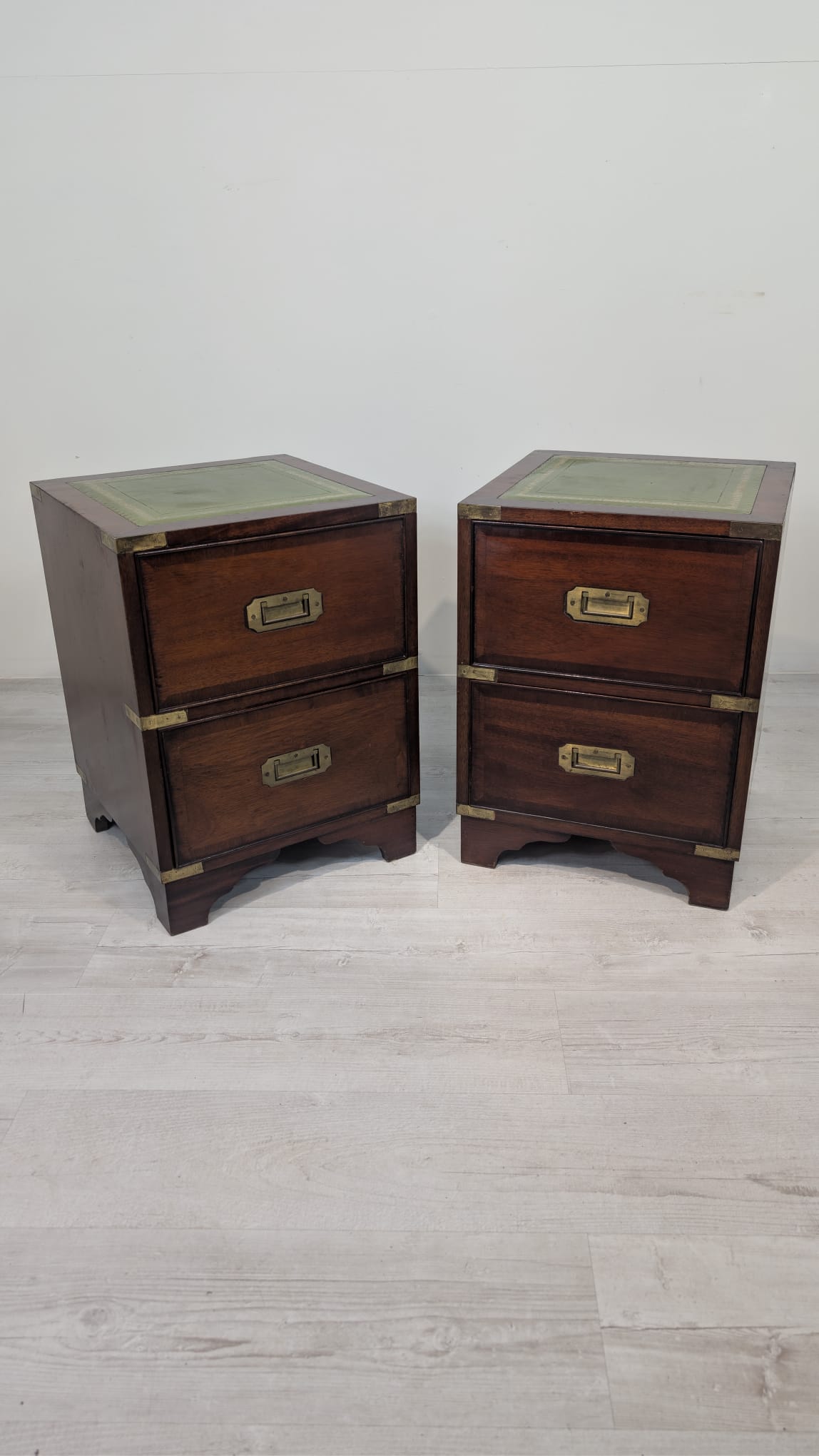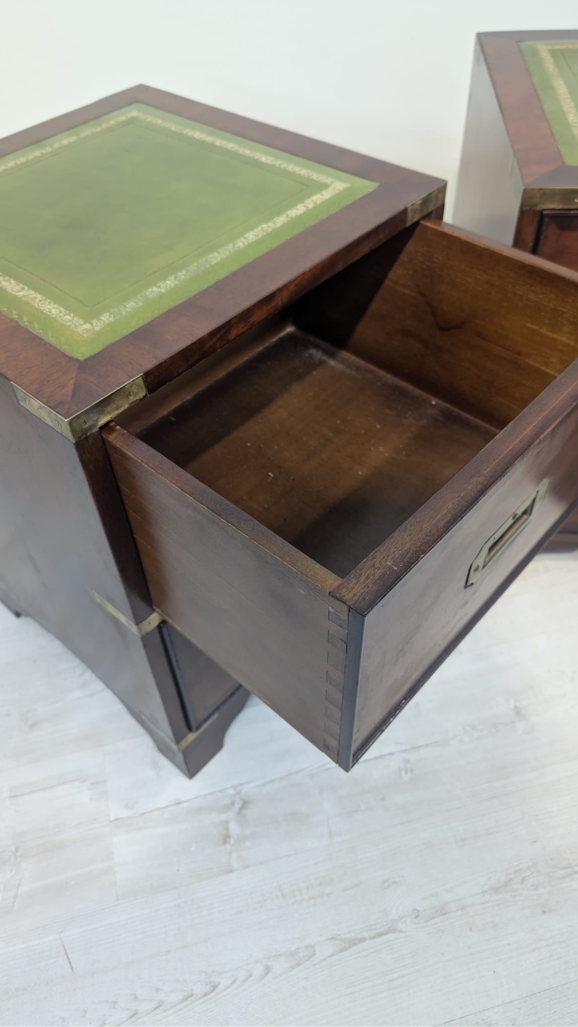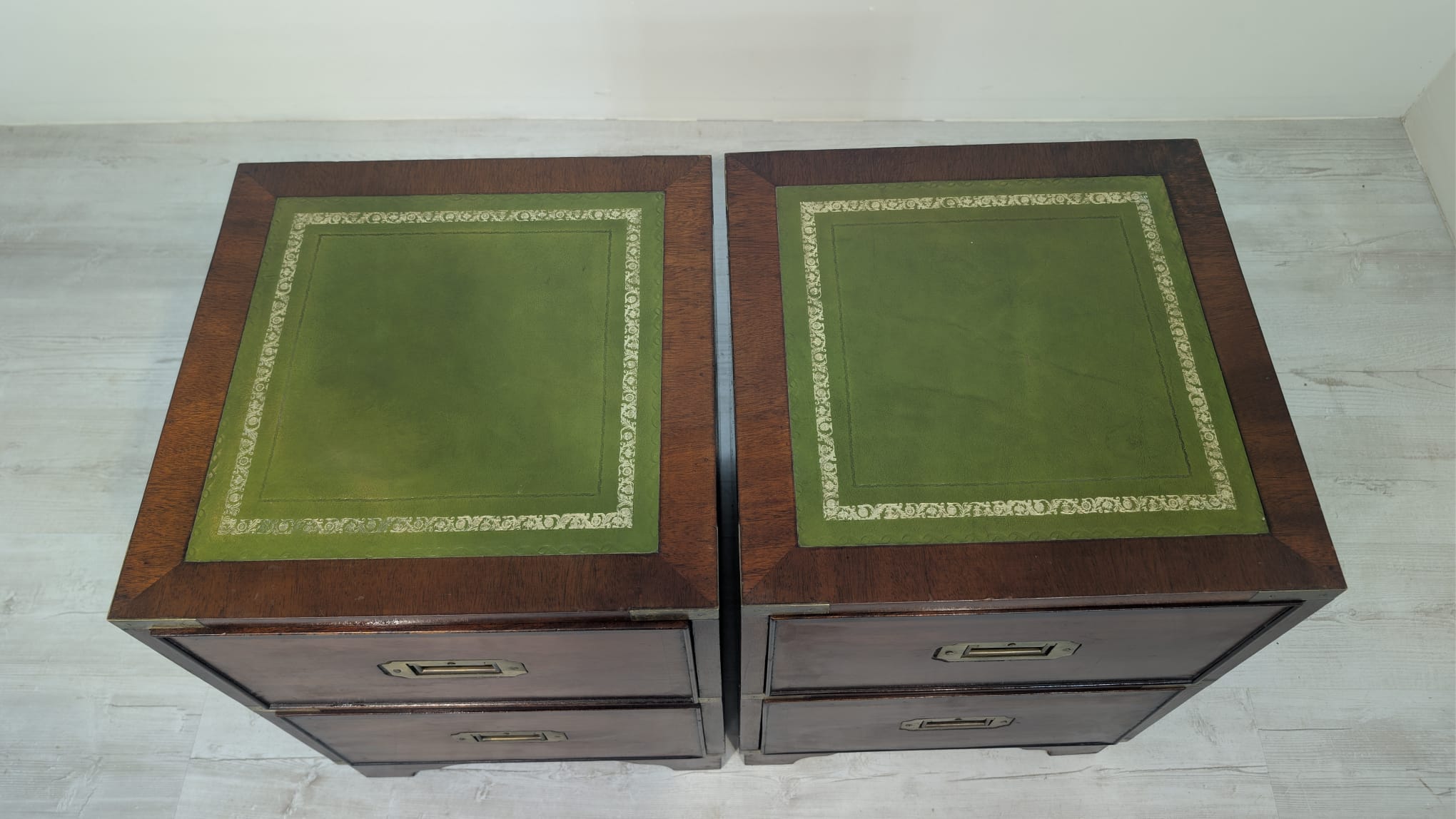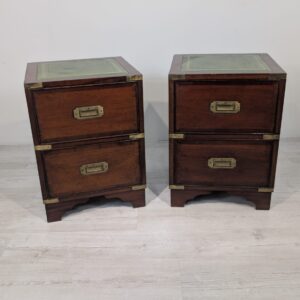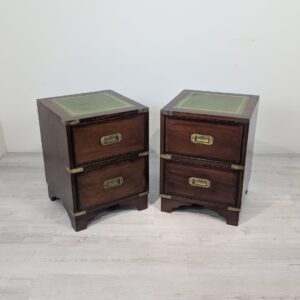 Zestaw dwóch angielskich szafek nocnych w stylu retro. Wykonane z drewna, z zielonym blatami skórzanym oraz z okuciami z mosiądzu.