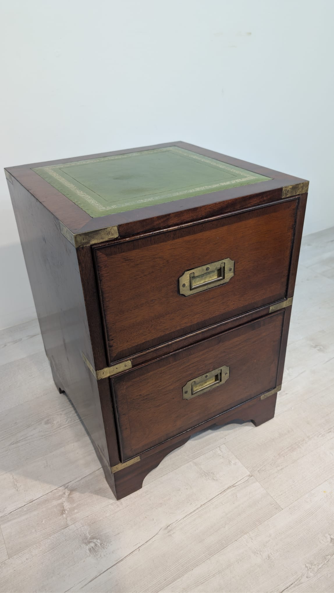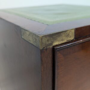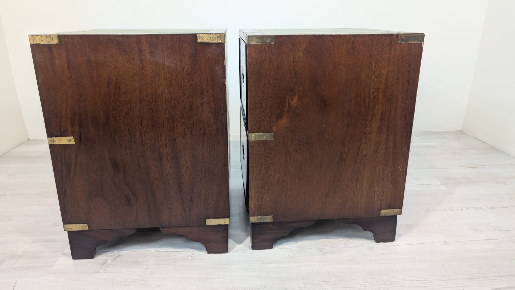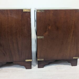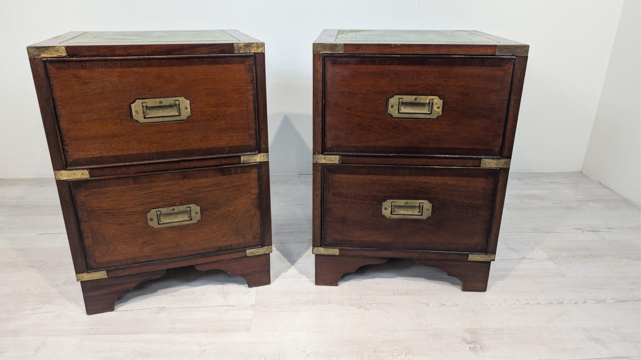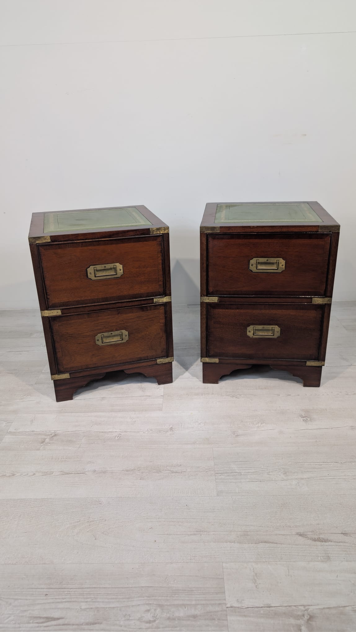 Zestaw dwóch angielskich szafek nocnych w stylu retro. Wykonane z drewna, z zielonym blatami skórzanym oraz z okuciami z mosiądzu.