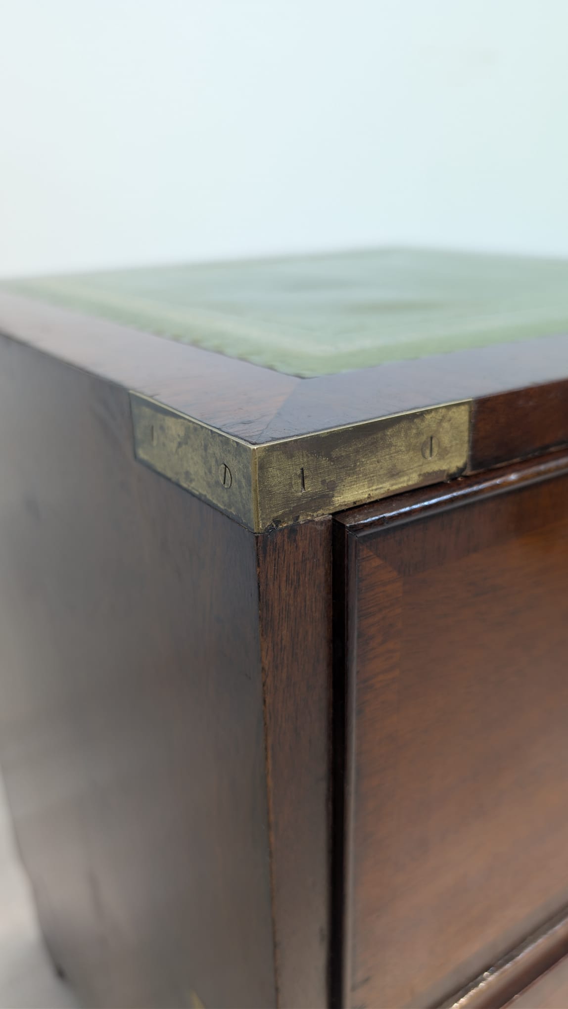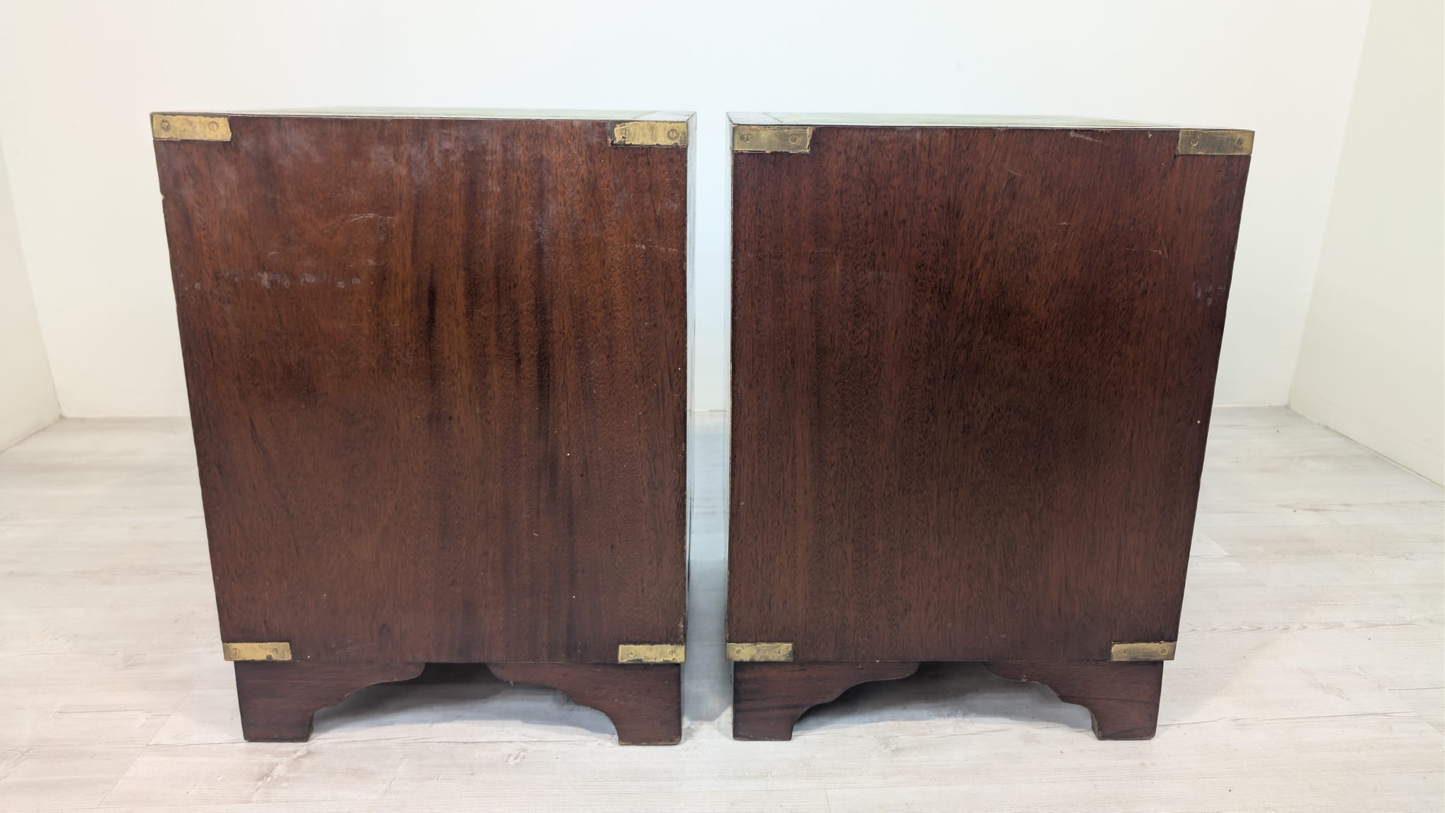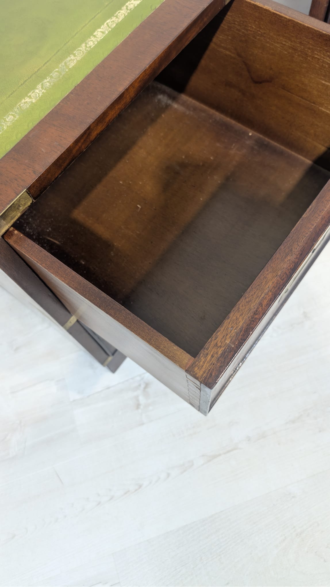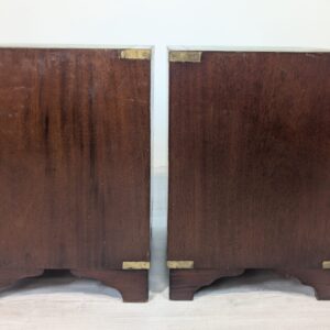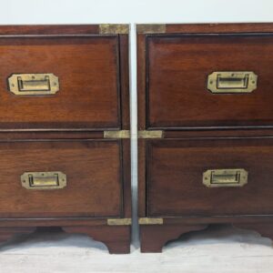 Zestaw dwóch angielskich szafek nocnych w stylu retro. Wykonane z drewna, z zielonym blatami skórzanym oraz z okuciami z mosiądzu.