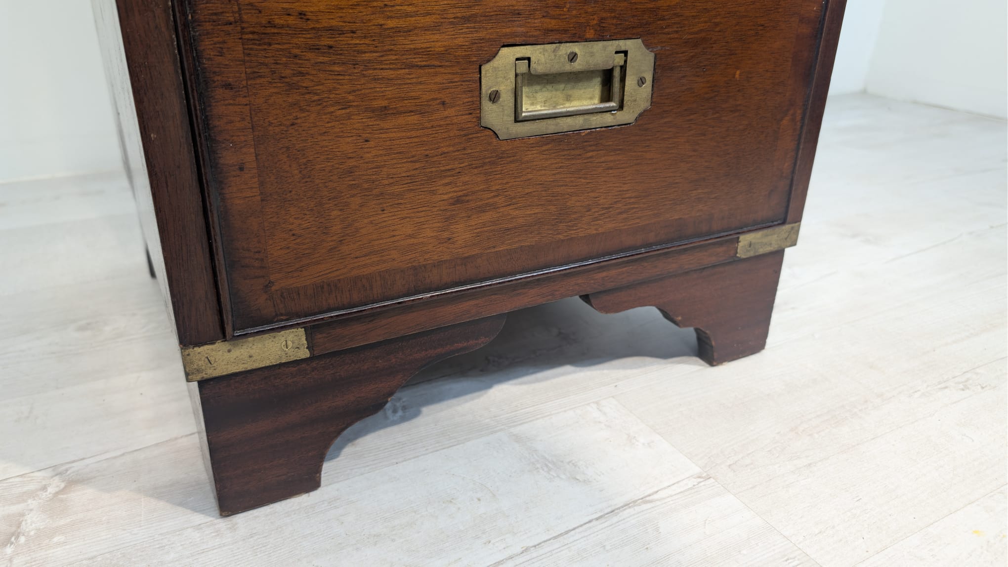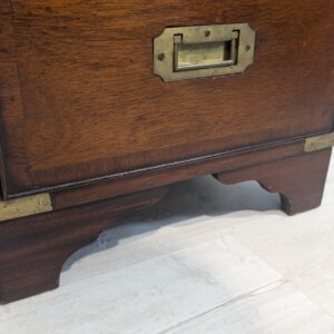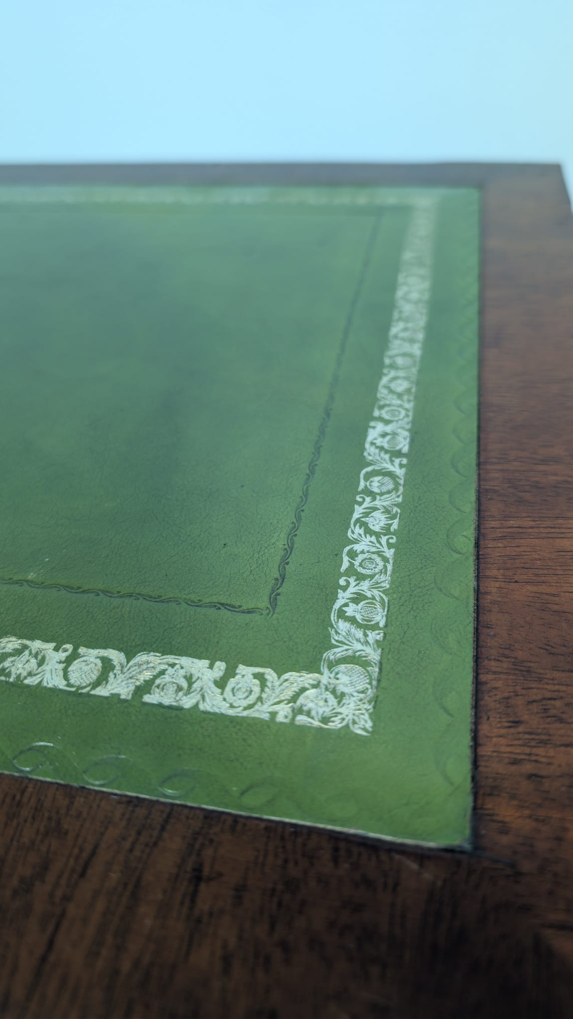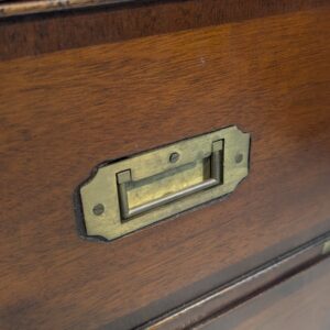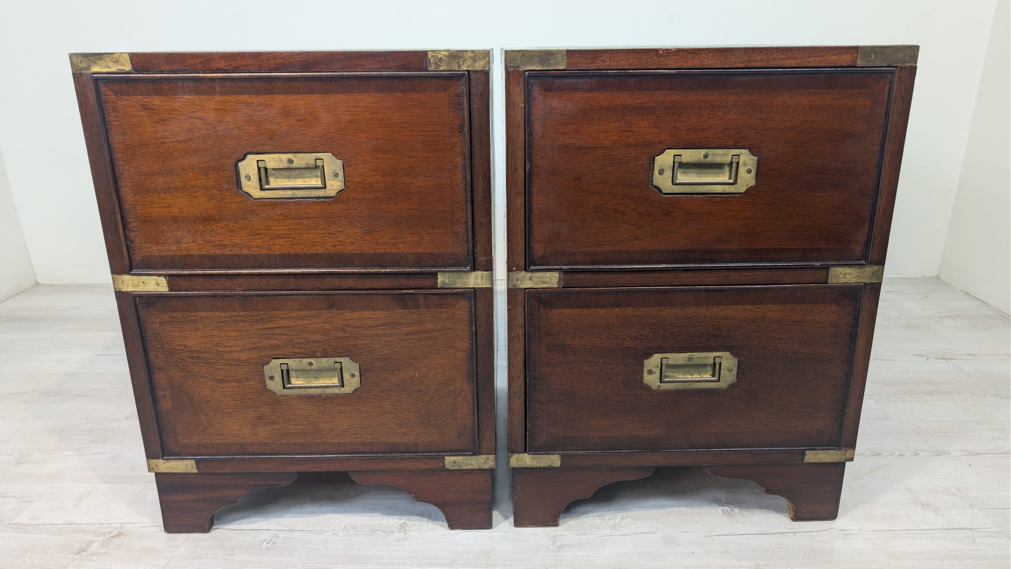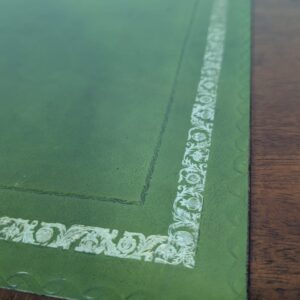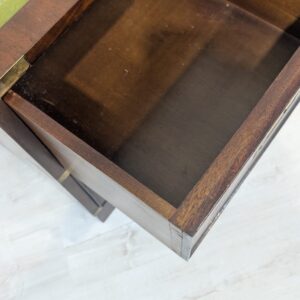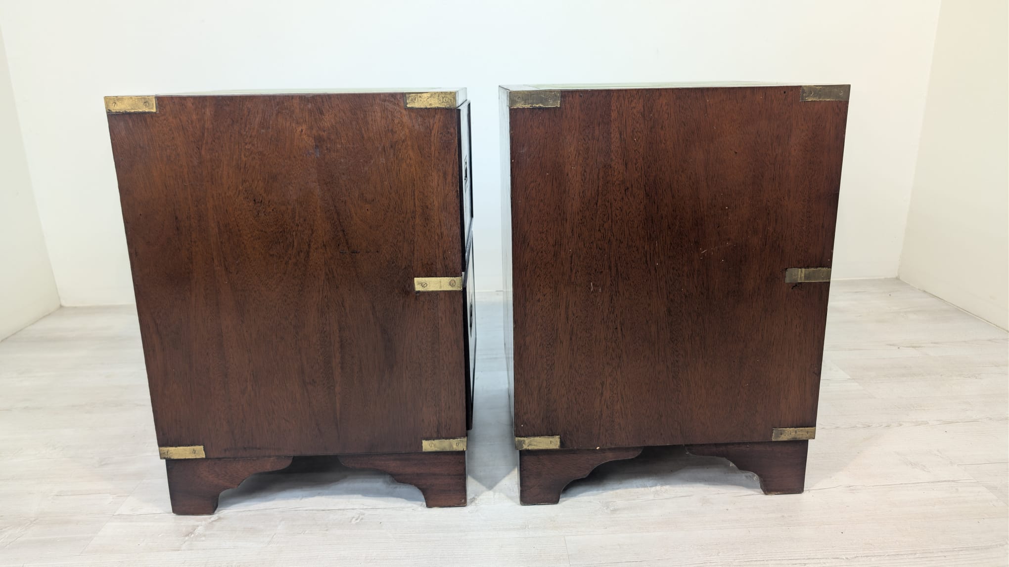 Zestaw dwóch angielskich szafek nocnych w stylu retro. Wykonane z drewna, z zielonym blatami skórzanym oraz z okuciami z mosiądzu.