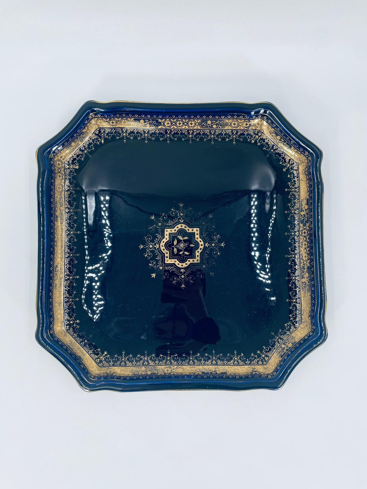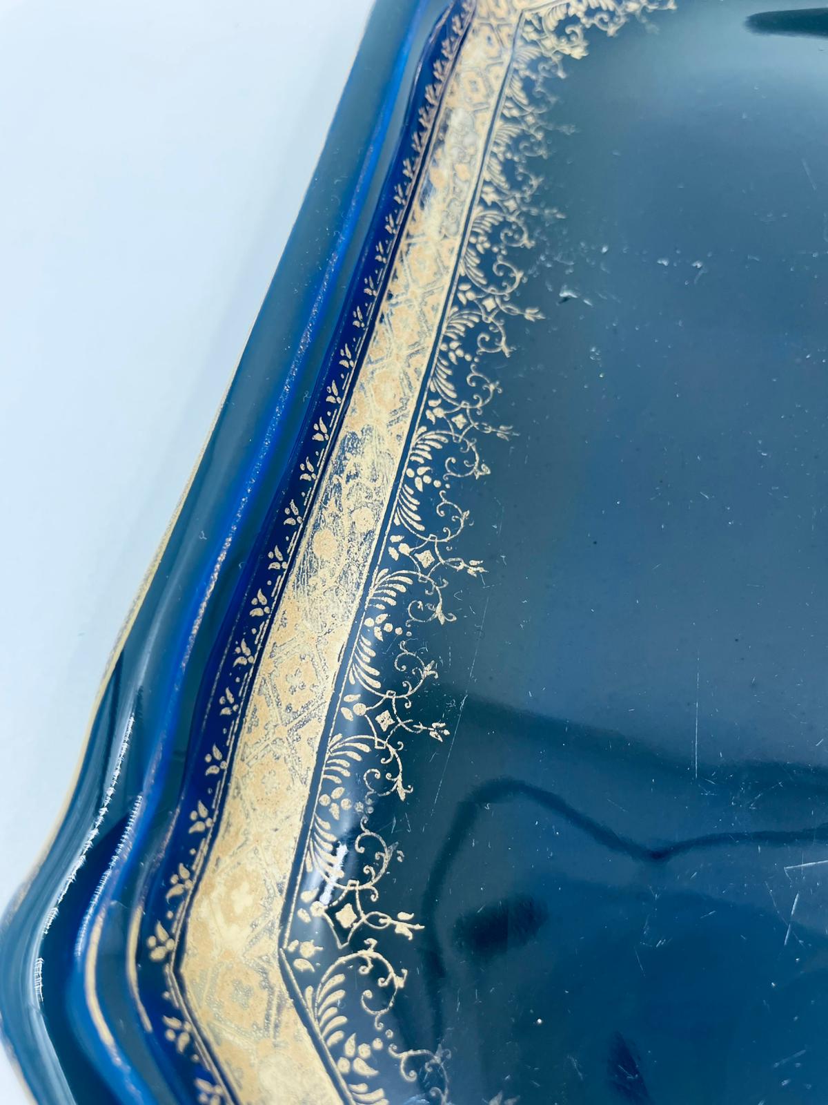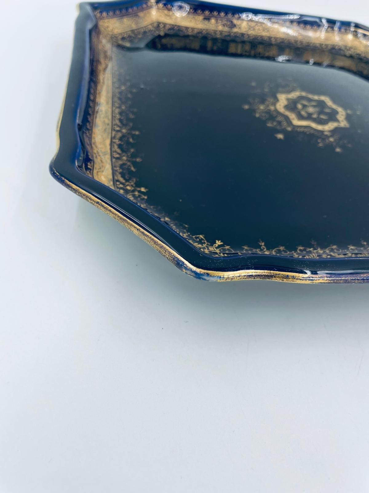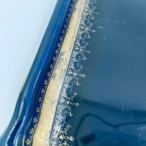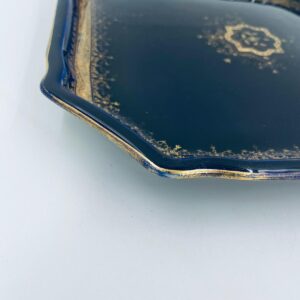 Patera dekoracyjna wytwórni Sarreguemines, wykonana z wysokiej jakości ceramiki. Patera w kobaltowym kolorze, ozdobiona złotymi wzorami, wykończona złoceniem na nieregularnym obrzeżu. Posiada przetarcie złocenia.