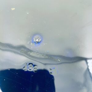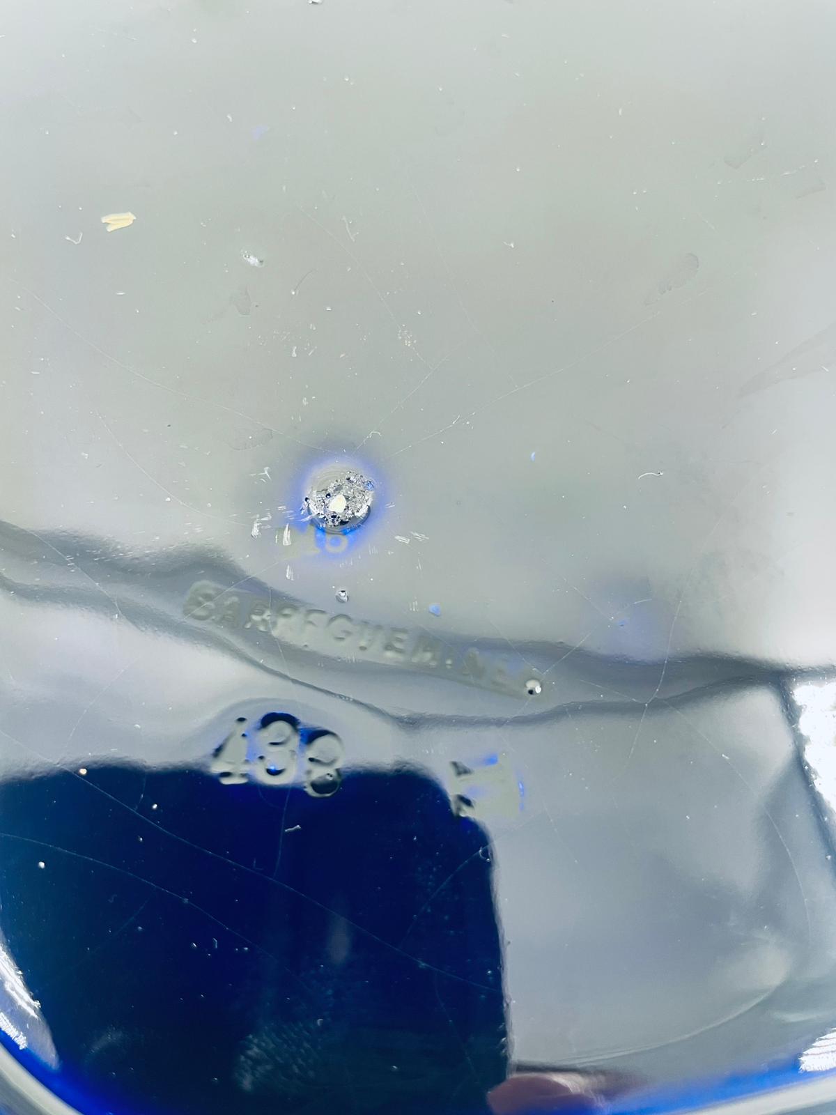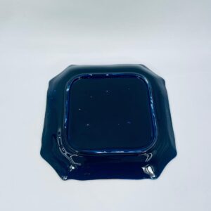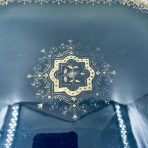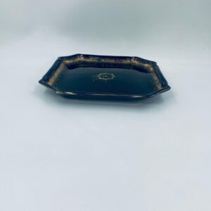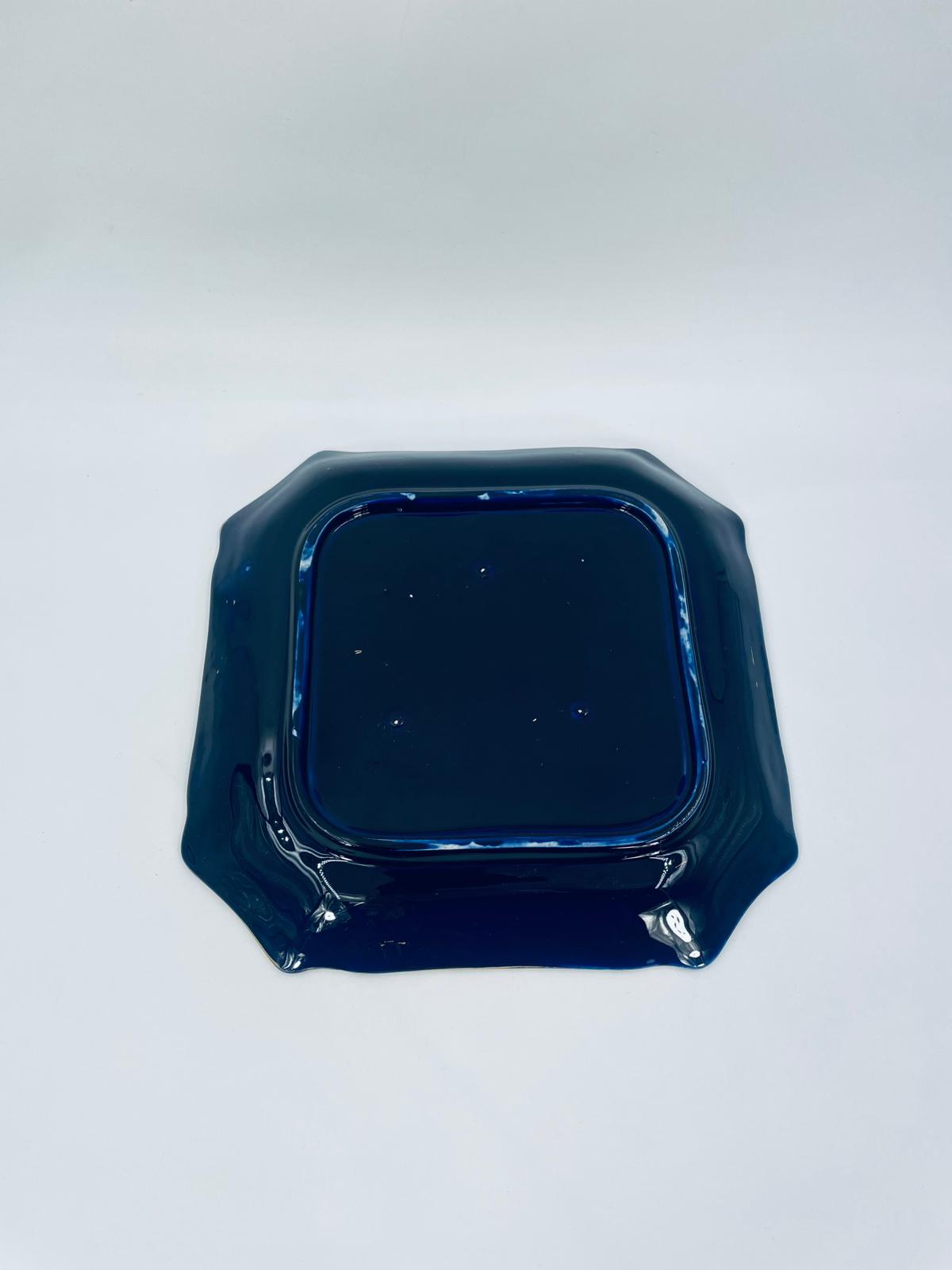 Patera dekoracyjna wytwórni Sarreguemines, wykonana z wysokiej jakości ceramiki. Patera w kobaltowym kolorze, ozdobiona złotymi wzorami, wykończona złoceniem na nieregularnym obrzeżu. Posiada przetarcie złocenia.