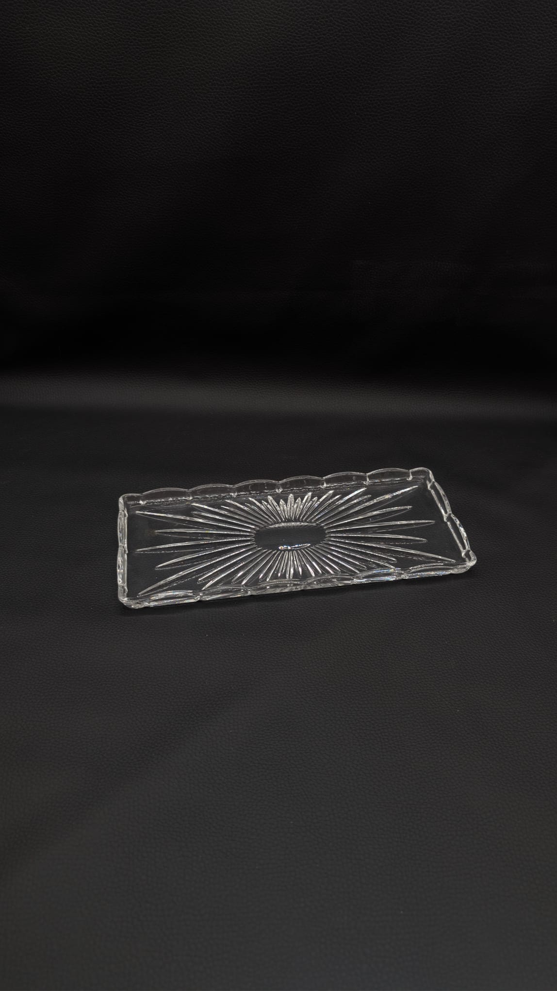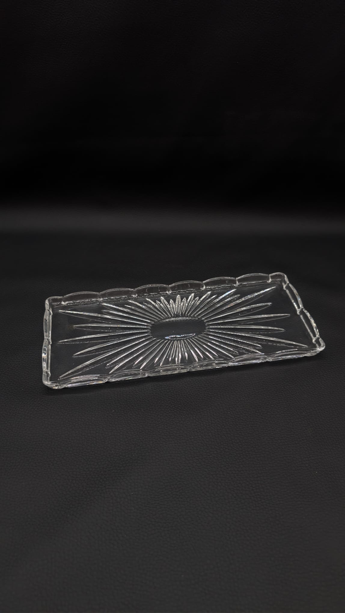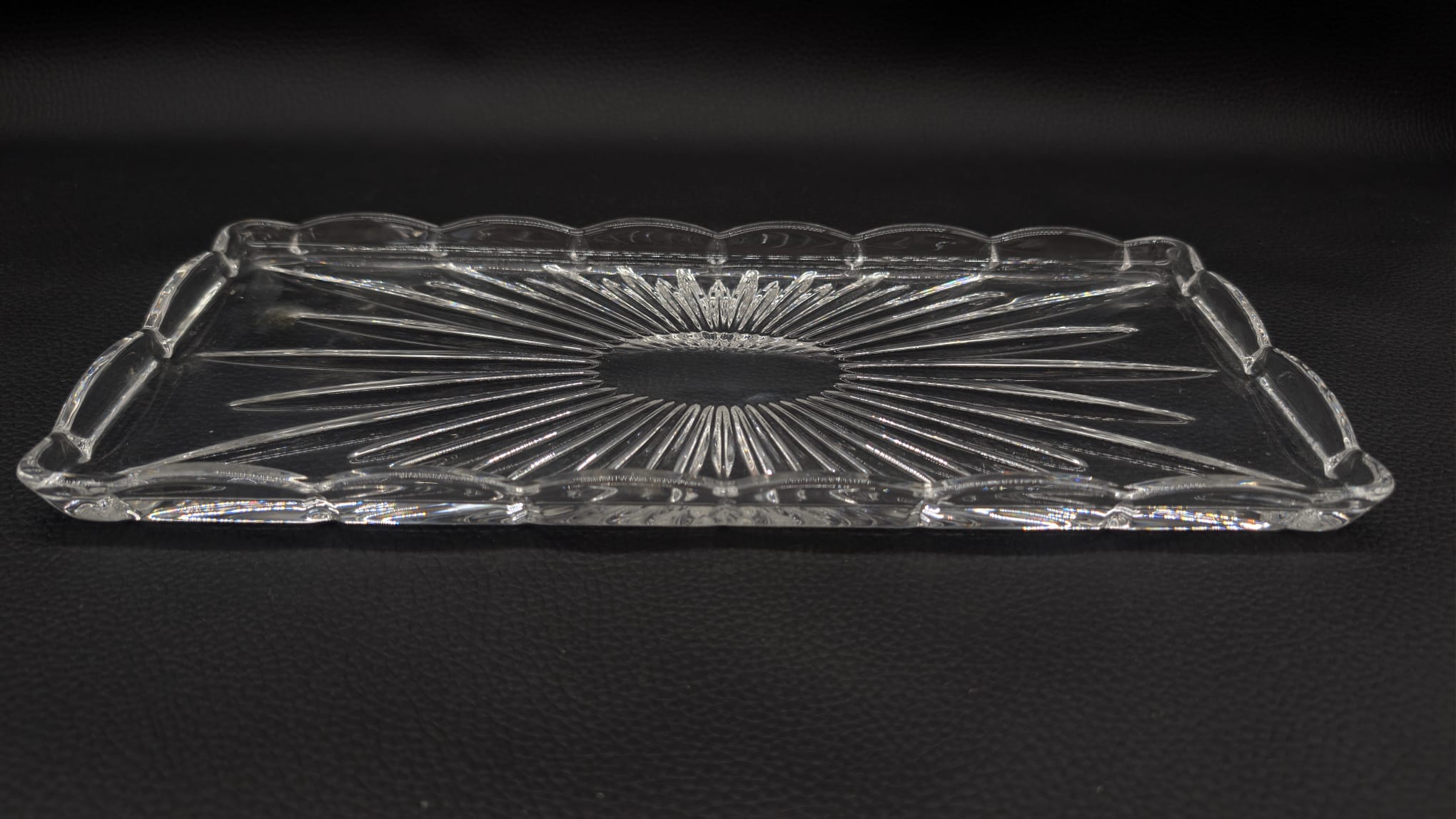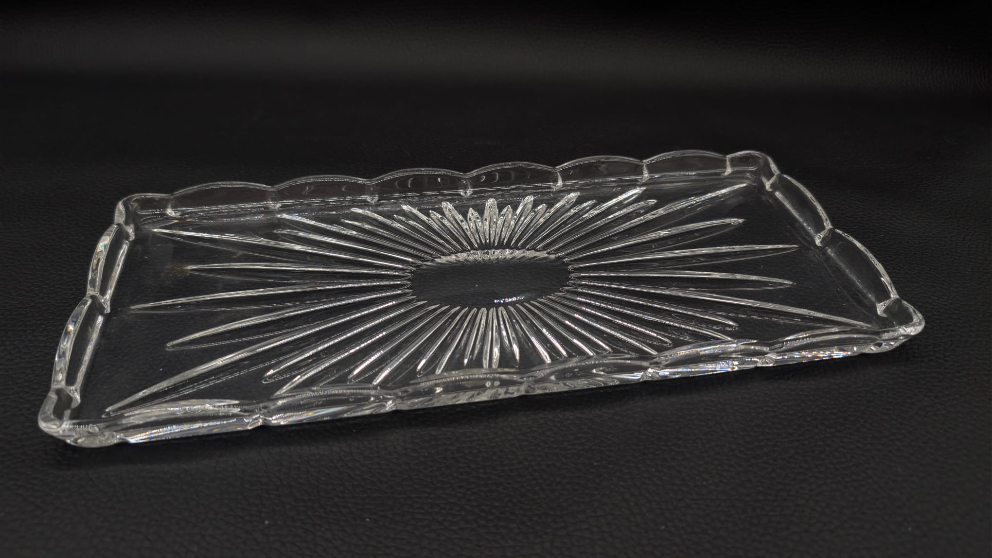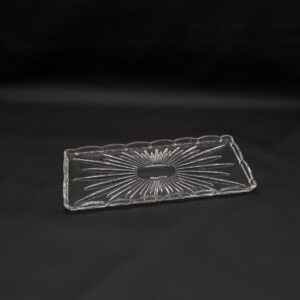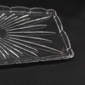 Elegancka, kryształowa taca w stylu vintage. Delikatny wzór promieni nadaje jej niepowtarzalny charakter. Doskonała do serwowania przekąsek lub jako ozdoba na stole. Pomimo upływu czasu, taca zachowała swój blask i jest w dobrym stanie.