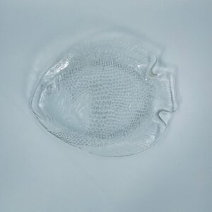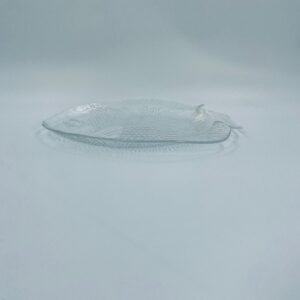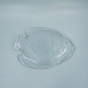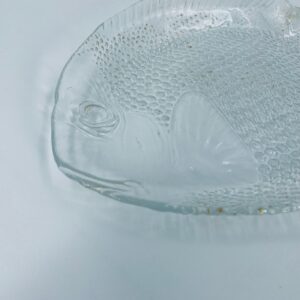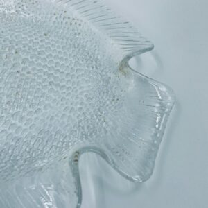 Patera, półmisek marki Arcoroc w stylu Vintage, wykonany z wysokiej jakości szkła hartowanego. Patera przezroczysta, w kształcie ryby z wytłoczonym wzorem łusek, płetw i głowy ryby. Posiada zabrudzenie.