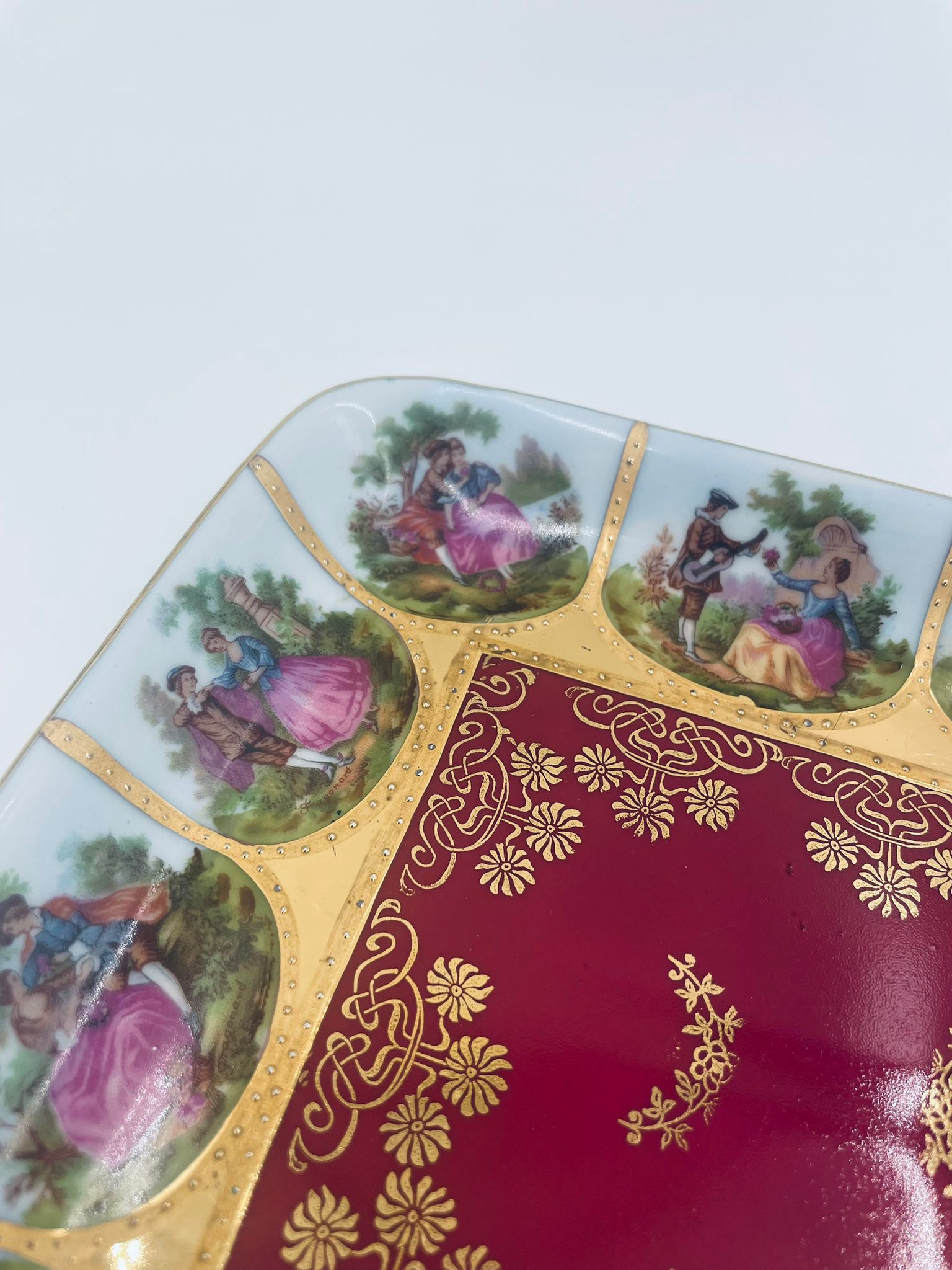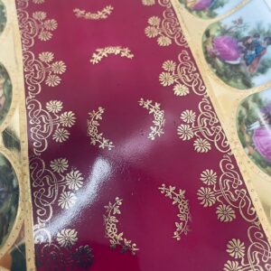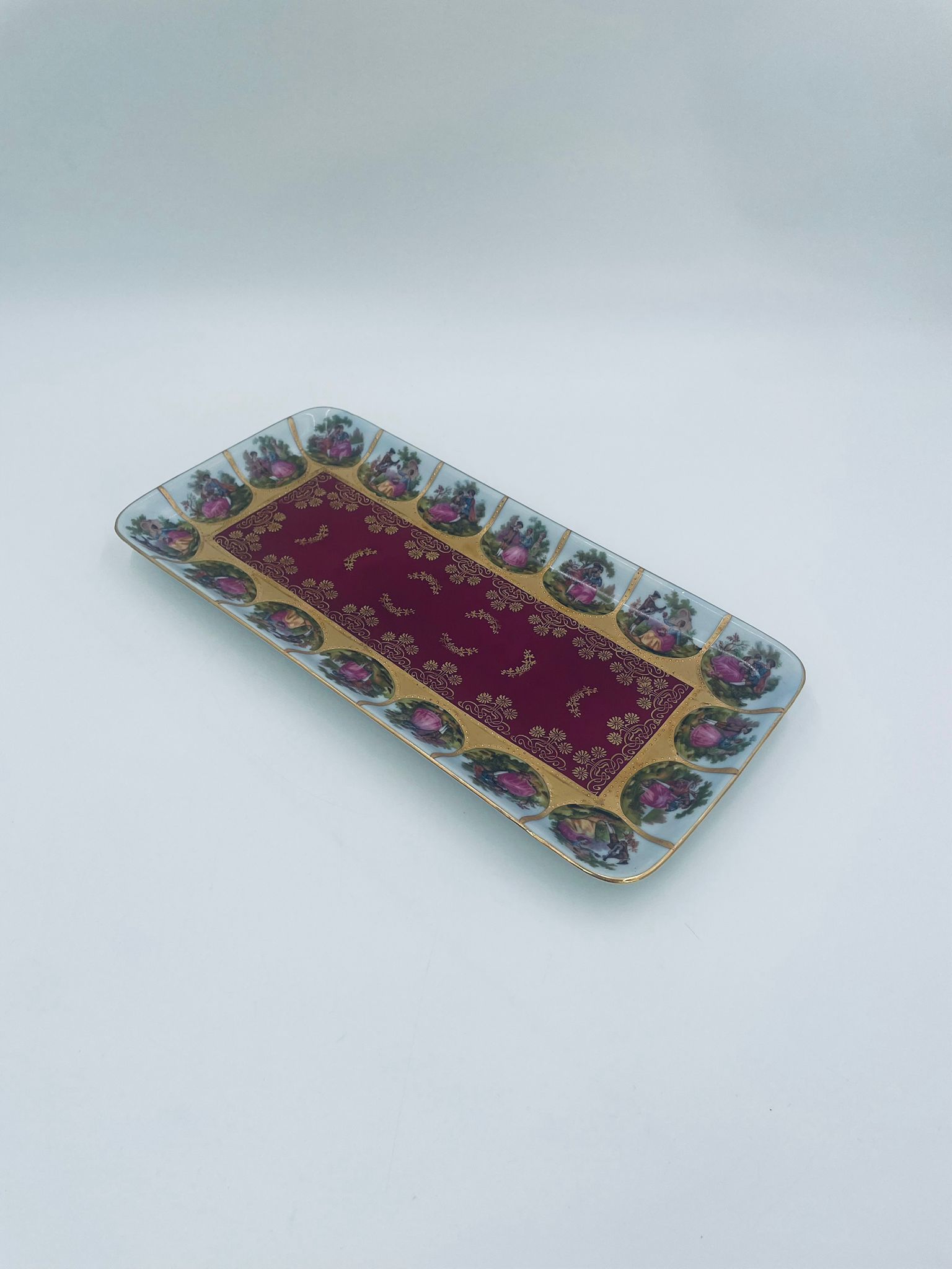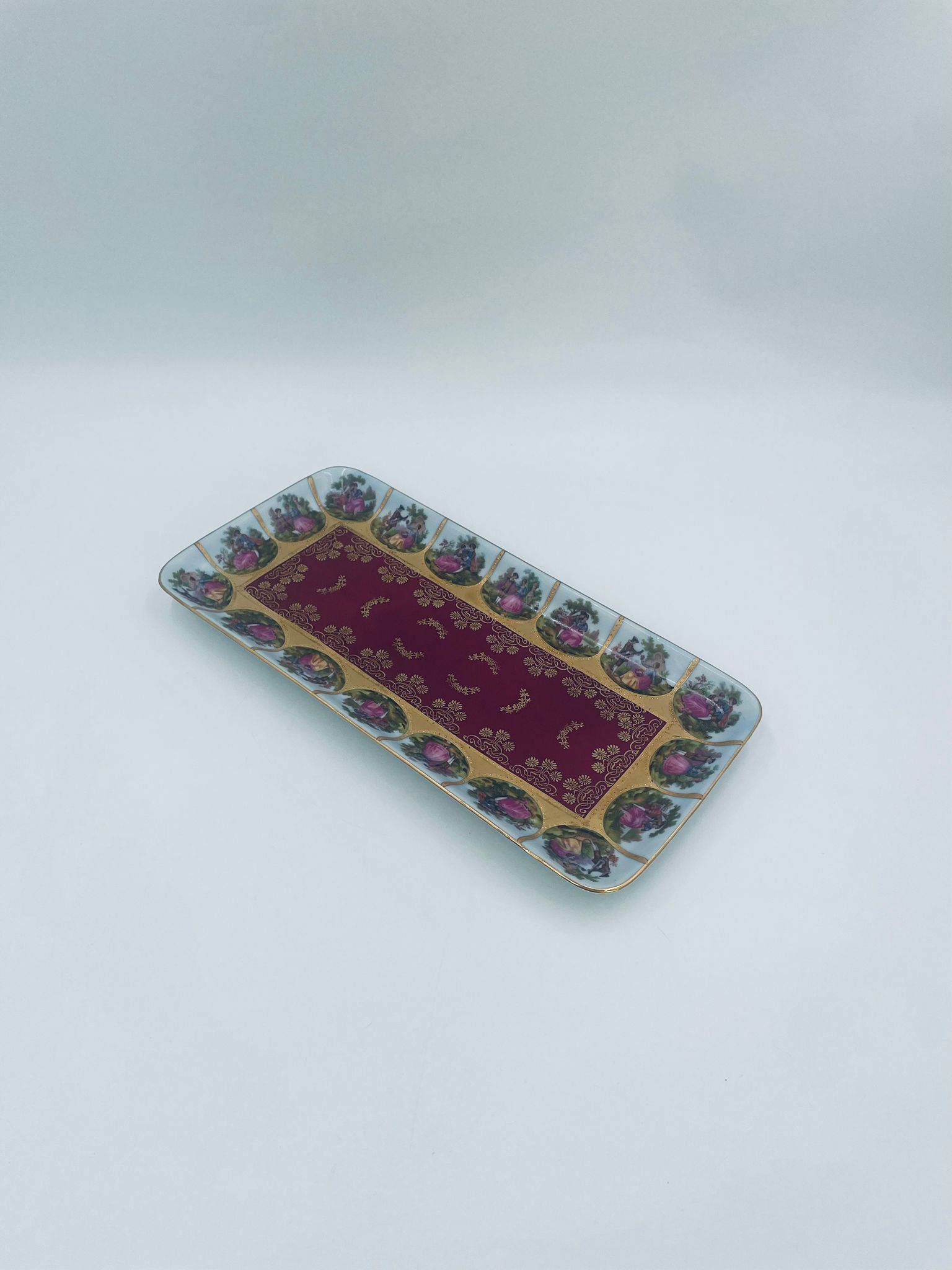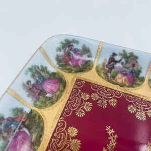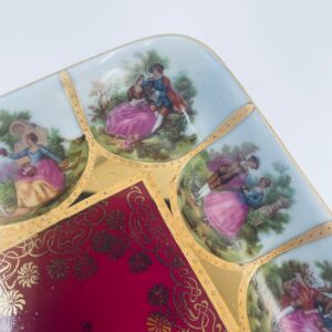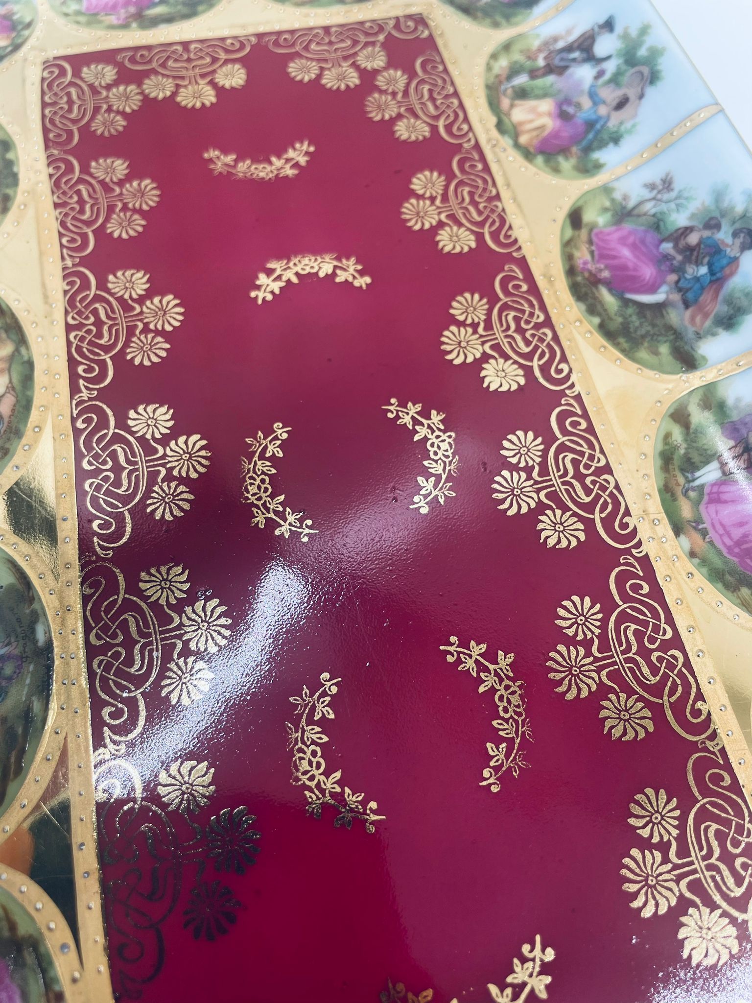 Patera dekoracyjna wytwórni Paul Leitner Wiesau, datowana na 1926r., wykonana z wysokiej jakości porcelany. Patera charakteryzuje się ręcznym, bogatym złoceniem, medalionami przedstawiającymi barokowe scenki rodzajowe oraz złotymi ornamentami na bordowym tle, wykończona złoceniem na krawędzi. Posiada przetarcie na złoceniu.
