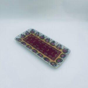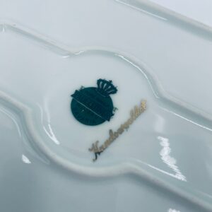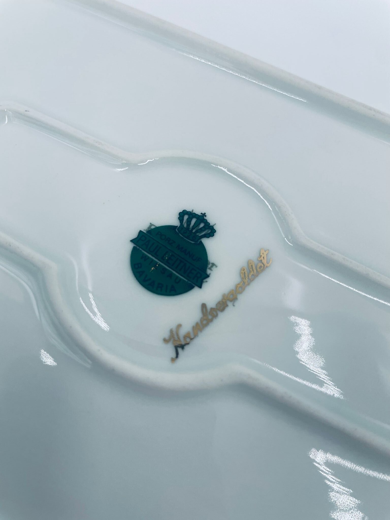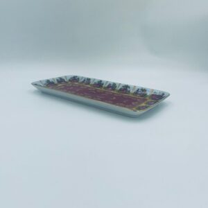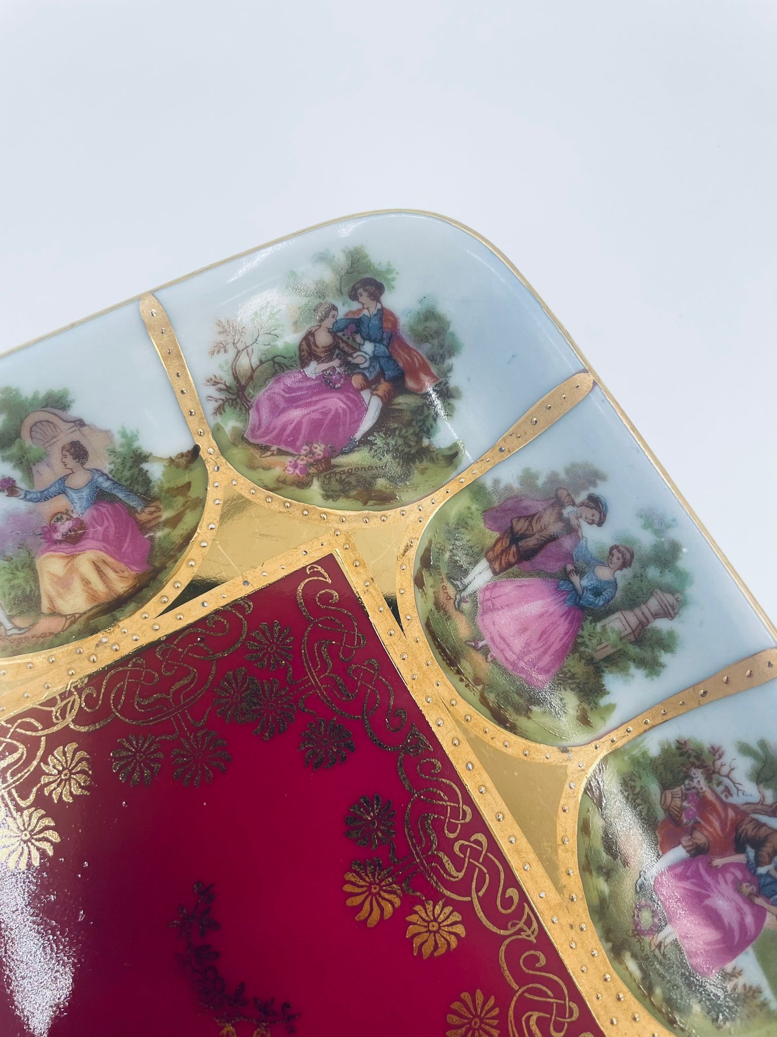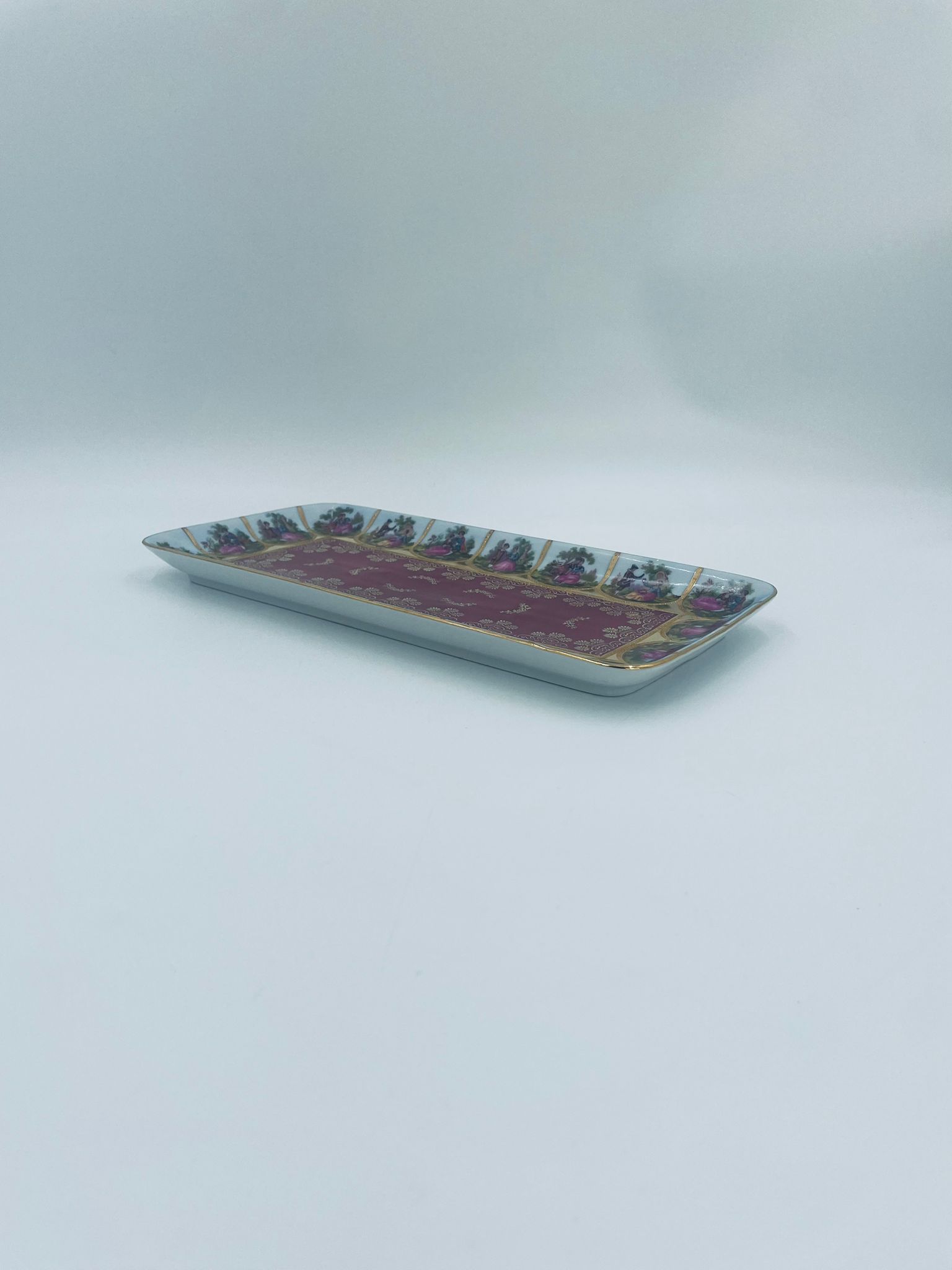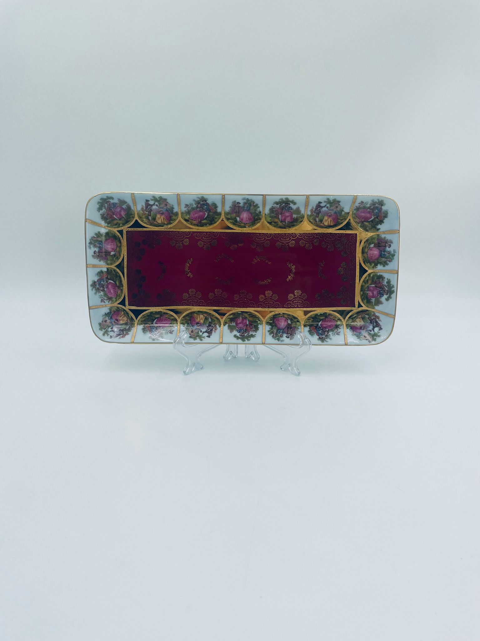 Patera dekoracyjna wytwórni Paul Leitner Wiesau, datowana na 1926r., wykonana z wysokiej jakości porcelany. Patera charakteryzuje się ręcznym, bogatym złoceniem, medalionami przedstawiającymi barokowe scenki rodzajowe oraz złotymi ornamentami na bordowym tle, wykończona złoceniem na krawędzi. Posiada przetarcie na złoceniu.