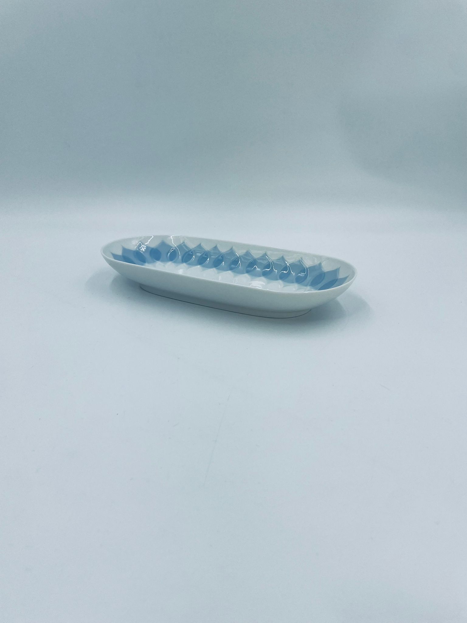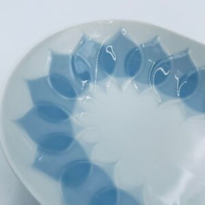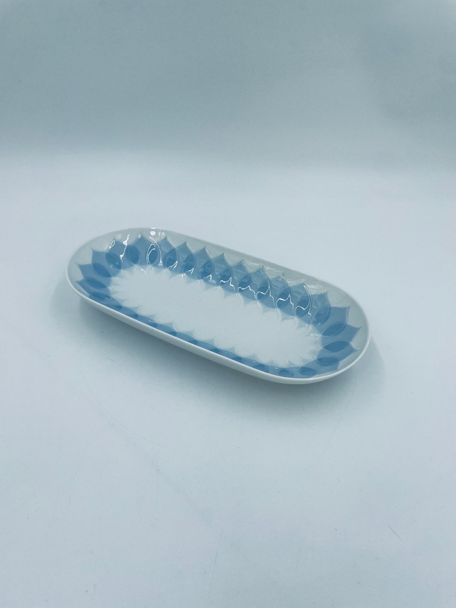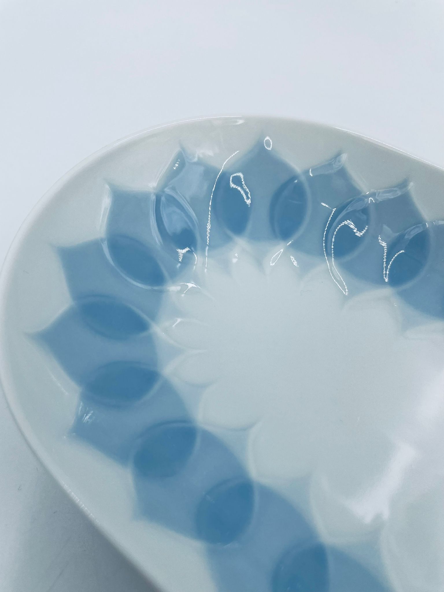 Patera dekoracyjna renomowanej wytwórni Rosenthal Studio Line z serii Lotus Blau , zaprojektowana przez duńskiego artystę Bjorna Wiinblada w 1964r, wykonana z najwyższej jakości białej porcelany. Patera ozdobiona wzorem „Blau”, charakteryzuje się delikatnym, geometrycznym motywem przypominający liście lotosu w niebieskim odcieniu.