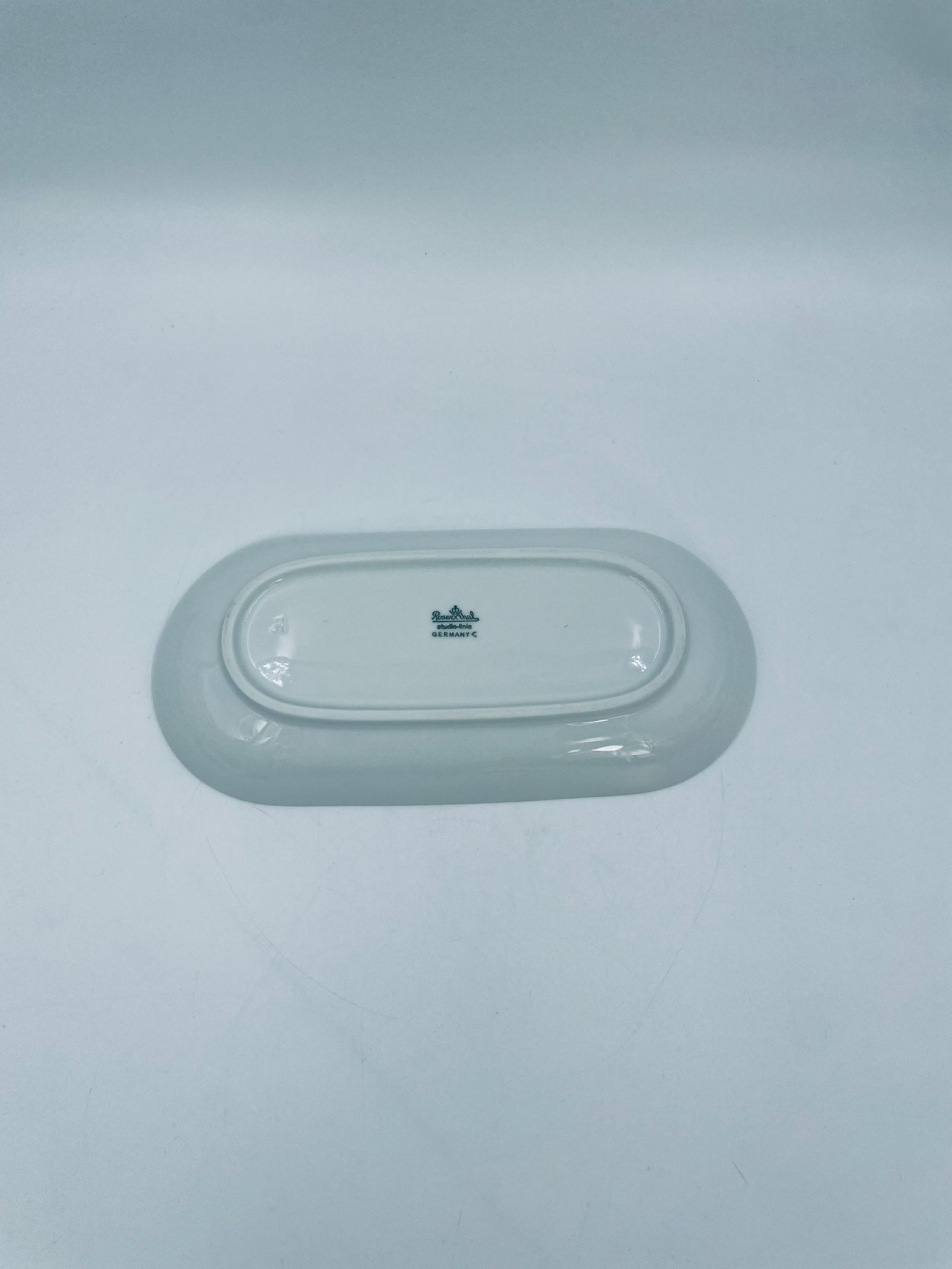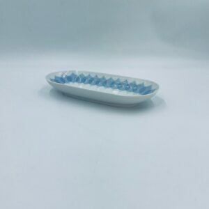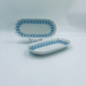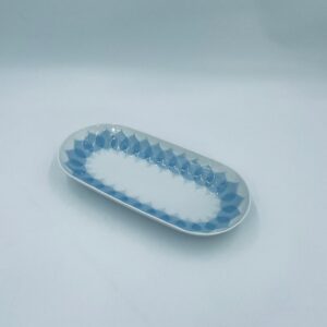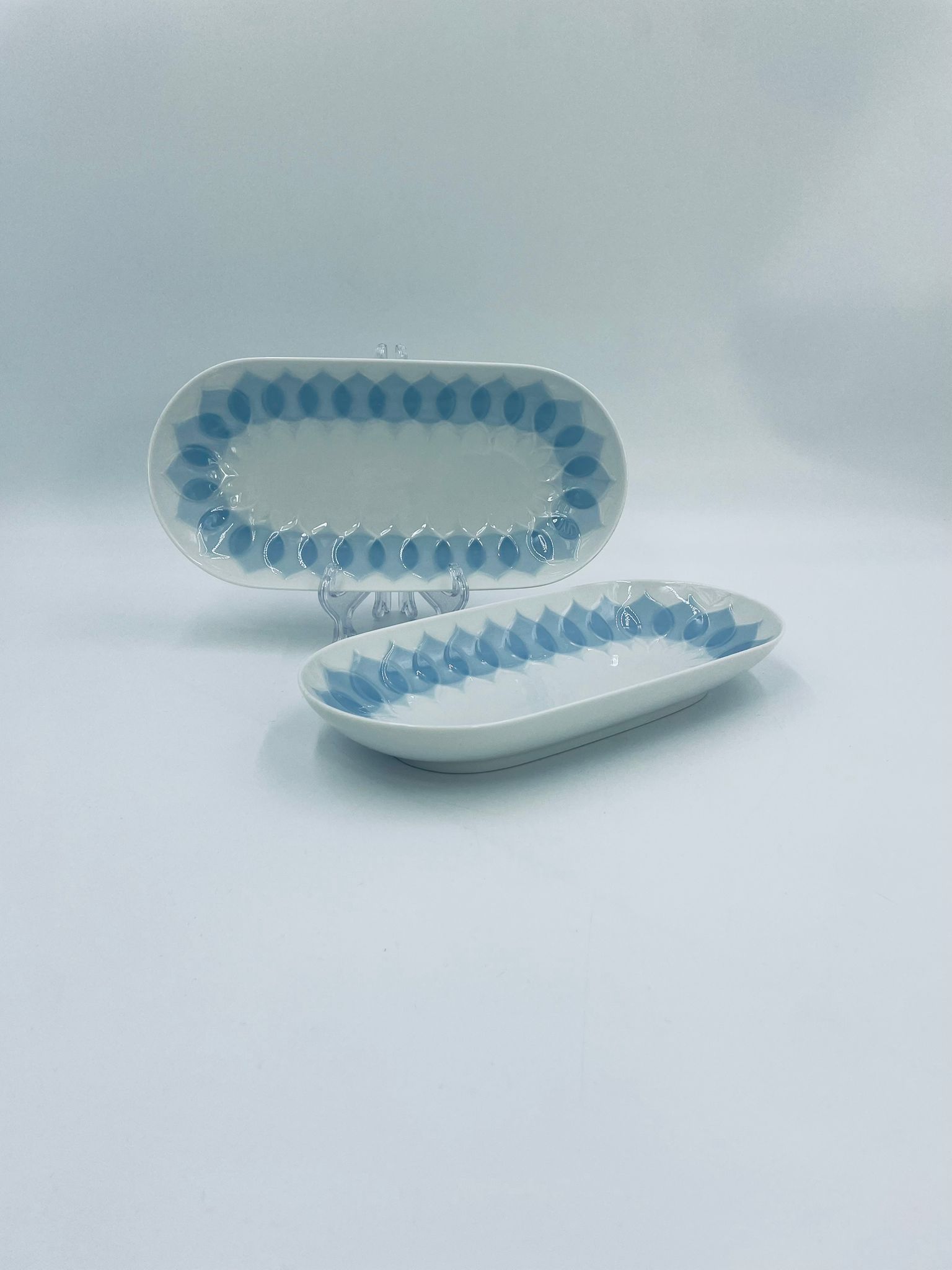 Patera dekoracyjna renomowanej wytwórni Rosenthal Studio Line z serii Lotus Blau , zaprojektowana przez duńskiego artystę Bjorna Wiinblada w 1964r, wykonana z najwyższej jakości białej porcelany. Patera ozdobiona wzorem „Blau”, charakteryzuje się delikatnym, geometrycznym motywem przypominający liście lotosu w niebieskim odcieniu.