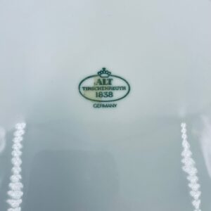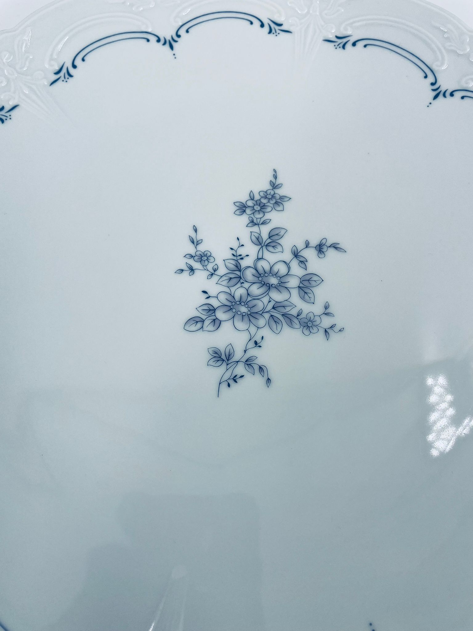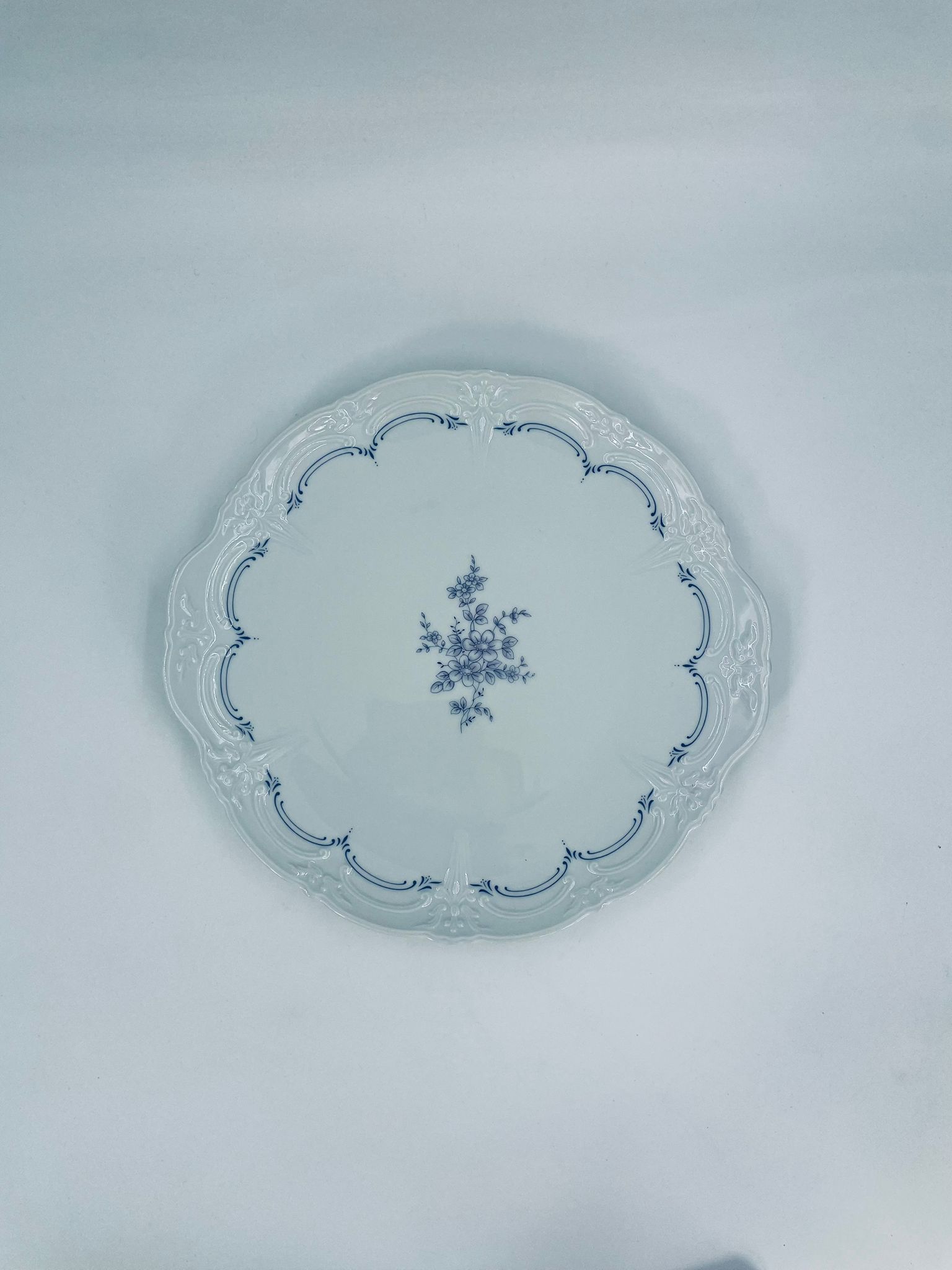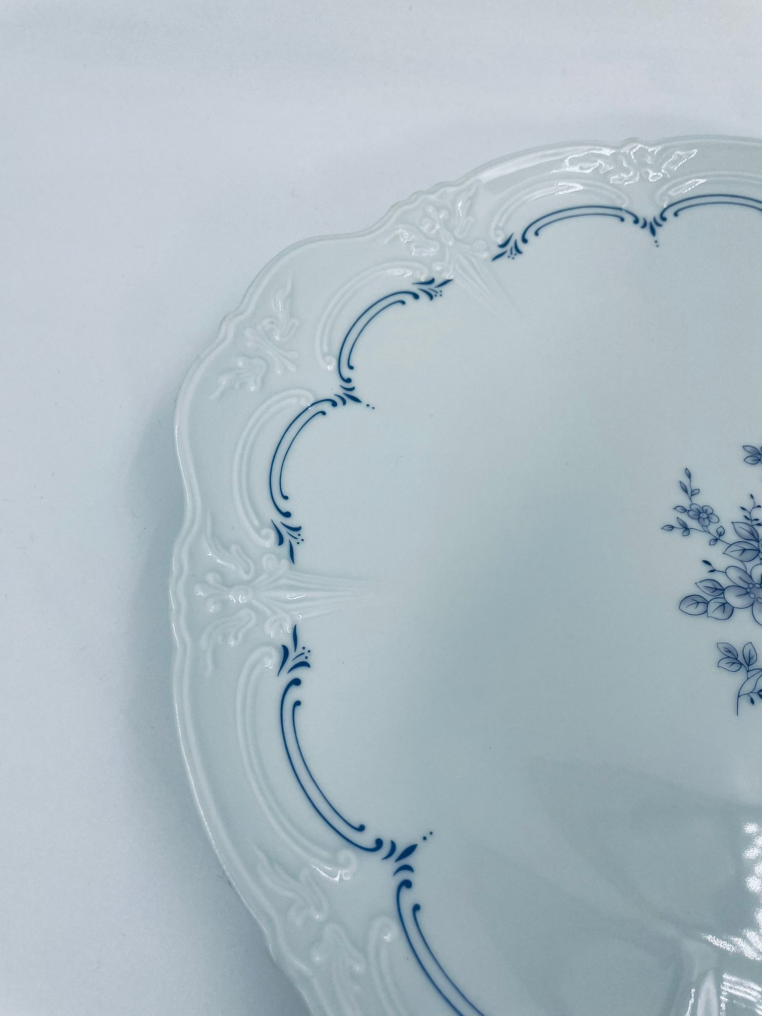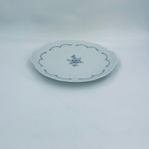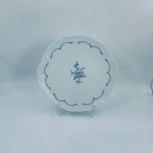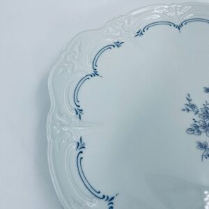 Patera wytwórni Tirschenreutch wykonana z wysokiej jakości białej porcelany. Patera we wzorze Fleur De Lis Blue, charakteryzująca się niebieskimi akcentami, kwiatowym wzorem, ozdobnymi reliefami i pofalowanym brzegiem.