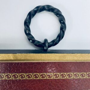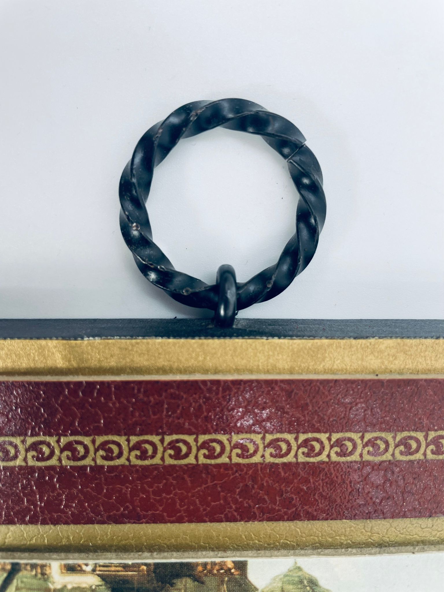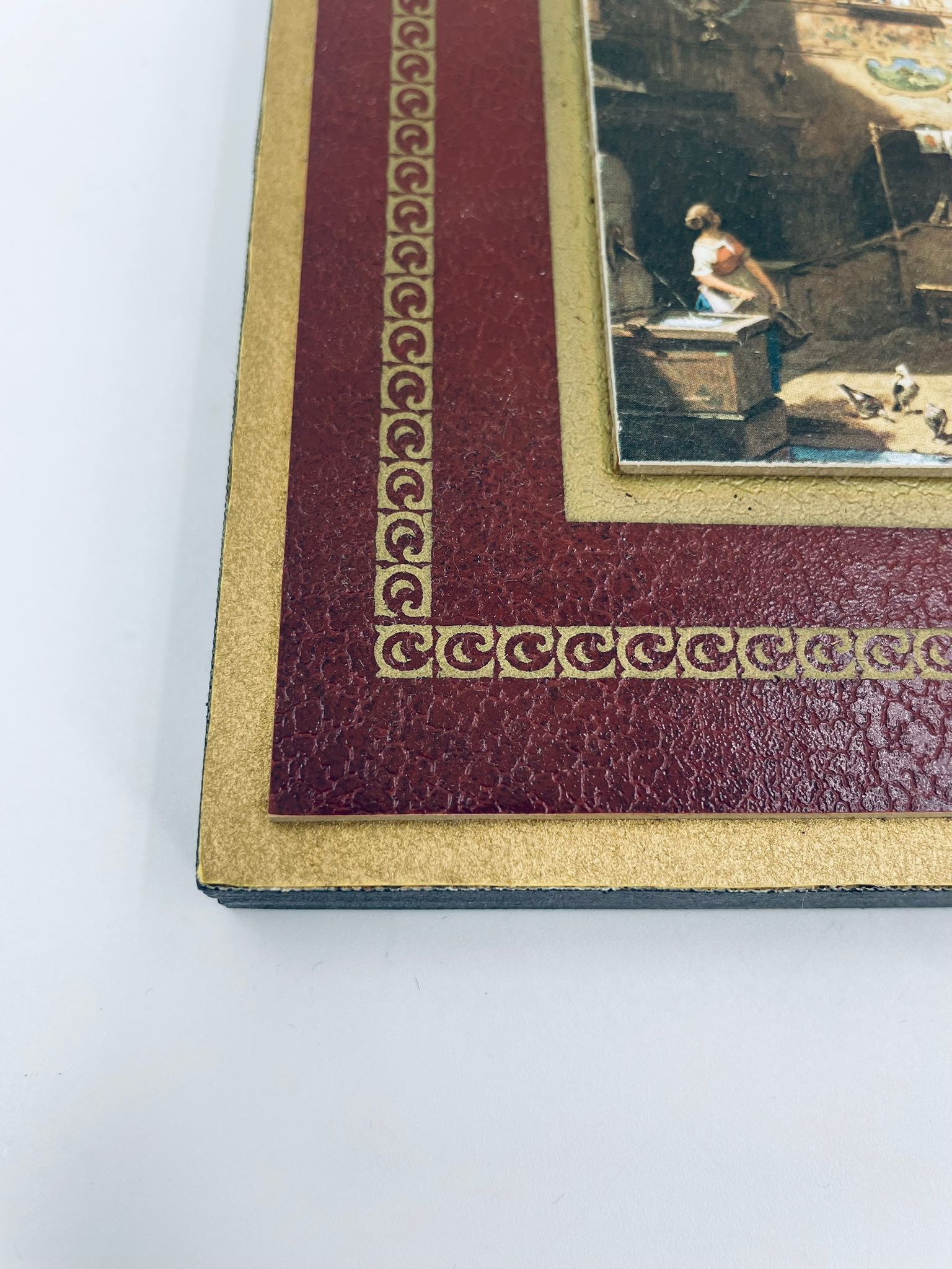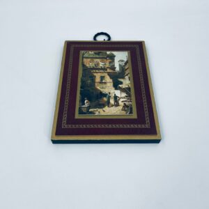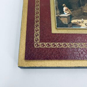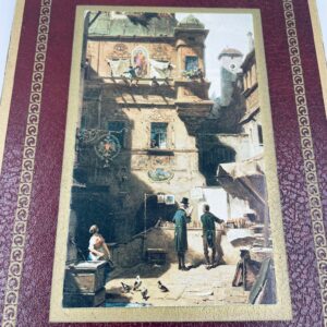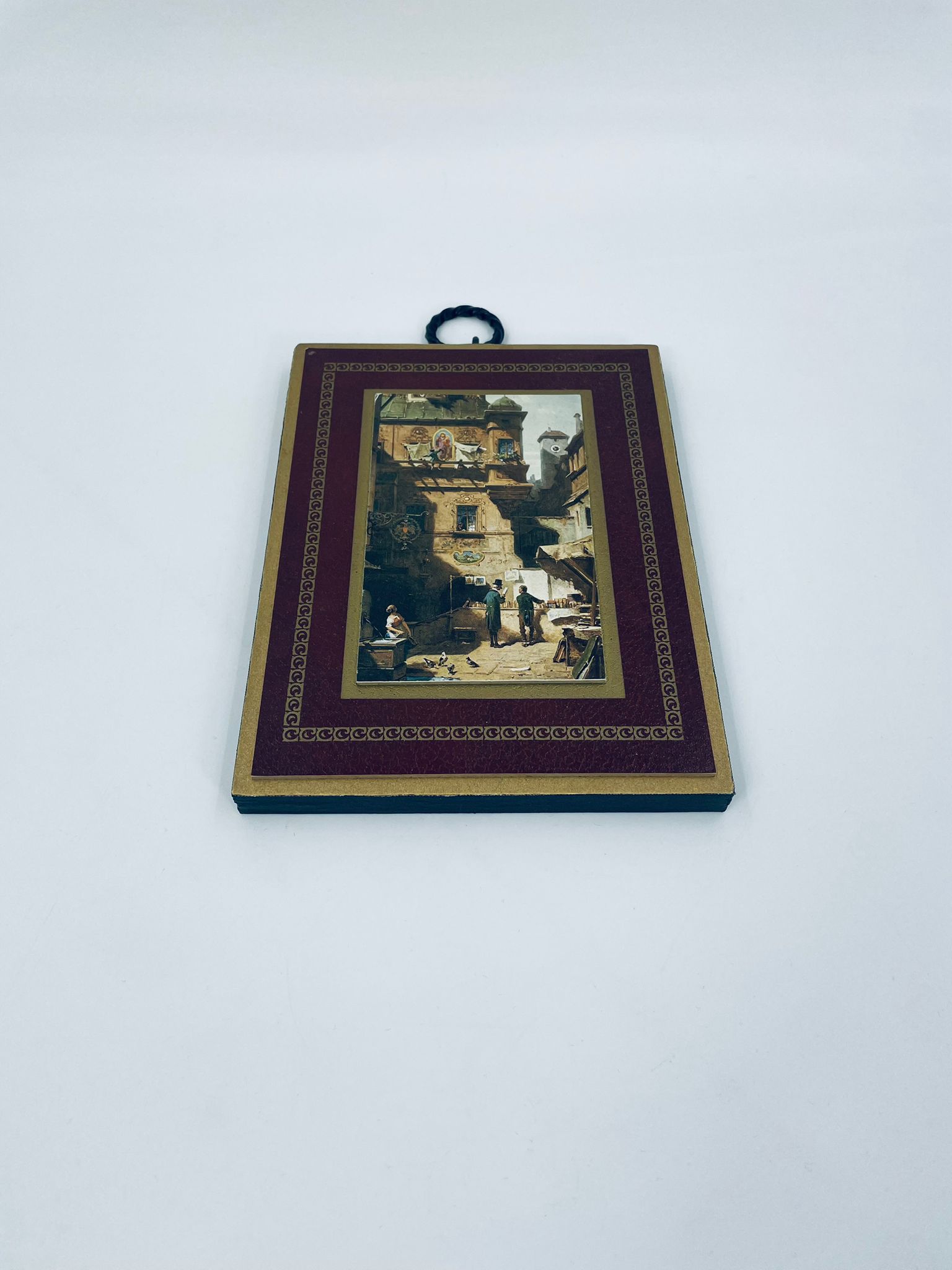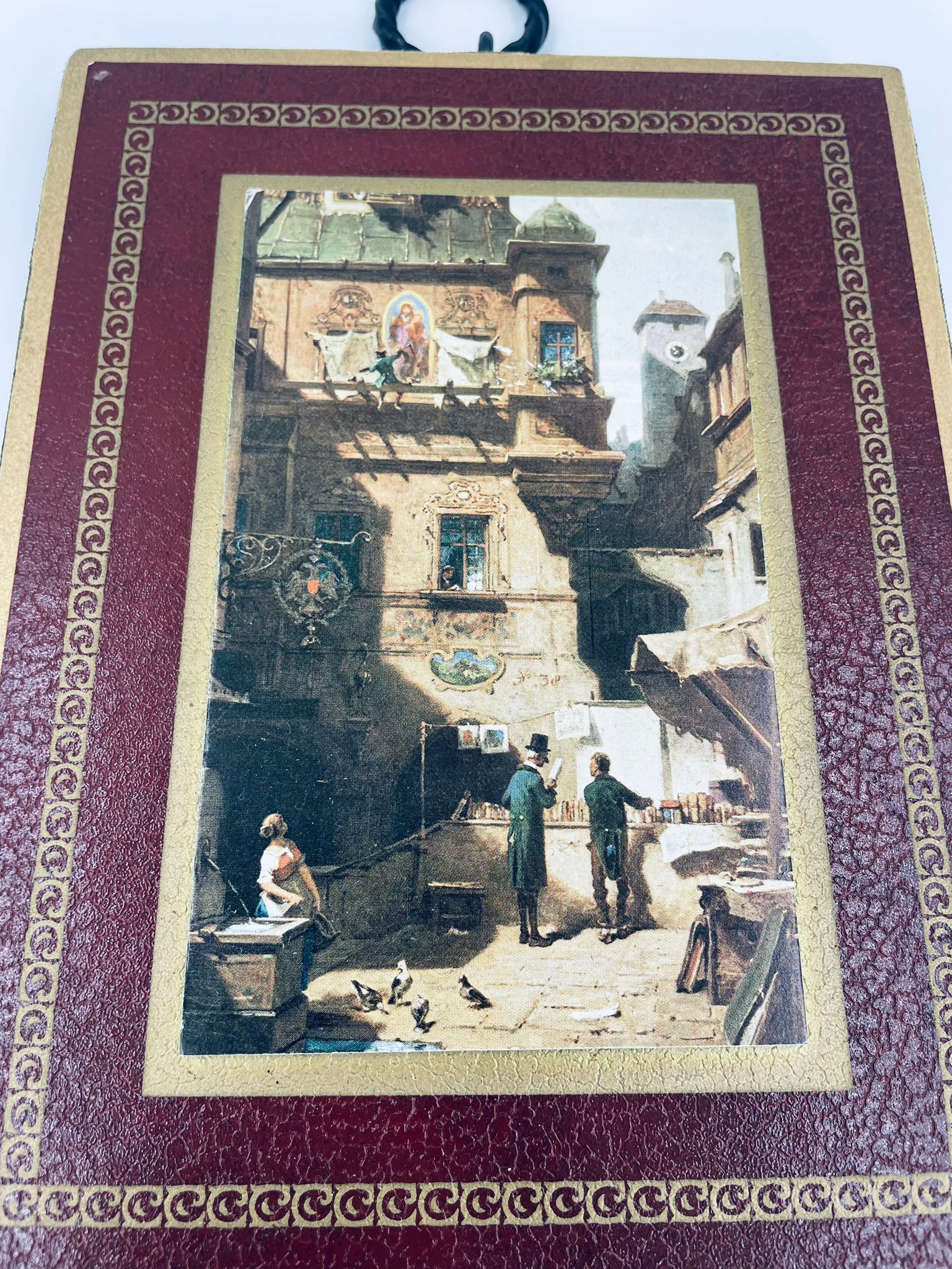 A picture by the German painter Carl Spitzweg (1808-1885) framed on a maroon background with gold patterns. The picture depicts a street scene with figures in traditional costumes and urban architecture.