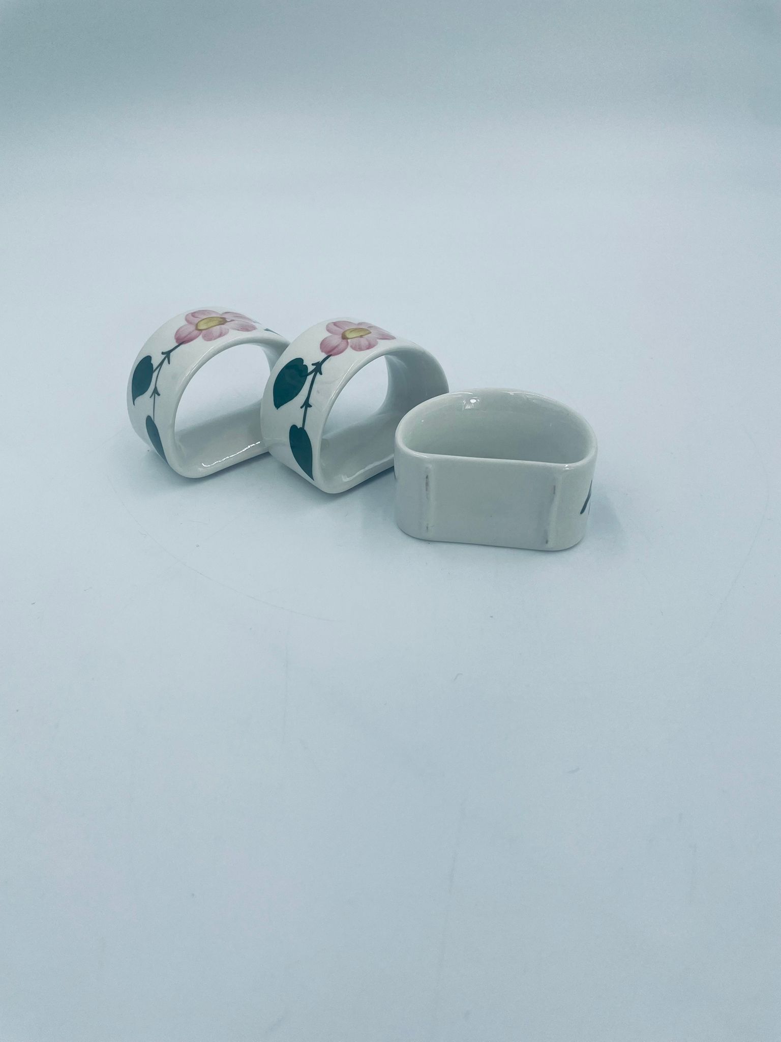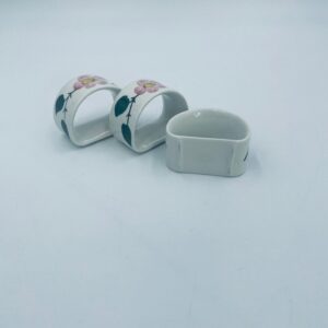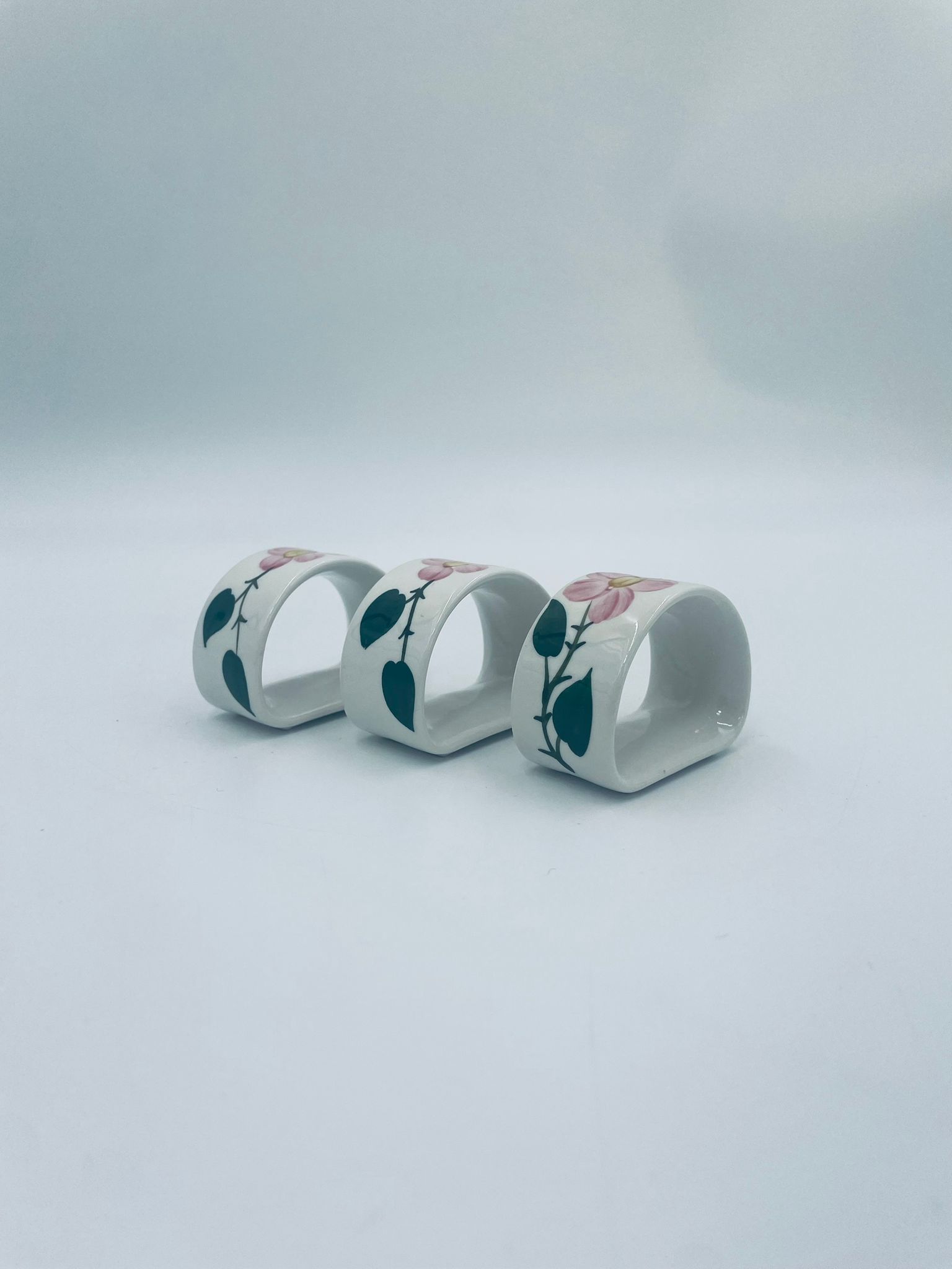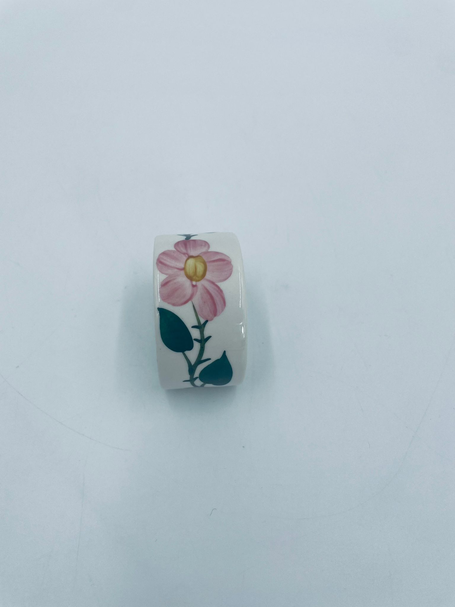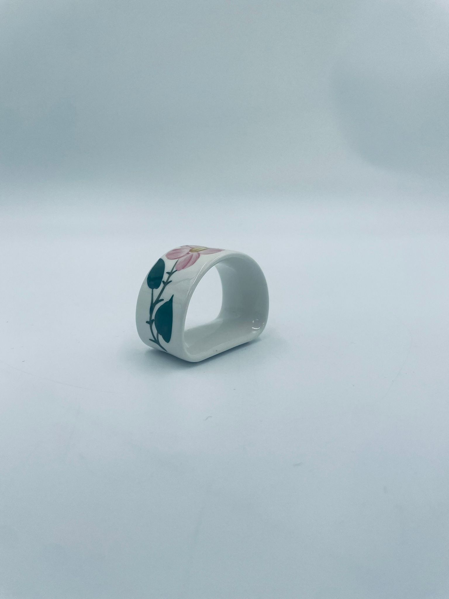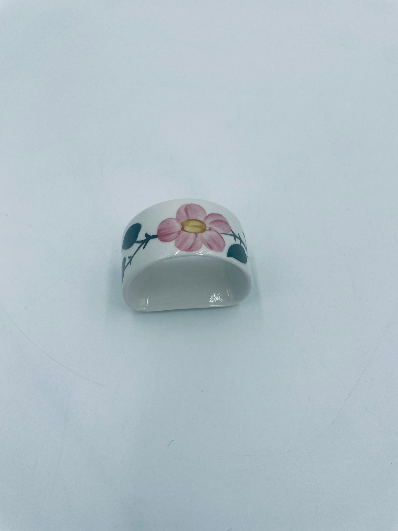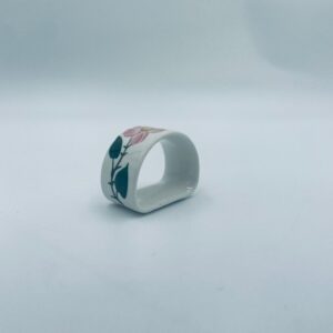 Pierścień na serwetkę wytwórni Villeroy & Boch z kolekcji Wildrose zaprojektowany w 1969r, wykonany z wysokiej jakości porcelany w kolorze ecru. Pierścień ozdobiony motywem ręcznie malowanych różowych kwiatów i zielonych liści.