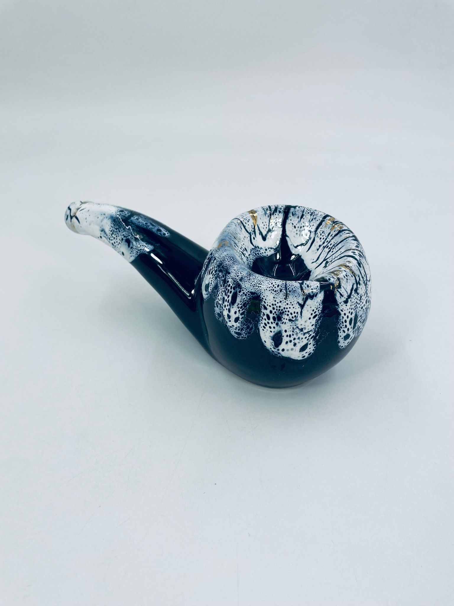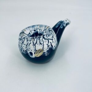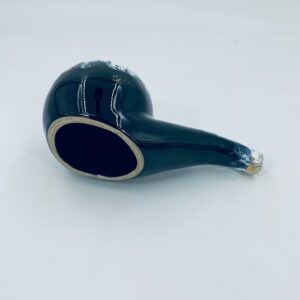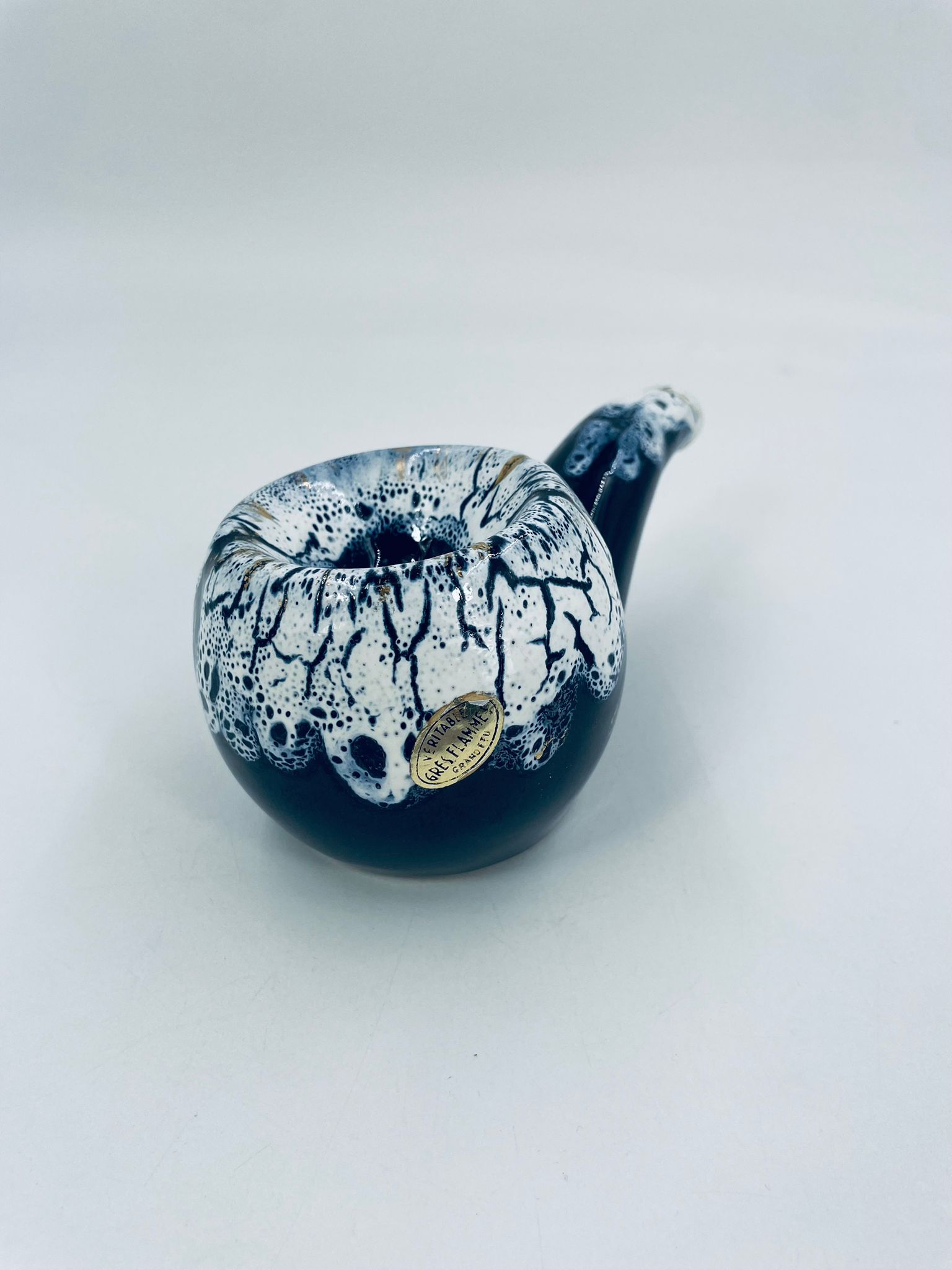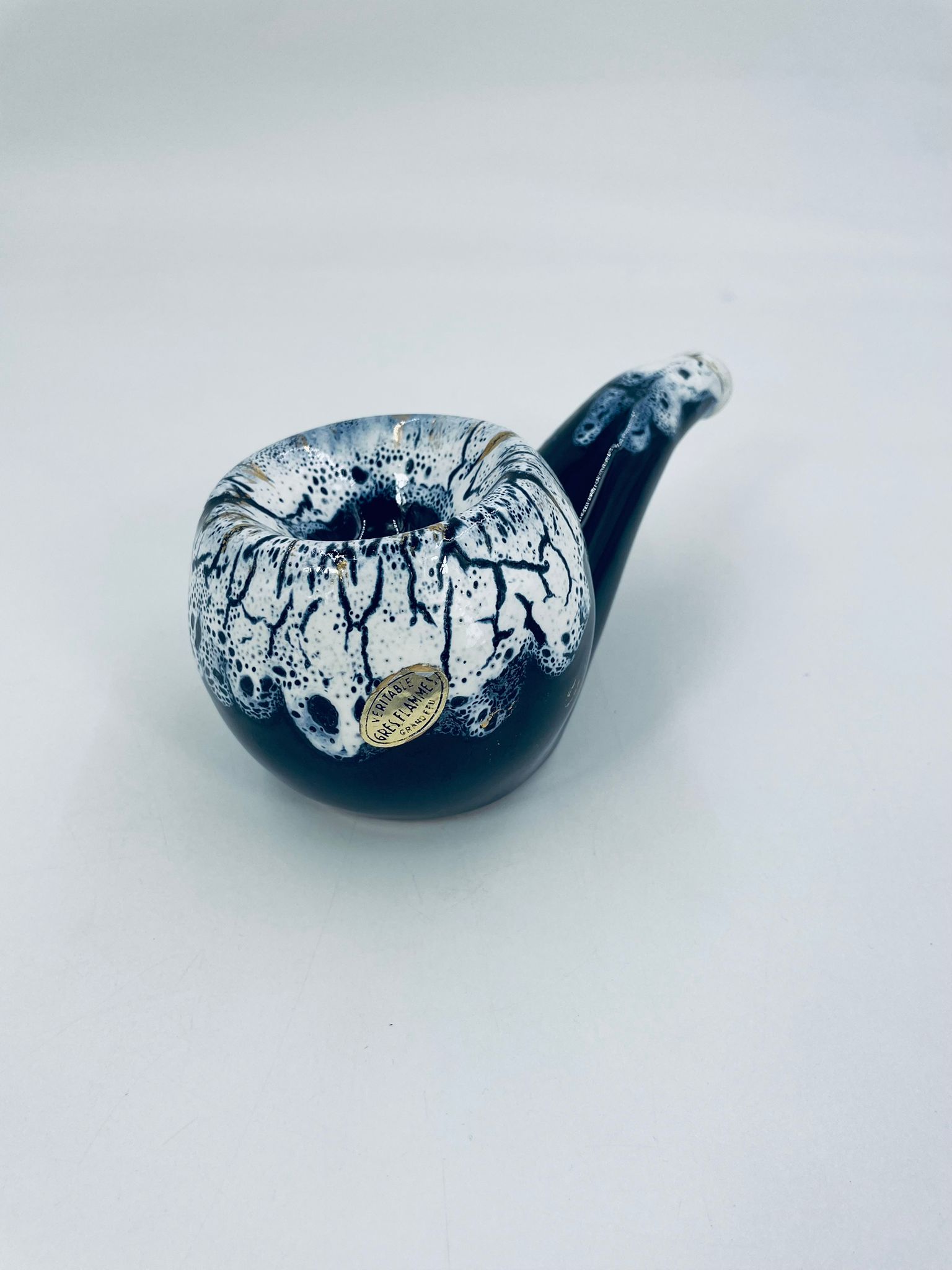 The ceramic saucer in the shape of a pipe serves as a stand for a pipe. The distinctive GRES FLAMME glaze indicates the ceramic's high-temperature firing technique, giving the effect of a cracked, glassy surface.