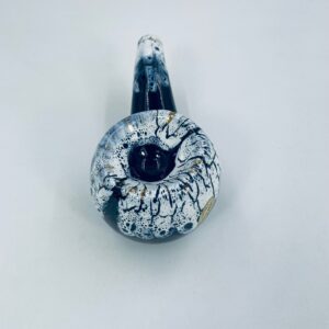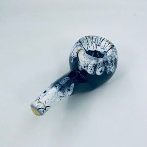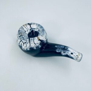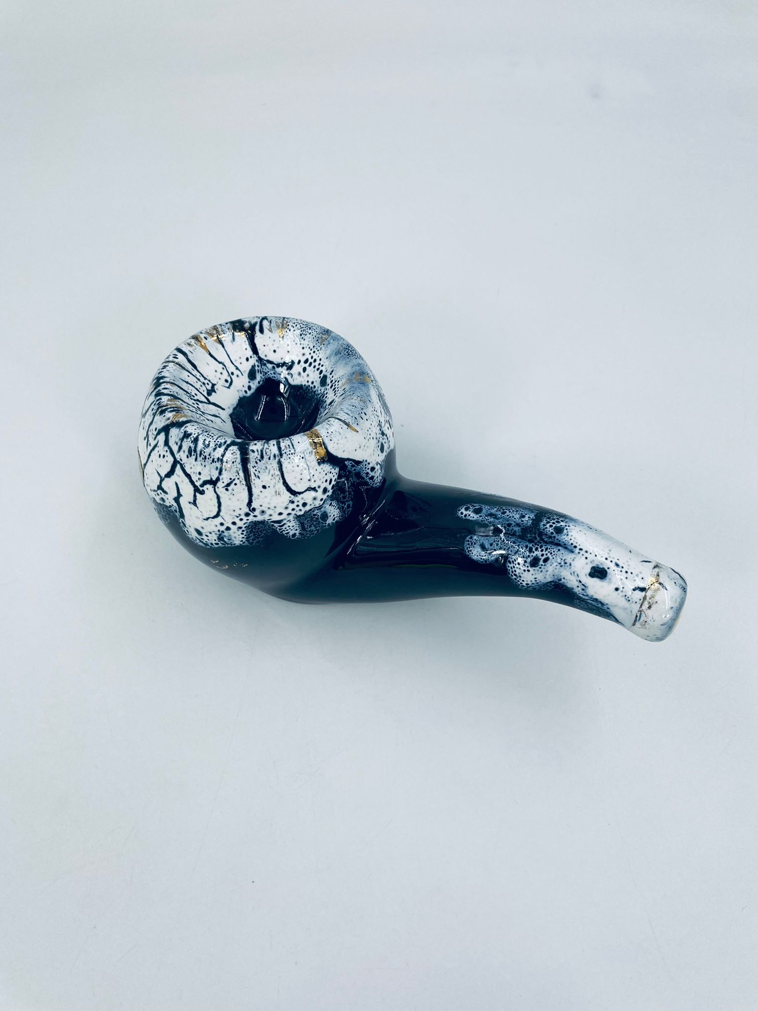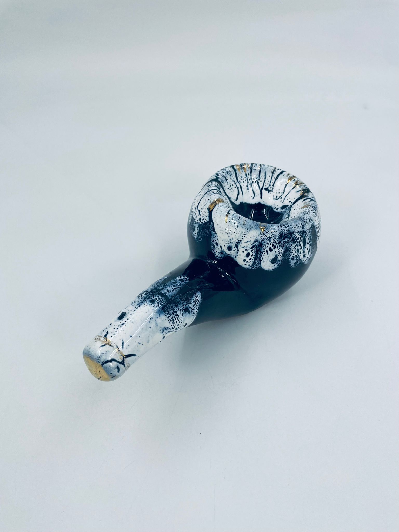 The ceramic saucer in the shape of a pipe serves as a stand for a pipe. The distinctive GRES FLAMME glaze indicates the ceramic's high-temperature firing technique, giving the effect of a cracked, glassy surface.