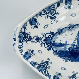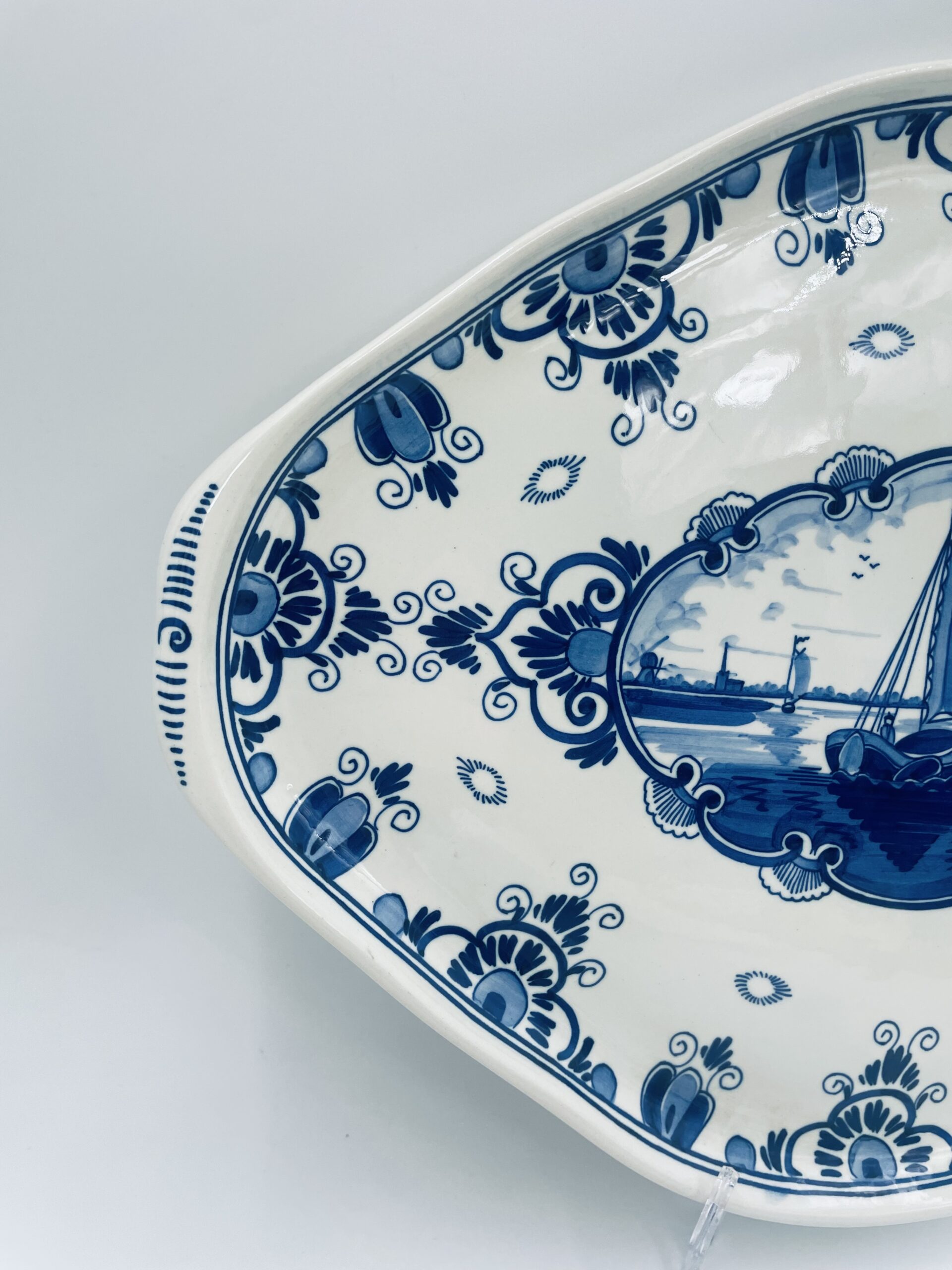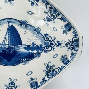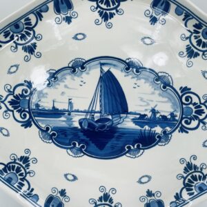 Antique Dutch Delft ceramic serving platter by Erven Lucas Bols finished with cobalt decoration and in the centre depicting a sailing boat sailing away.
