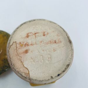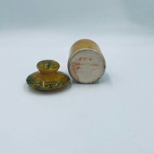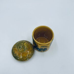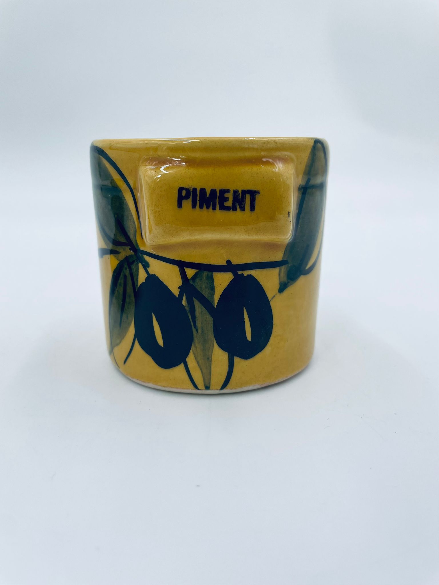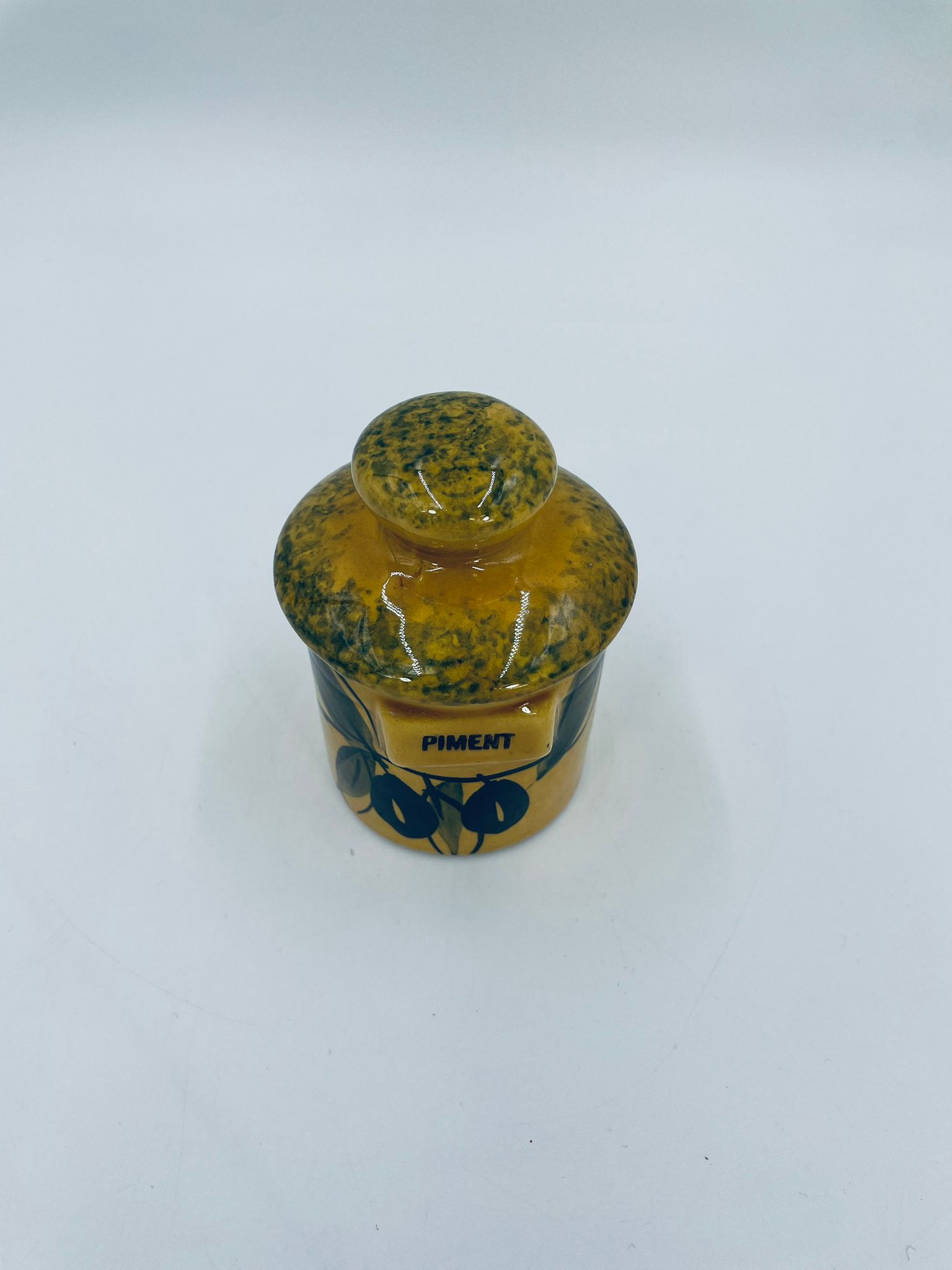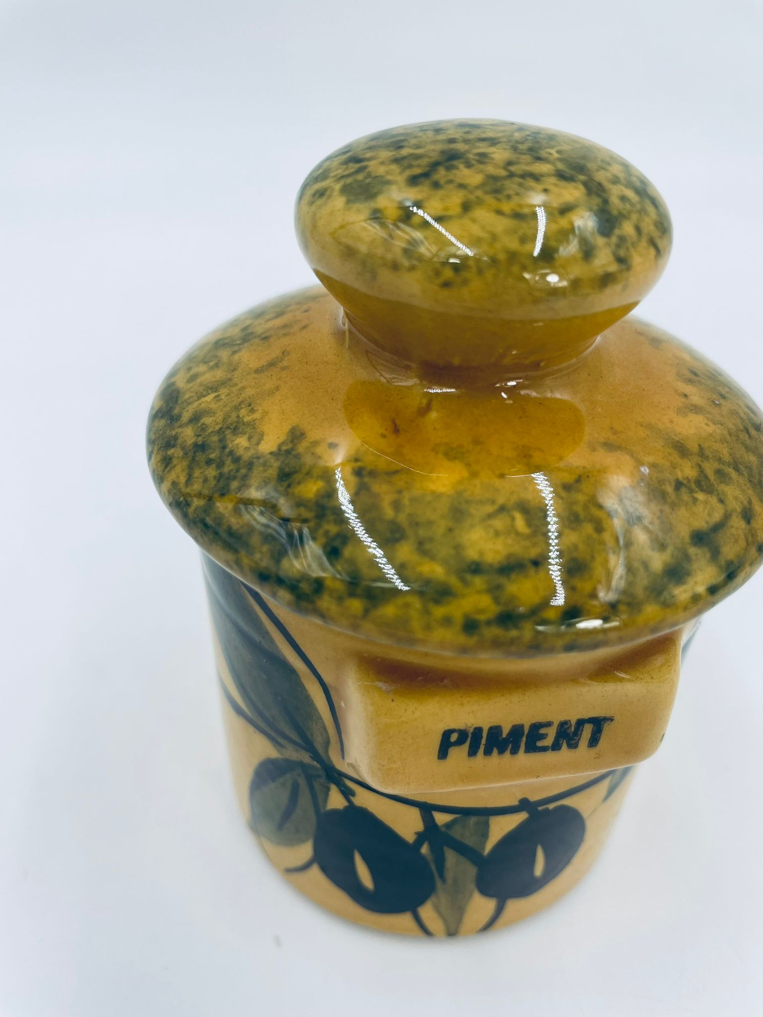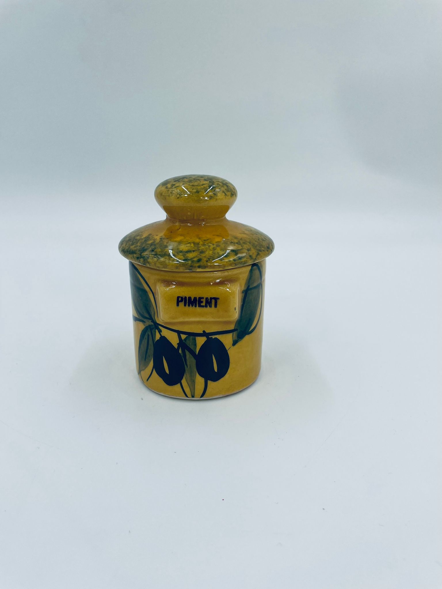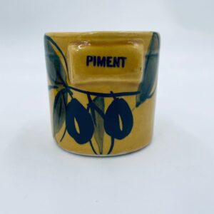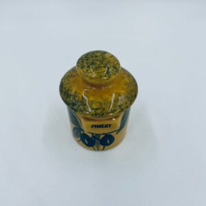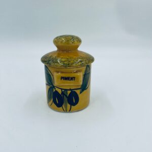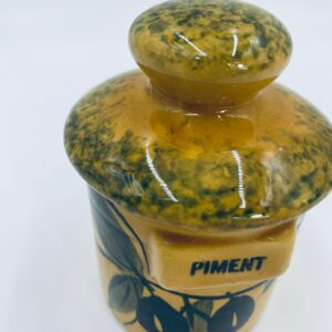 Pojemnik kuchenny na przyprawę F.P.P Vallauris w stylu Vintage, wykonany z wysokiej jakości szkliwionej ceramiki. Pojemnik w musztardowym kolorze z ręcznie malowanym wzorem liści i napisem „Piment”, posiada przykrycie z zielonymi akcentami.