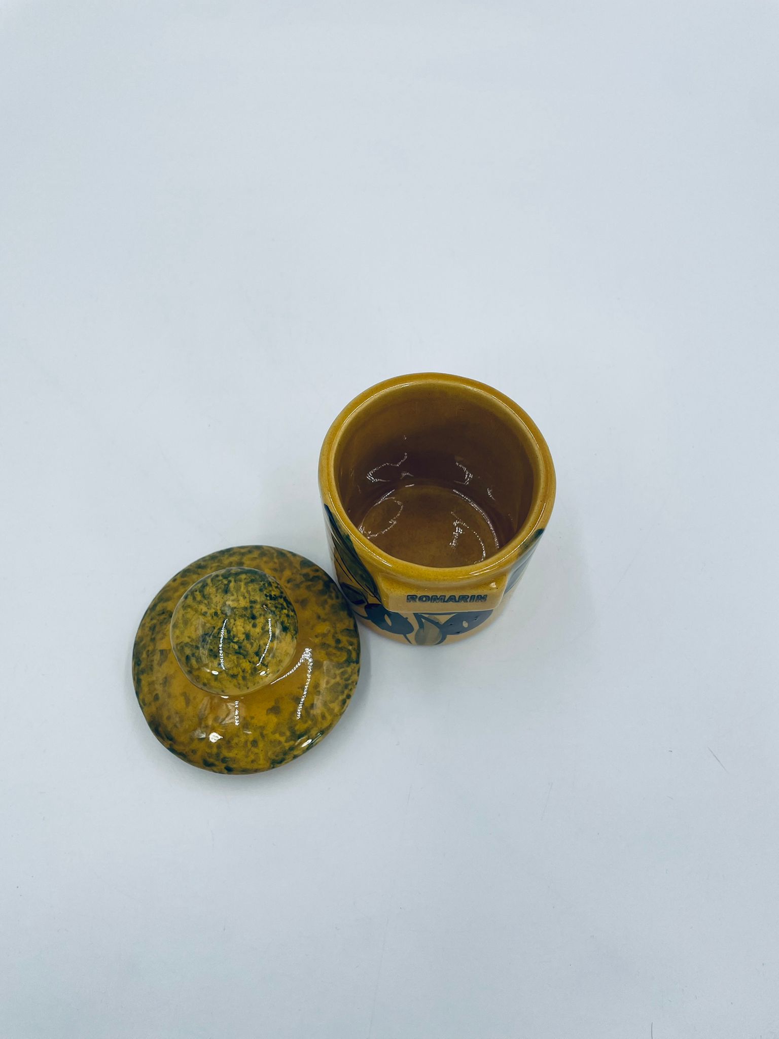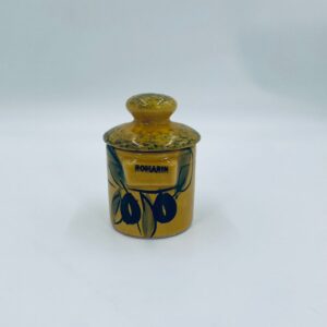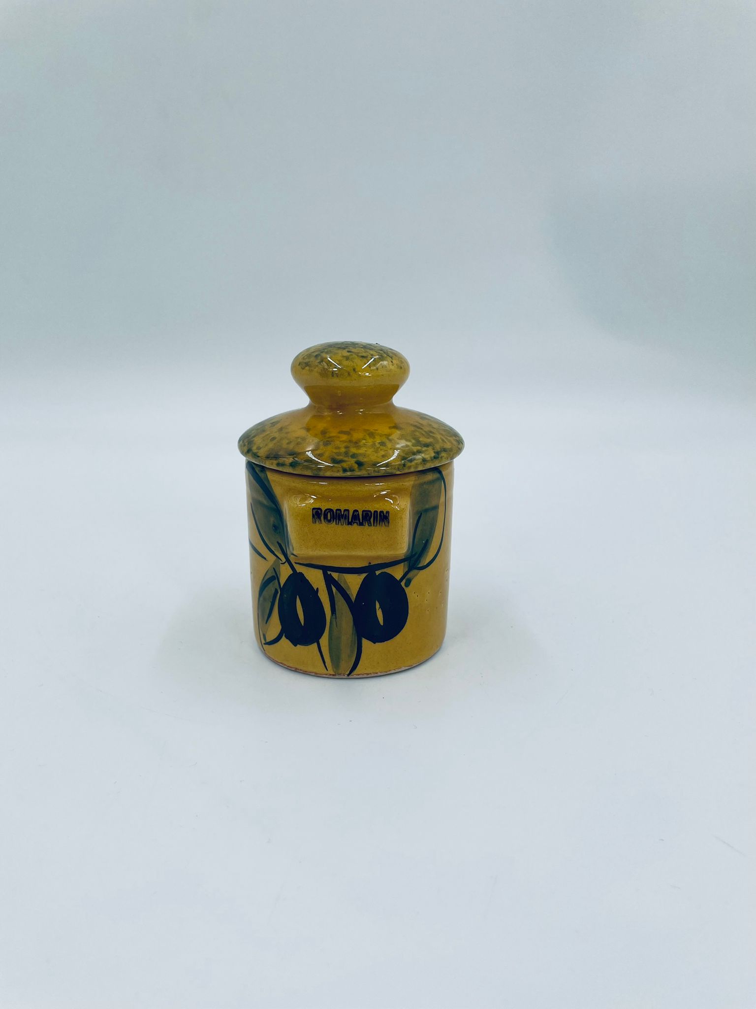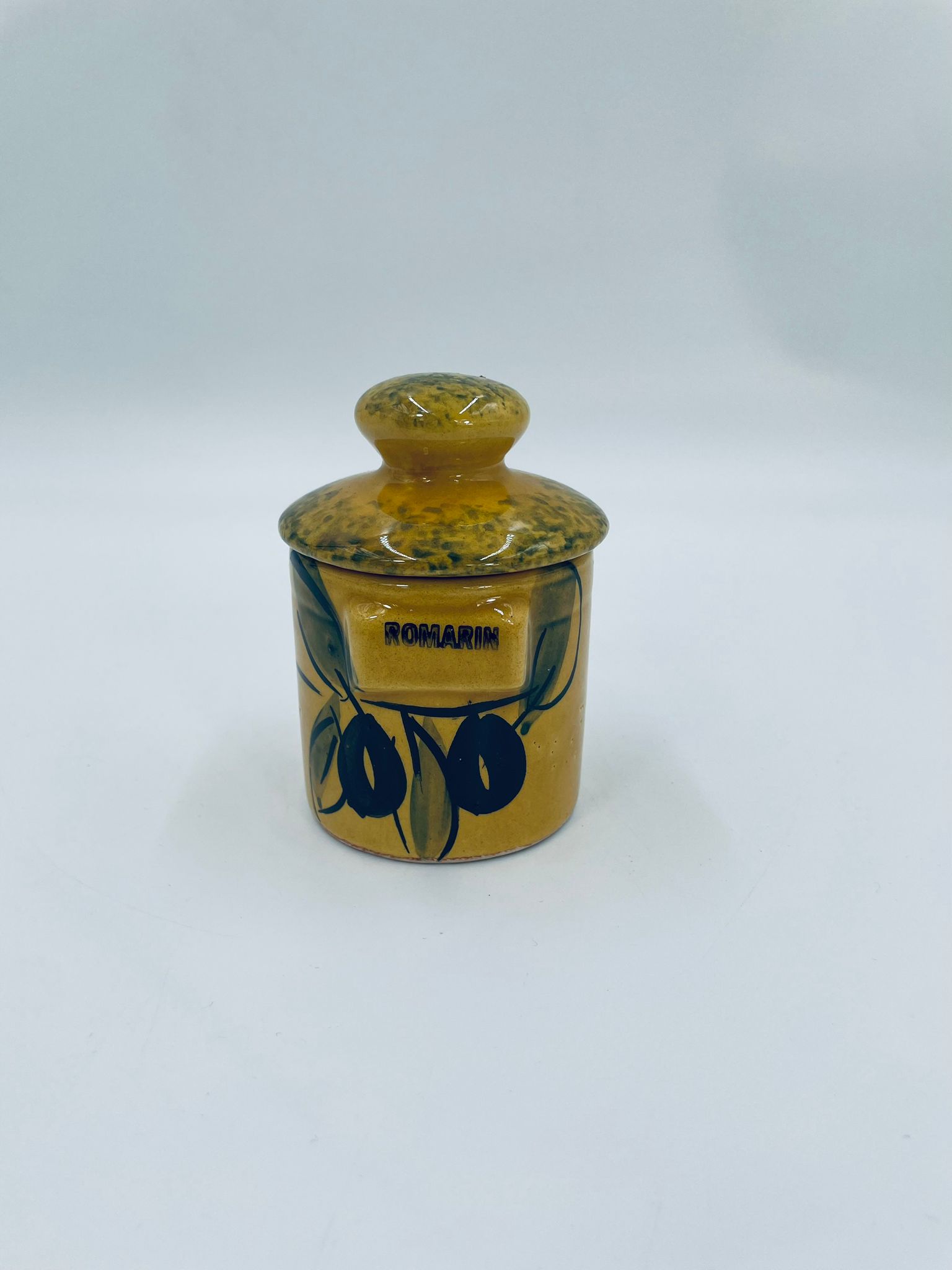 Pojemnik kuchenny na przyprawę F.P.P Vallauris w stylu Vintage, wykonany z wysokiej jakości szkliwionej ceramiki. Pojemnik w musztardowym kolorze z ręcznie malowanym wzorem liści i napisem „Romarin”, posiada przykrycie z zielonymi akcentami.