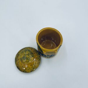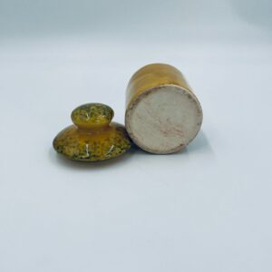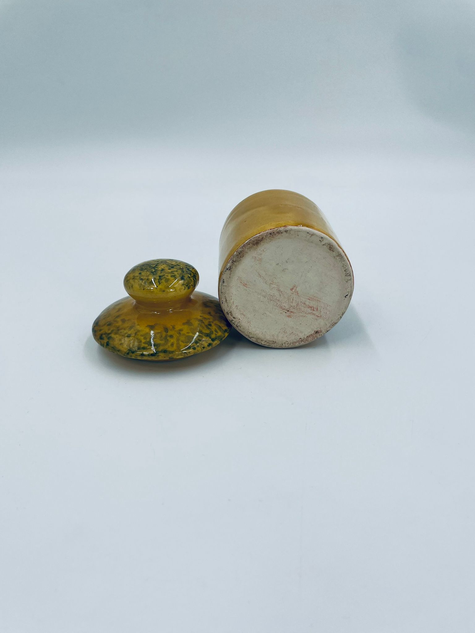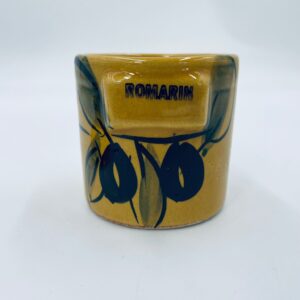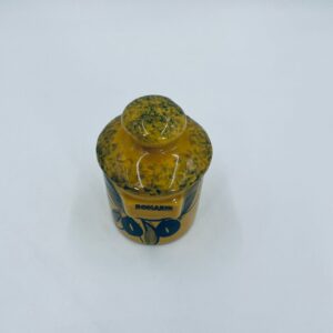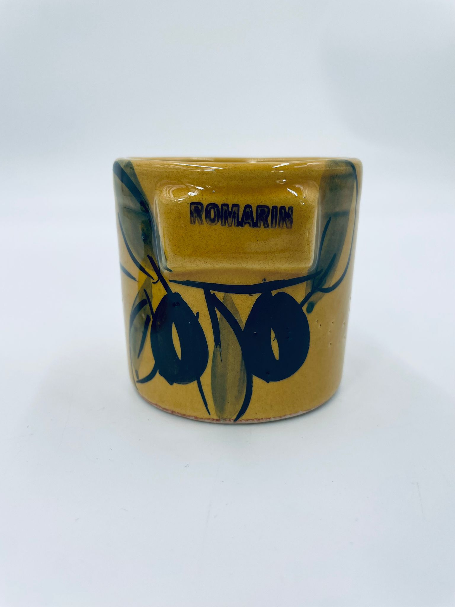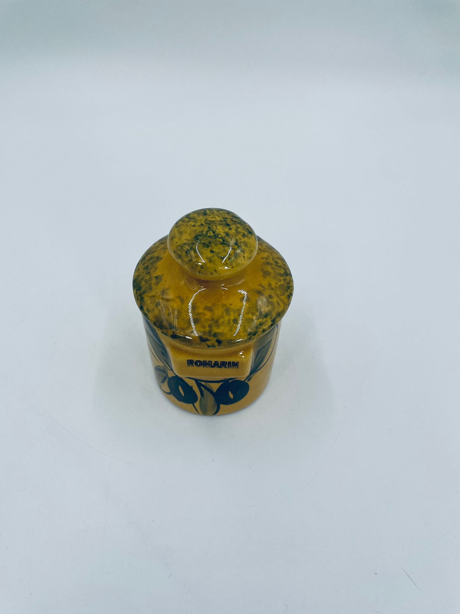 Pojemnik kuchenny na przyprawę F.P.P Vallauris w stylu Vintage, wykonany z wysokiej jakości szkliwionej ceramiki. Pojemnik w musztardowym kolorze z ręcznie malowanym wzorem liści i napisem „Romarin”, posiada przykrycie z zielonymi akcentami.