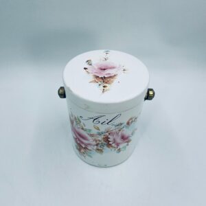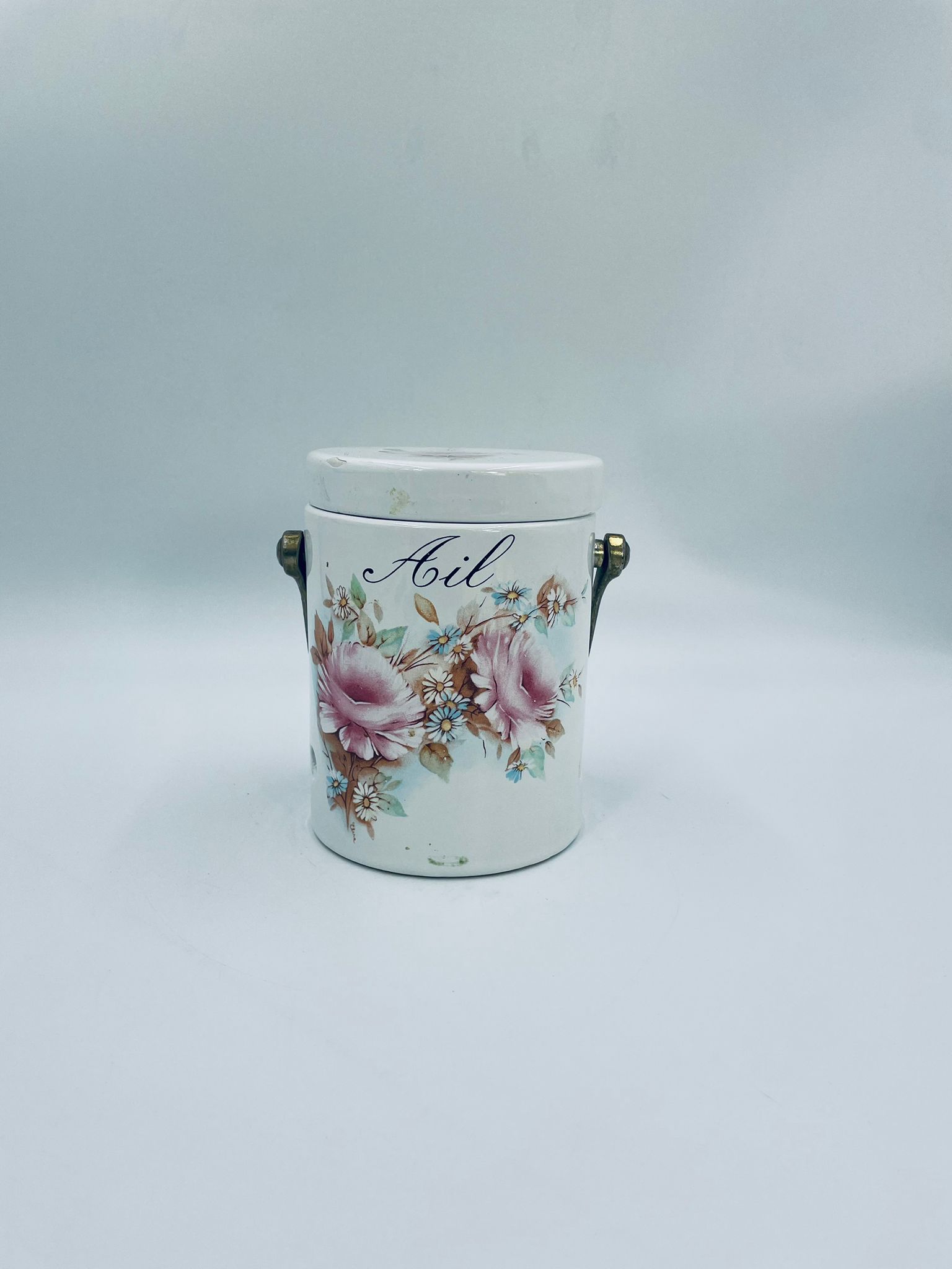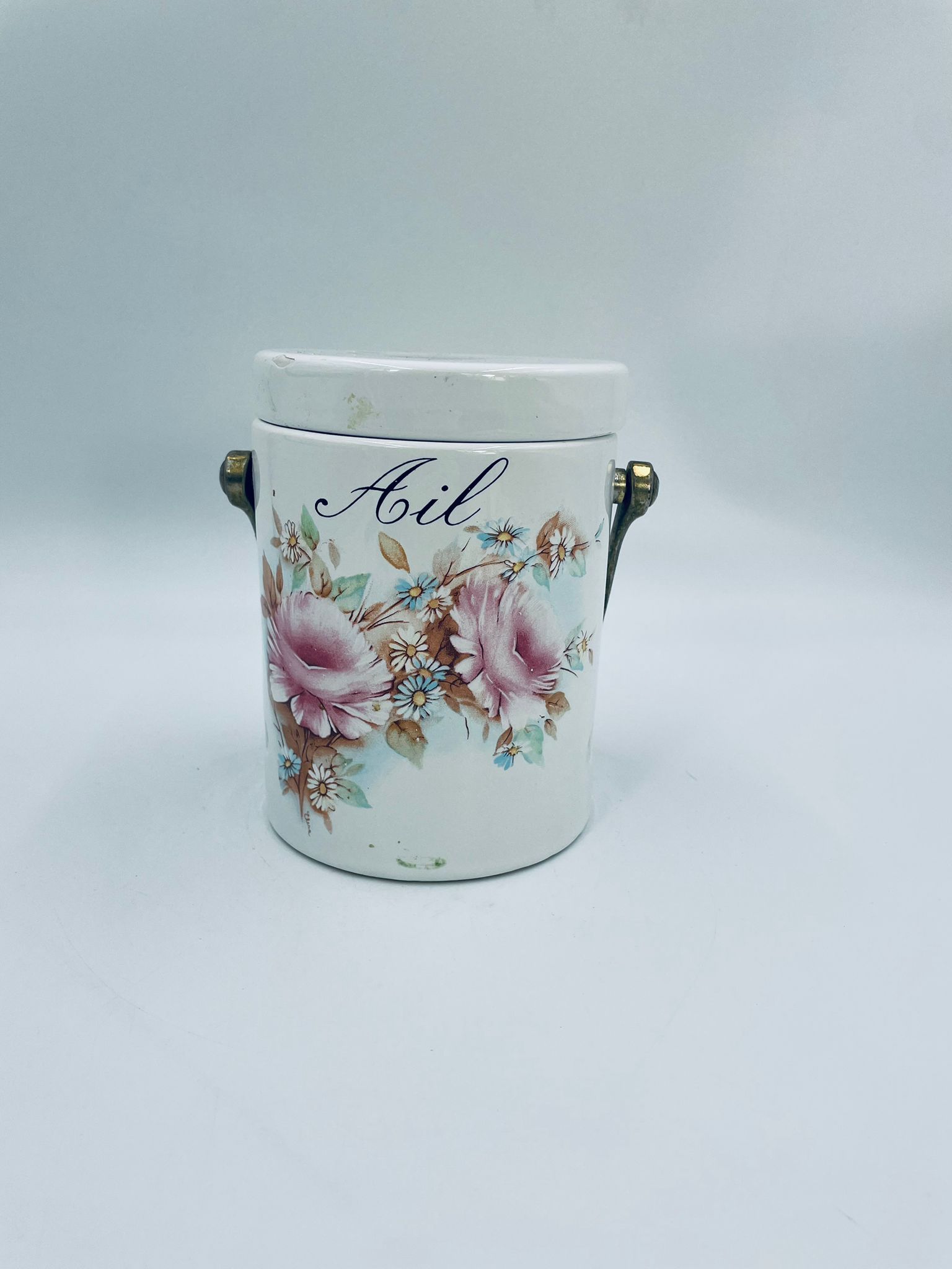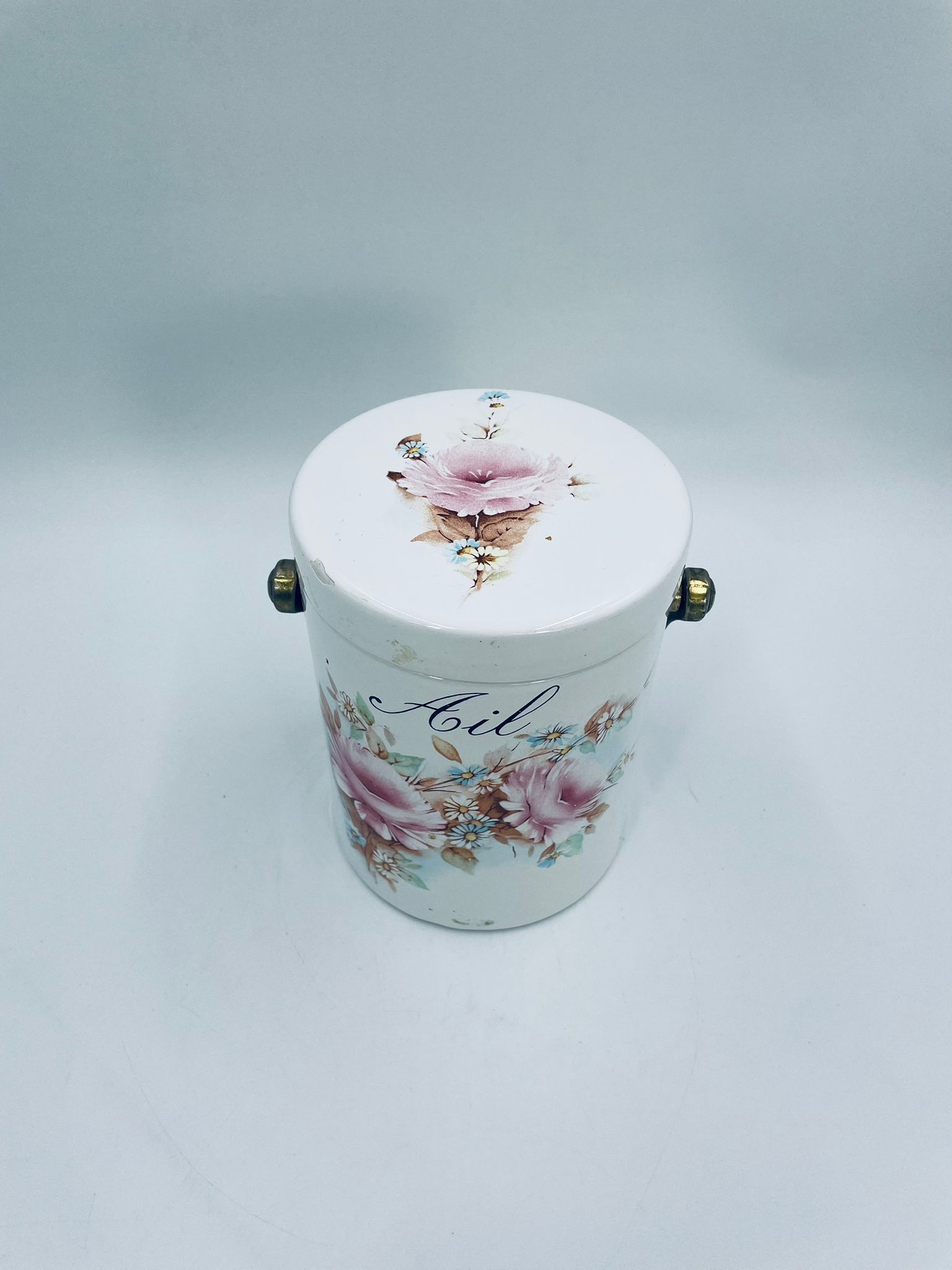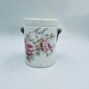 Pojemnik z pokrywą w stylu Vintage, wykonany z wysokiej jakości ceramiki. Pojemnik w białym kolorze, ozdobiony kwiatowym wzorem. Pojemnik posiada pokrywę oraz metalowy, złocony uchwyt i małe otwory wentylacyjne, które zapewniają cyrkulację powietrza i opóźniają kiełkowanie. Na pojemniku widnieje napis „Ail” -czosnek. Pojemnik służy do przechowywania główek czosnku.