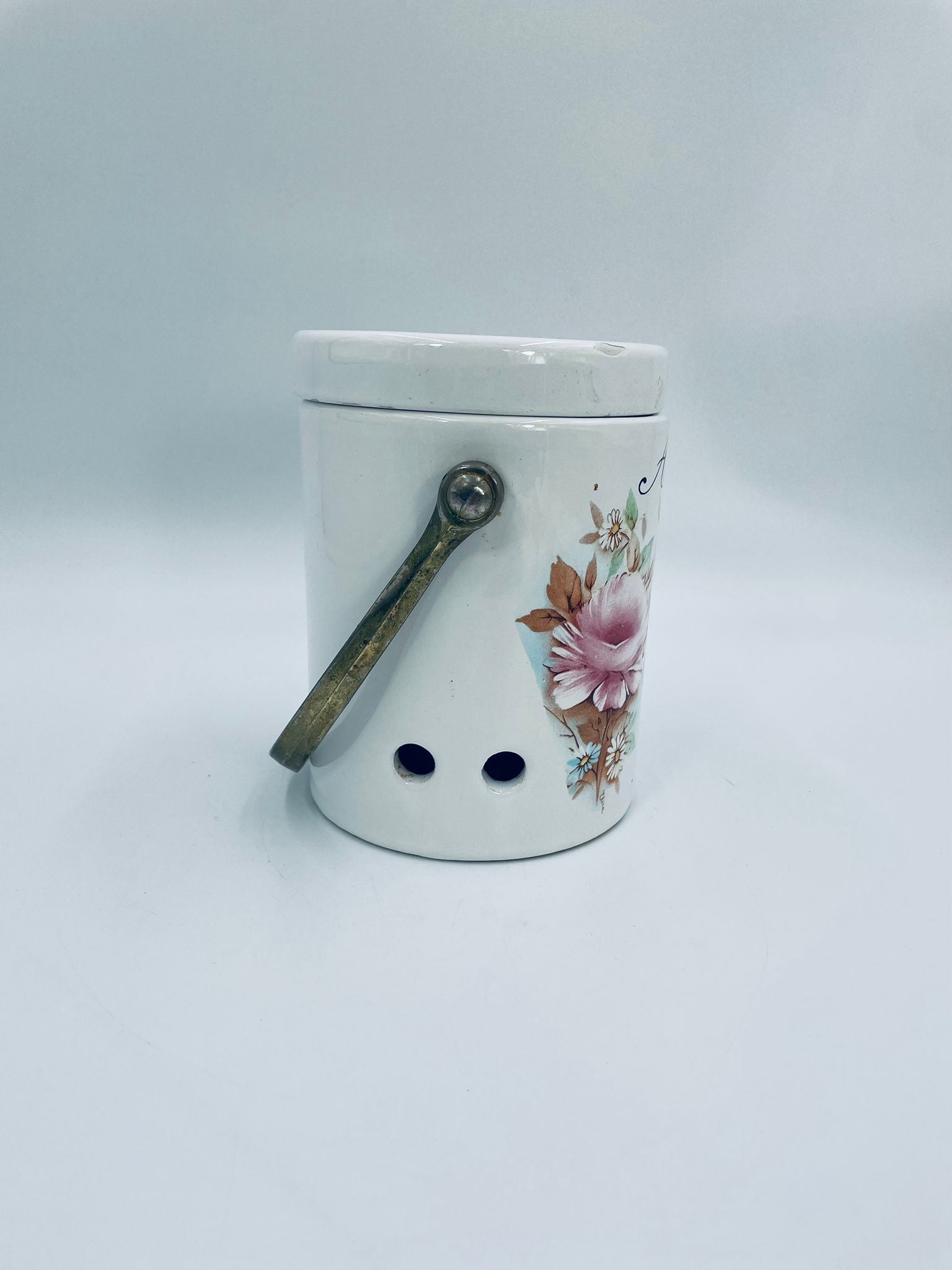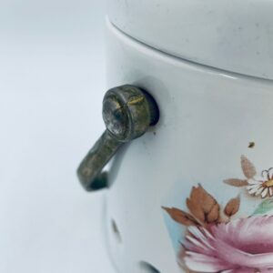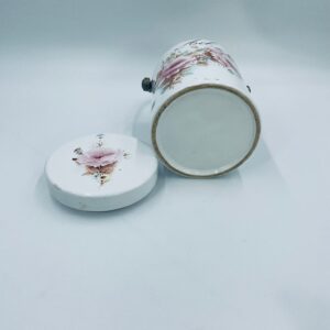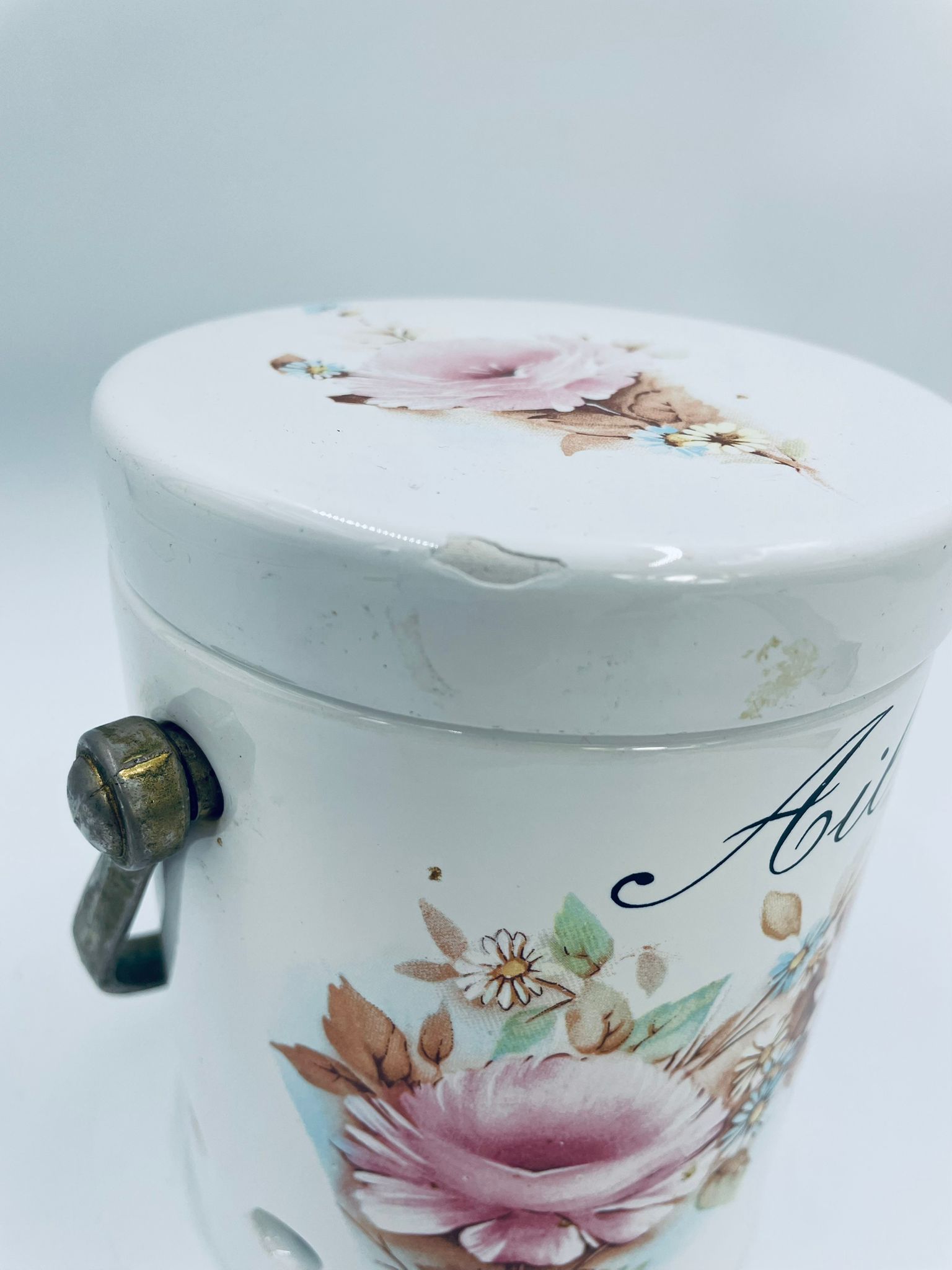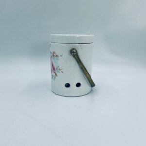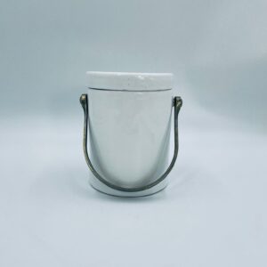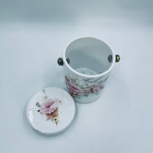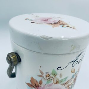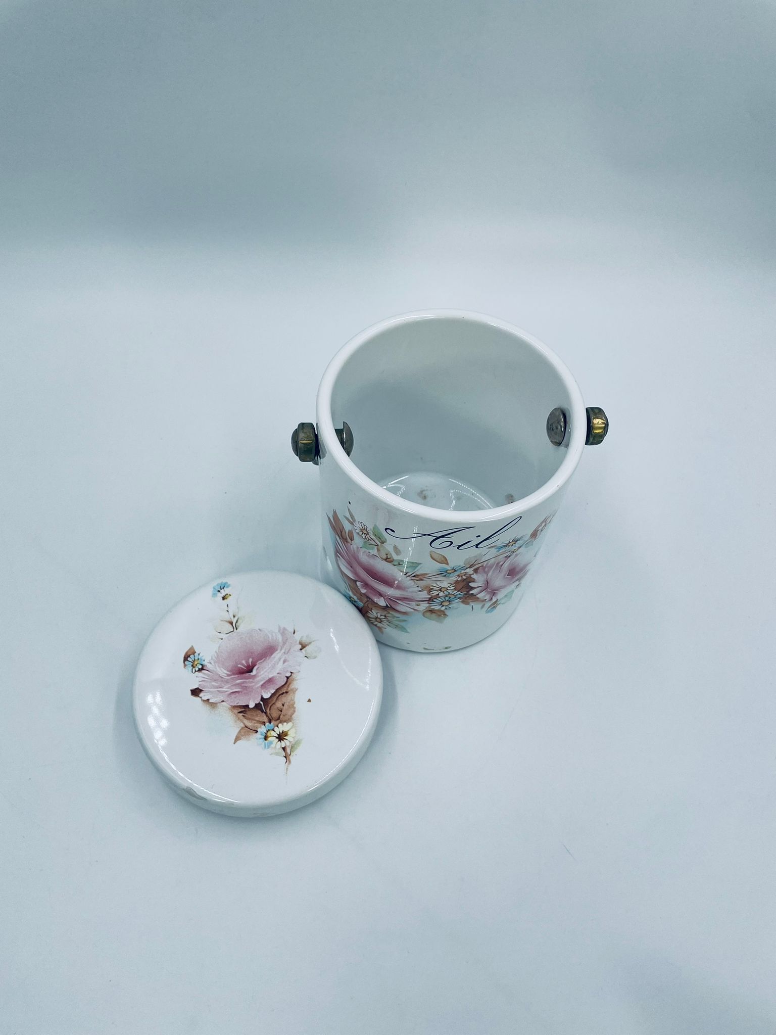 Pojemnik z pokrywą w stylu Vintage, wykonany z wysokiej jakości ceramiki. Pojemnik w białym kolorze, ozdobiony kwiatowym wzorem. Pojemnik posiada pokrywę oraz metalowy, złocony uchwyt i małe otwory wentylacyjne, które zapewniają cyrkulację powietrza i opóźniają kiełkowanie. Na pojemniku widnieje napis „Ail” -czosnek. Pojemnik służy do przechowywania główek czosnku.