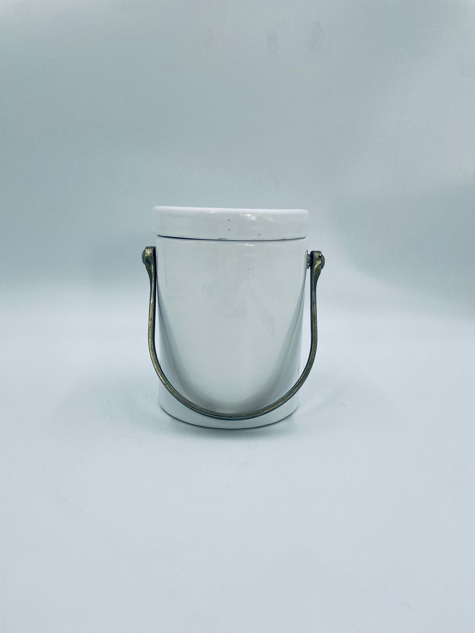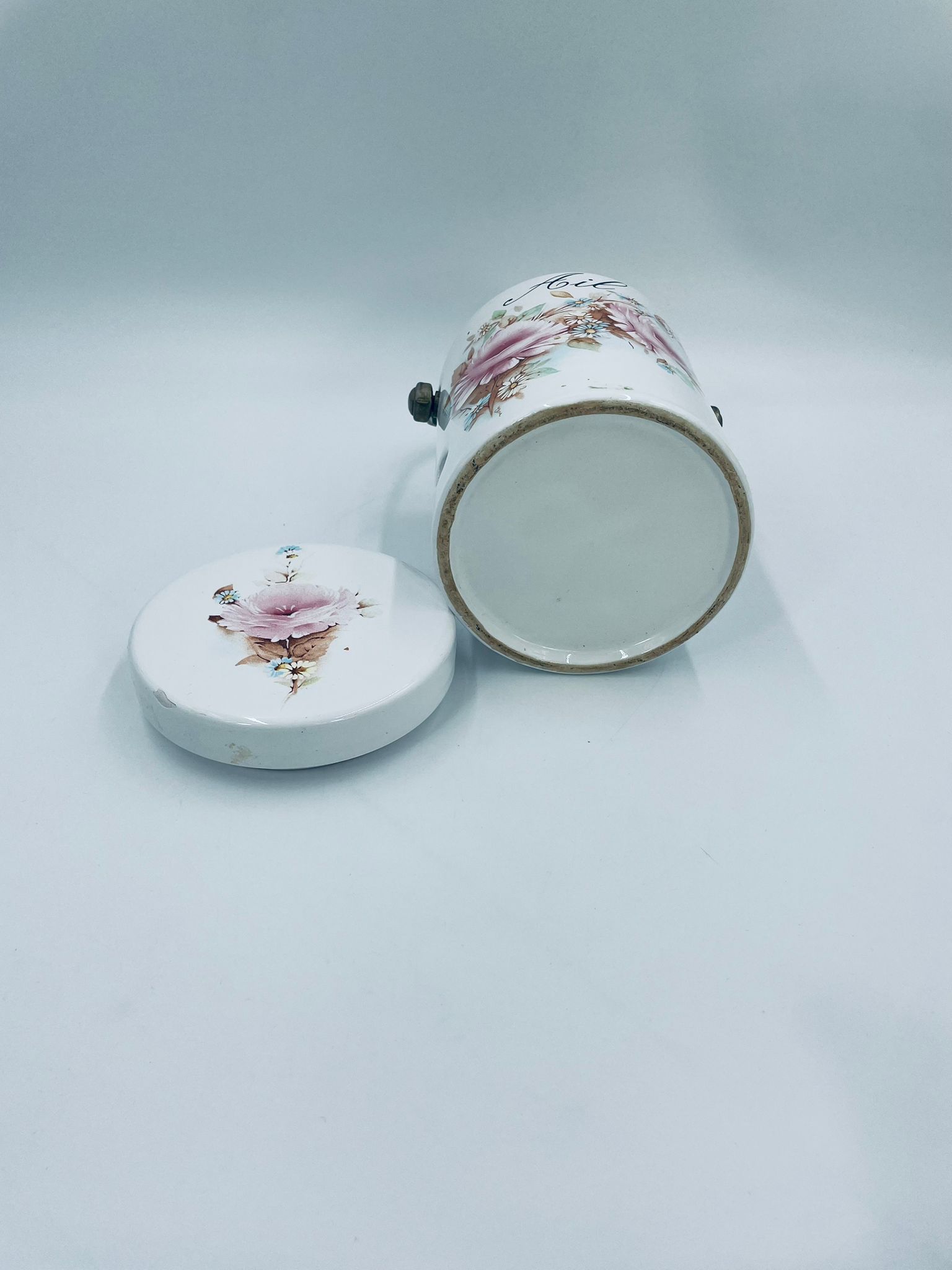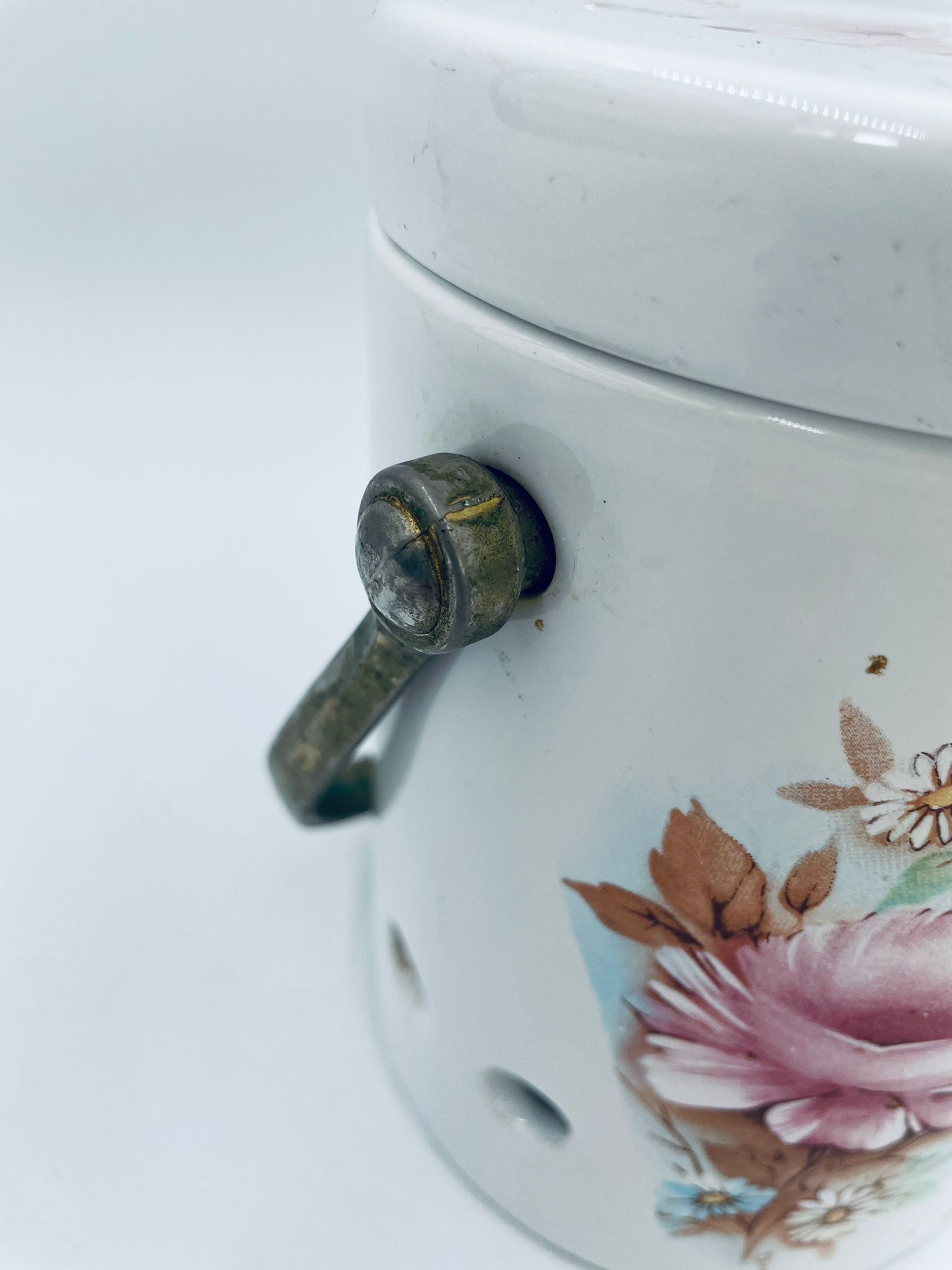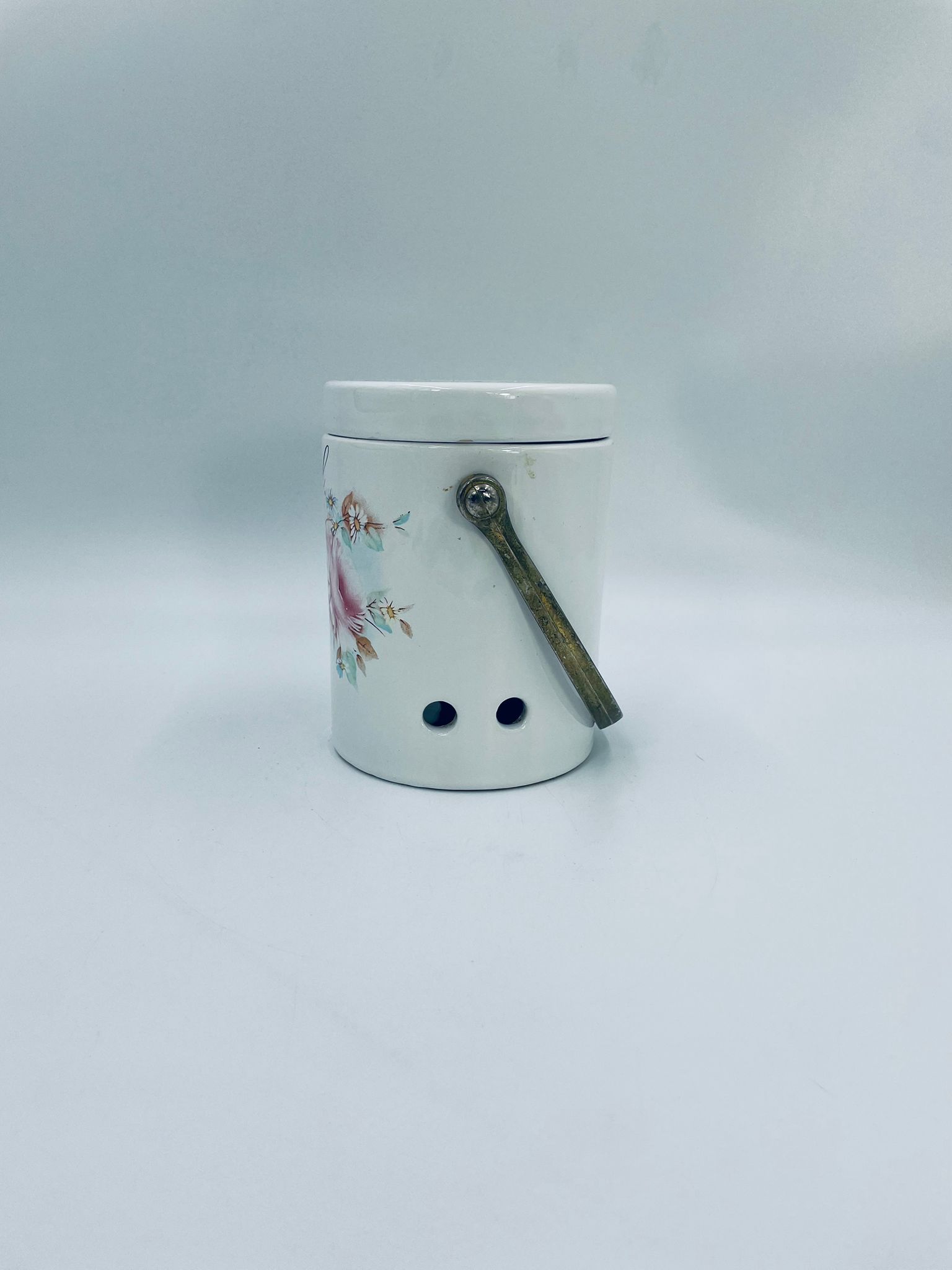 Pojemnik z pokrywą w stylu Vintage, wykonany z wysokiej jakości ceramiki. Pojemnik w białym kolorze, ozdobiony kwiatowym wzorem. Pojemnik posiada pokrywę oraz metalowy, złocony uchwyt i małe otwory wentylacyjne, które zapewniają cyrkulację powietrza i opóźniają kiełkowanie. Na pojemniku widnieje napis „Ail” -czosnek. Pojemnik służy do przechowywania główek czosnku.