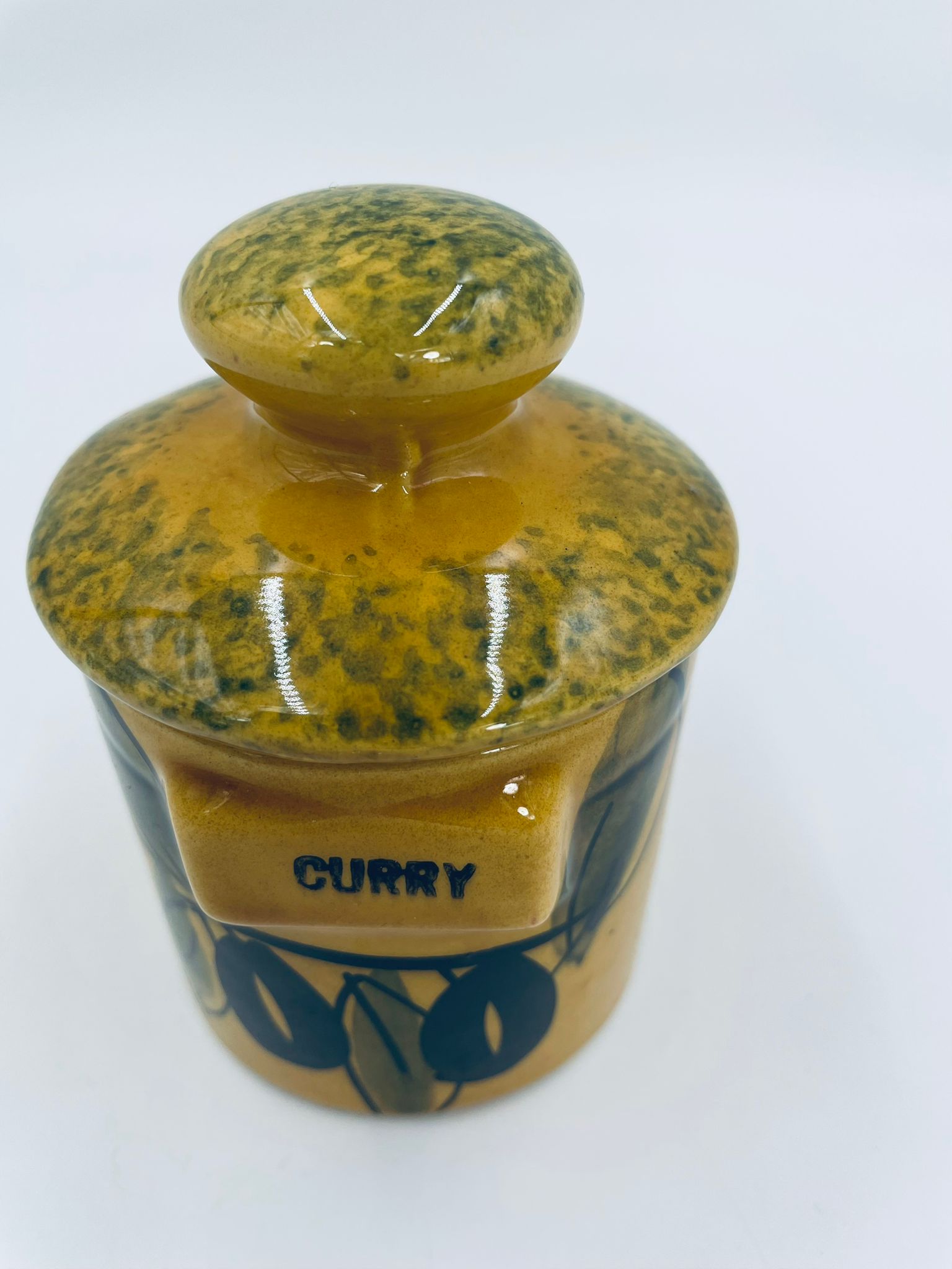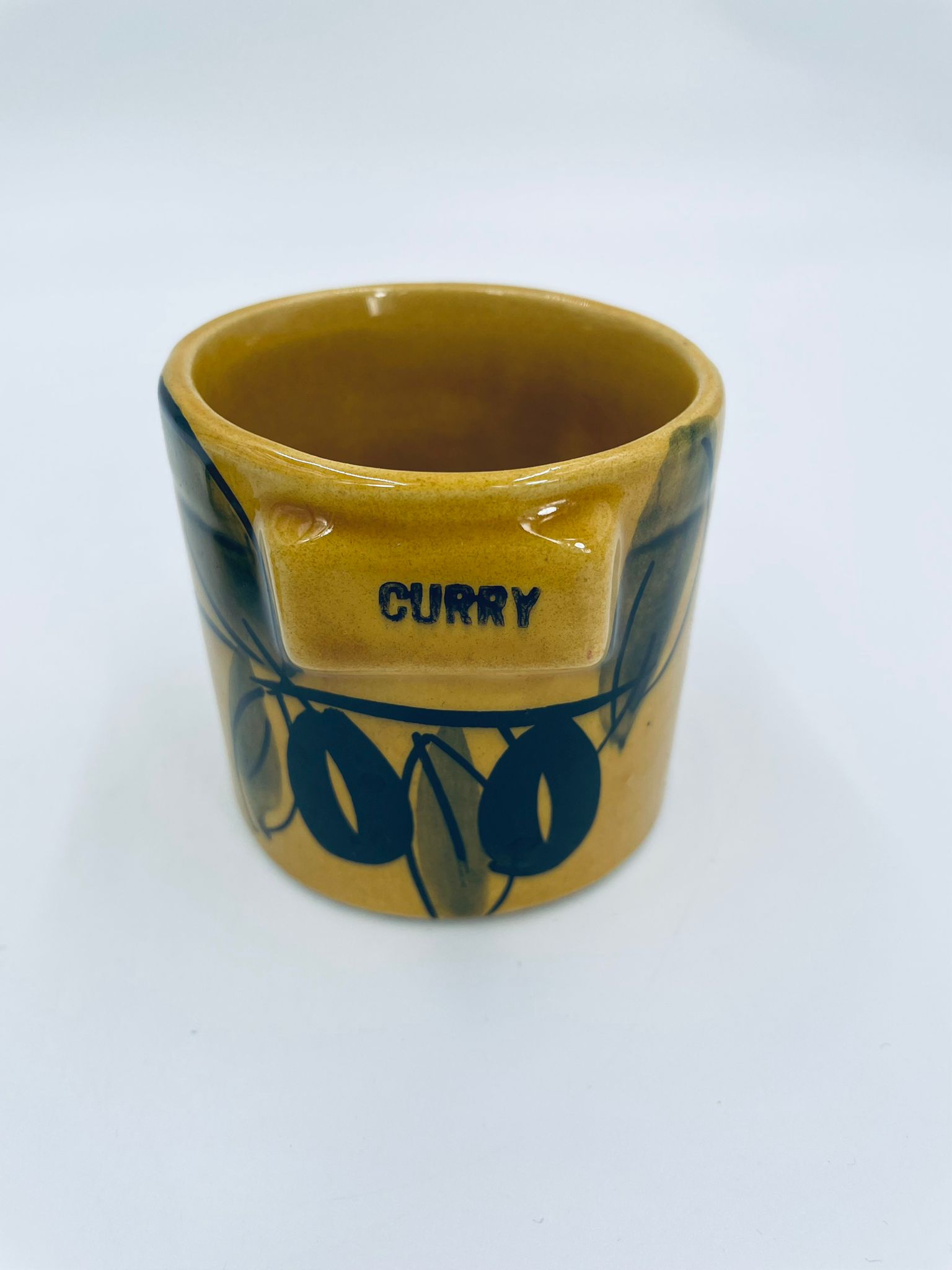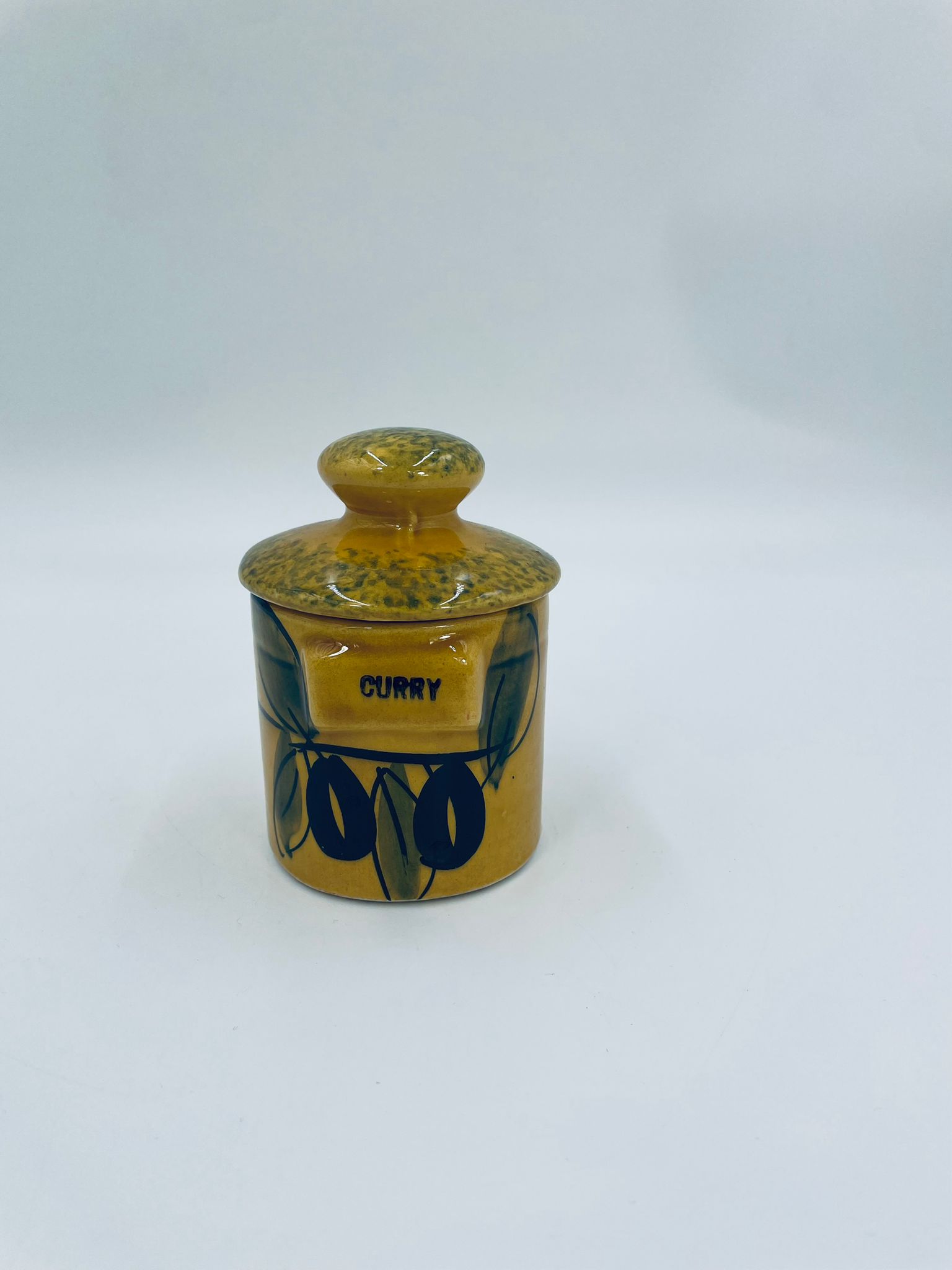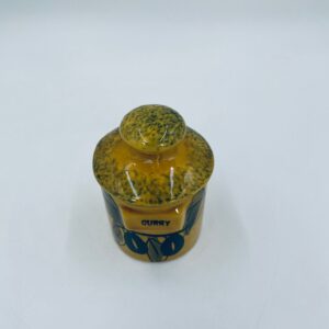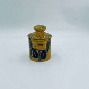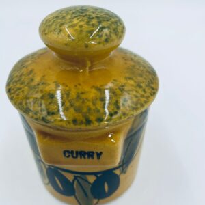 Pojemnik kuchenny na przyprawę F.P.P Vallauris w stylu Vintage, wykonany z wysokiej jakości szkliwionej ceramiki. Pojemnik w musztardowym kolorze z ręcznie malowanym wzorem liści i napisem „Curry”, posiada przykrycie z zielonymi akcentami.
