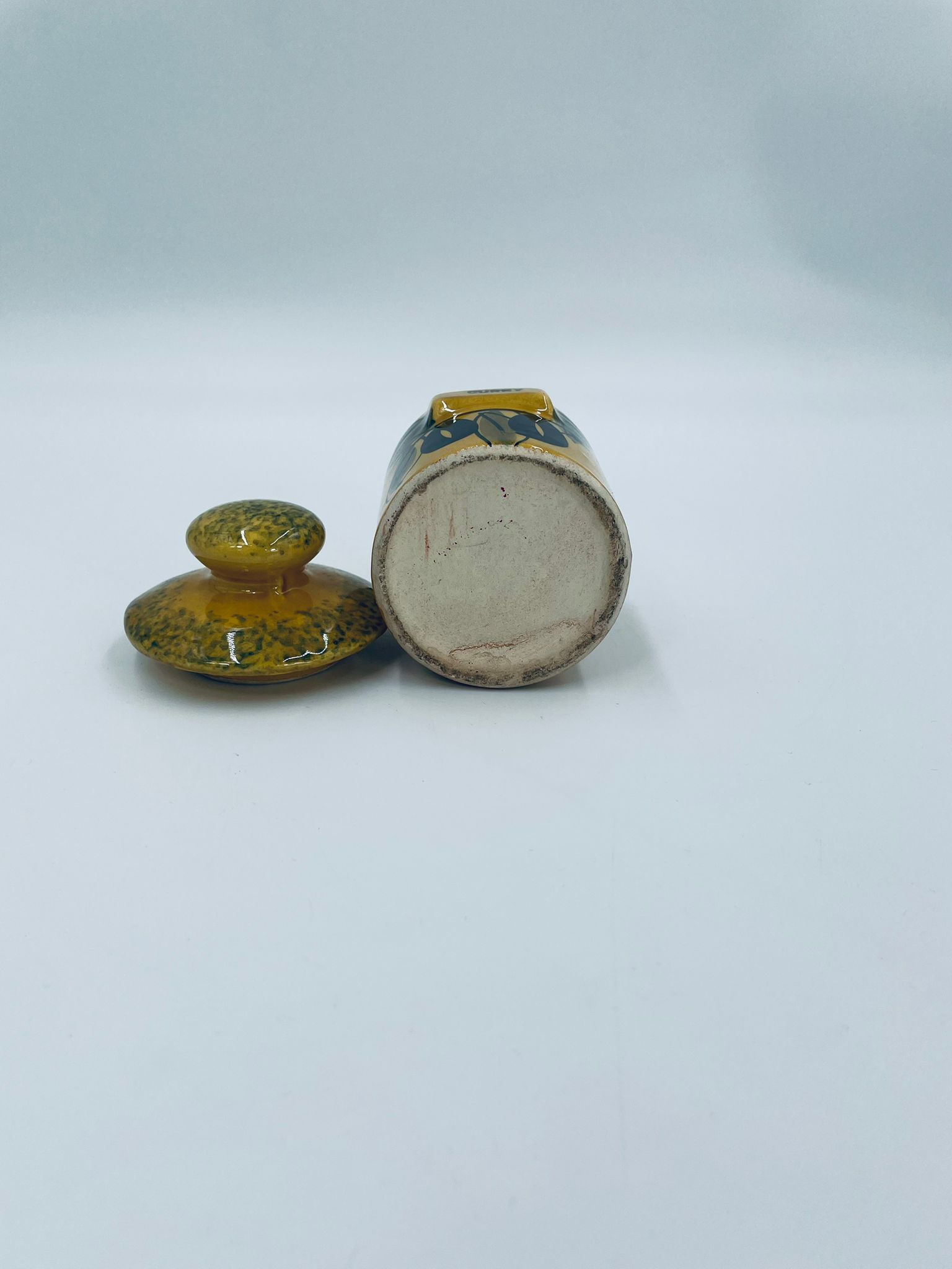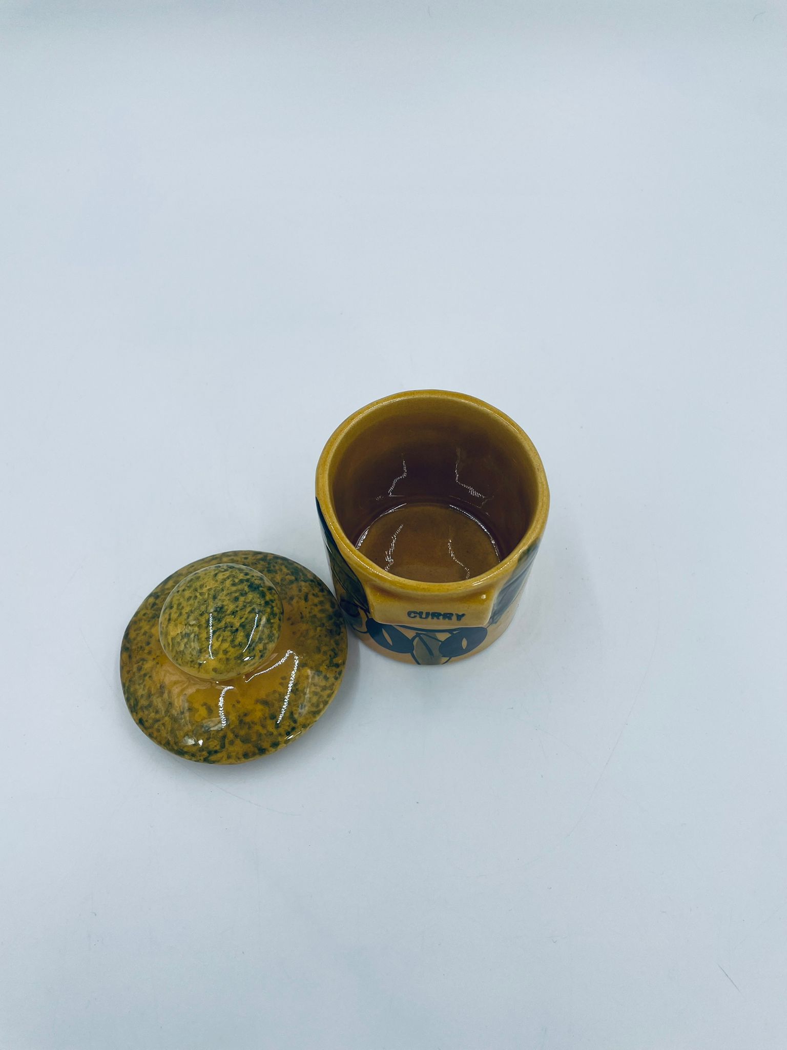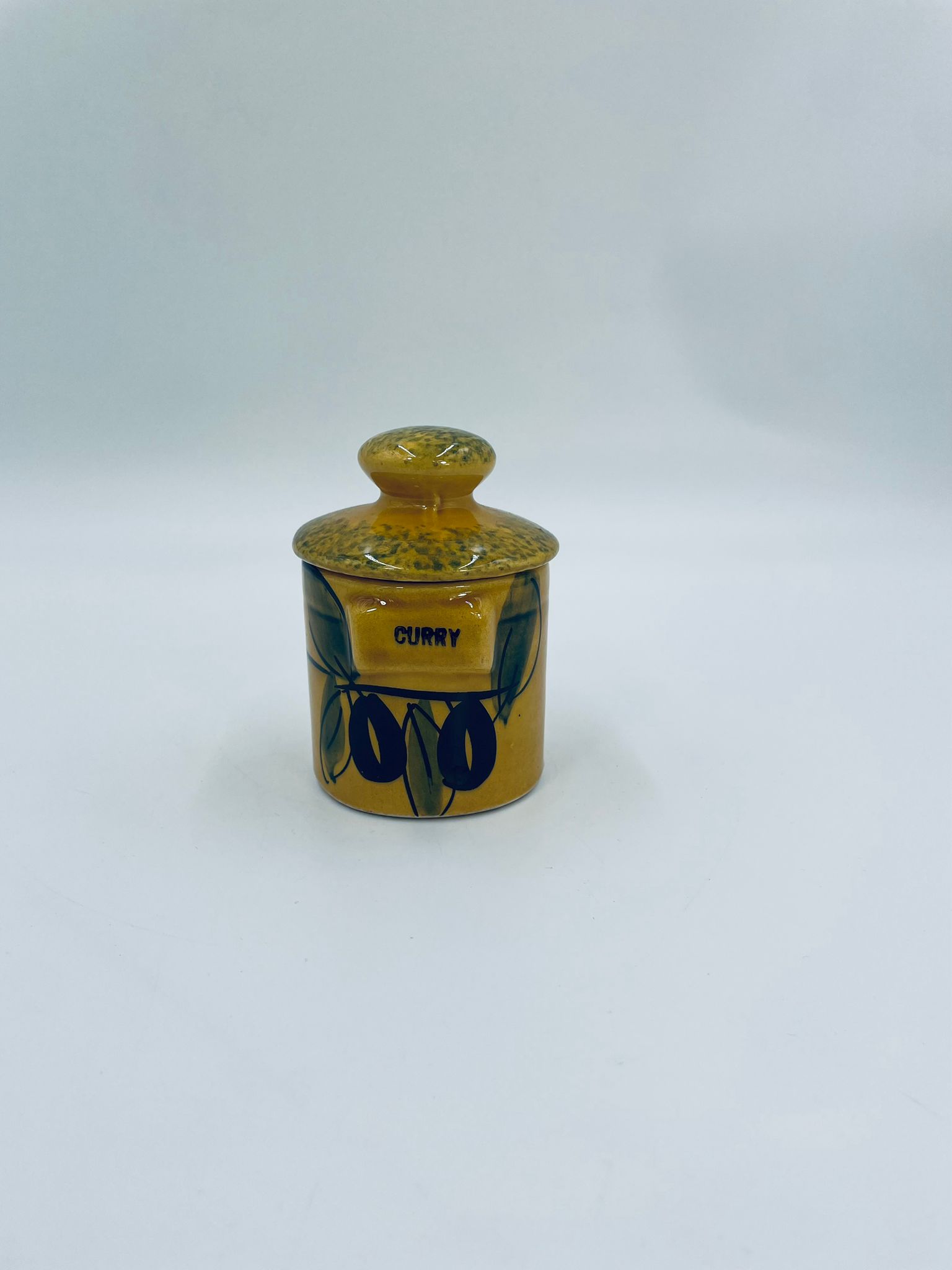 Pojemnik kuchenny na przyprawę F.P.P Vallauris w stylu Vintage, wykonany z wysokiej jakości szkliwionej ceramiki. Pojemnik w musztardowym kolorze z ręcznie malowanym wzorem liści i napisem „Curry”, posiada przykrycie z zielonymi akcentami.
