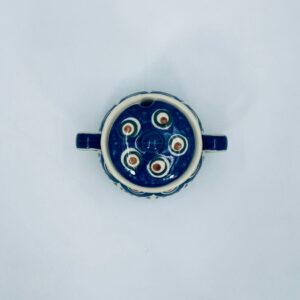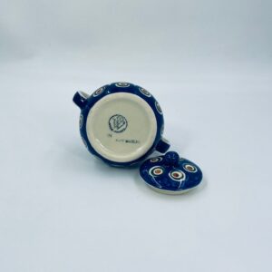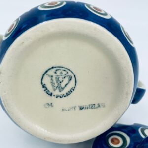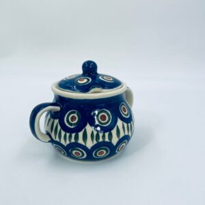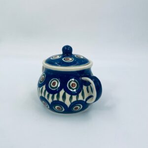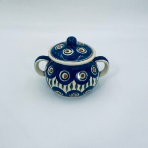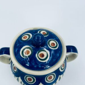 Sugar bowl by the Polish manufacturer Bolesławiec, made from the highest quality ceramics. The handmade sugar bowl is decorated with a hand-painted traditional peacock's eye pattern. The patterns on the Bolesławiec ceramics are applied with a stamp and brush method.
