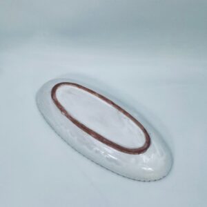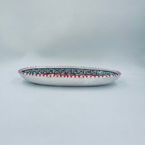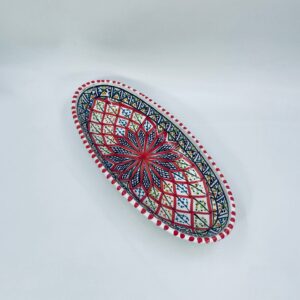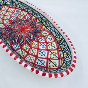 Półmisek dekoracyjny Tunezyjski w stylu Orientalnym, wykonany z wysokiej jakości ceramiki. Półmisek ręcznie malowany, charakteryzuje się owalnym kształtem, precyzyjnym, geometrycznym wzorem centralnej gwiazdy, wypełnionym drobnymi kropkami mozaiki w intensywnych barwach, wykończony czerwonymi akcentami na rancie.