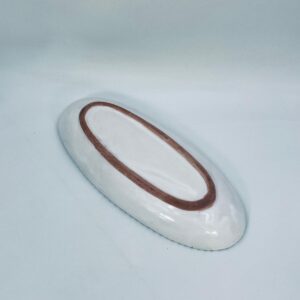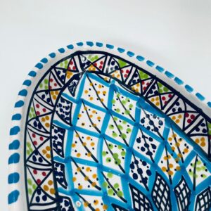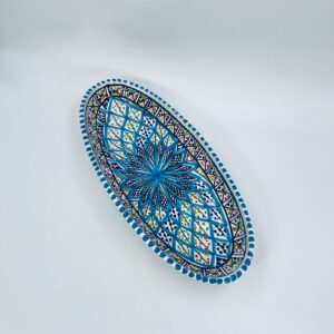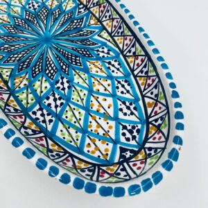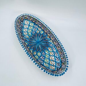 Półmisek dekoracyjny Tunezyjski w stylu Orientalnym, wykonany z wysokiej jakości ceramiki. Półmisek ręcznie malowany, charakteryzuje się owalnym kształtem, precyzyjnym, geometrycznym wzorem centralnej gwiazdy, wypełnionym drobnymi kropkami mozaiki w intensywnych barwach, wykończony niebieskimi akcentami na rancie.