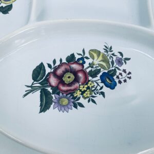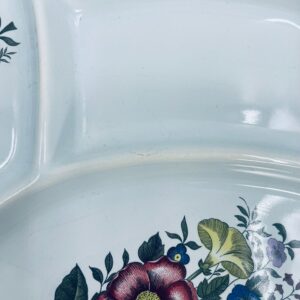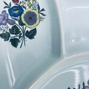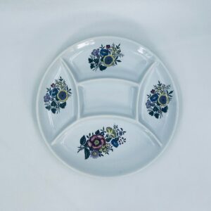 Półmisek dekoracyjny do fondue wytwórni Waechtersbach, wykonany z wysokiej jakości białej ceramiki. Półmisek okrągły z przegródkami idealny do serwowania przekąsek, ozdobiony motywem kwiatowym. Posiada drobne pęknięcia.