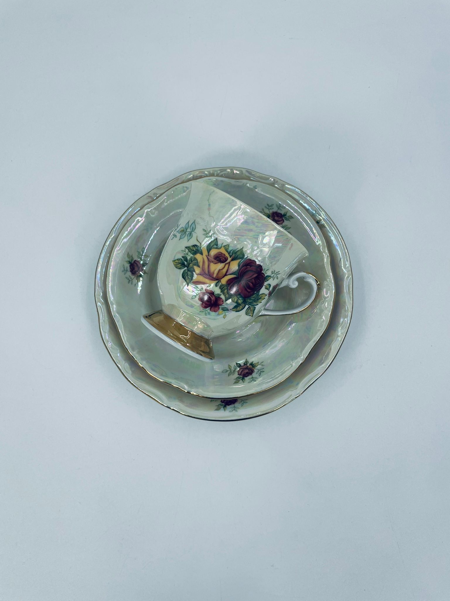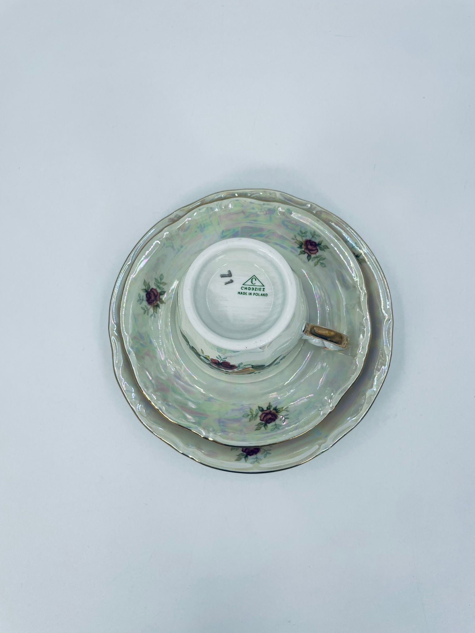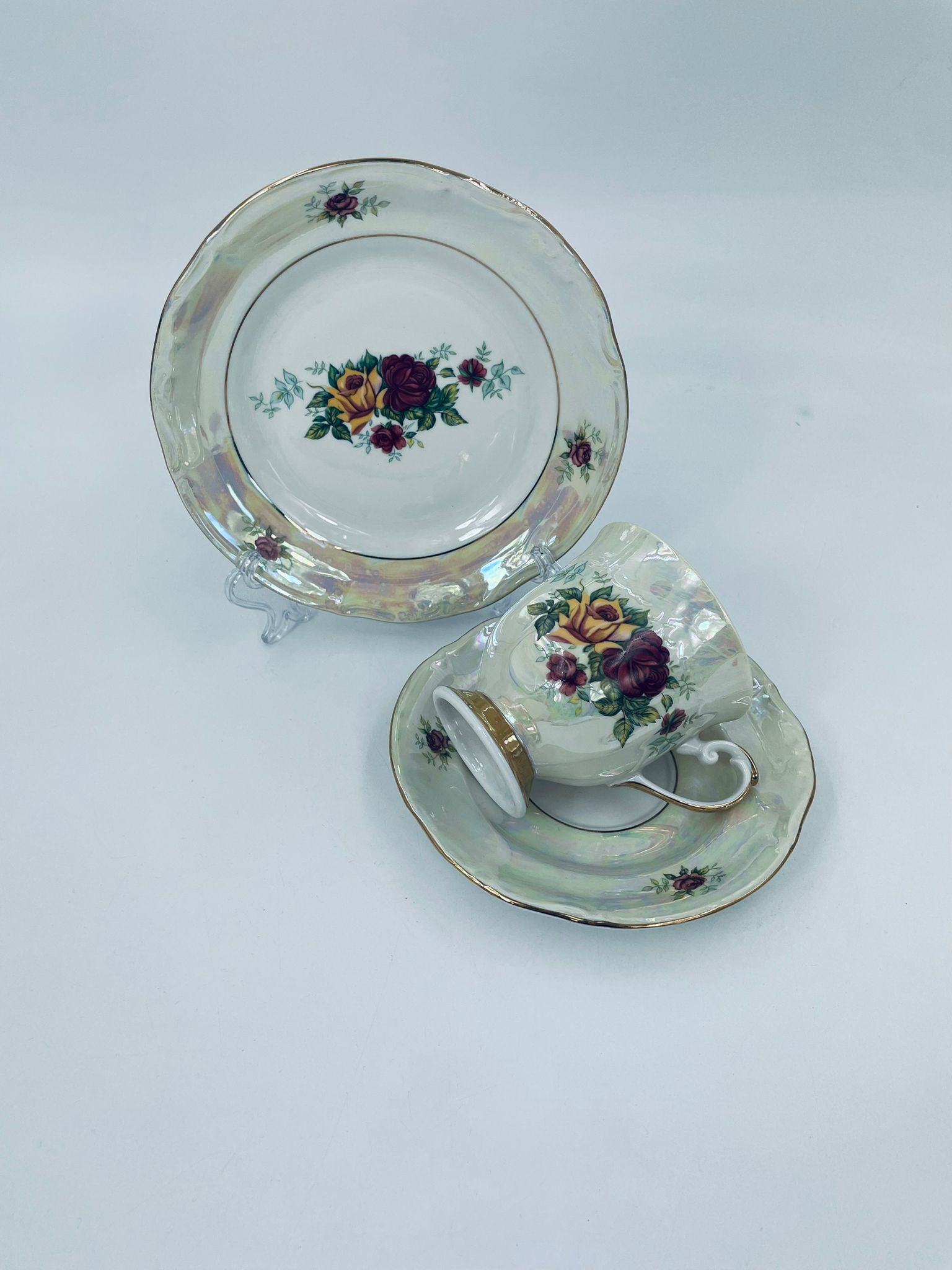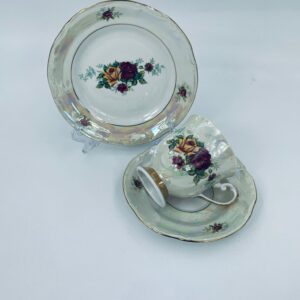 Porcelain cup in trio set by Chodzież Polska, signed 1964. Pearl porcelain with a motif of yellow and burgundy roses, finished with folds.