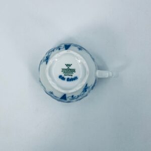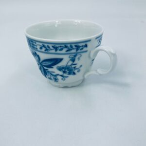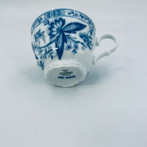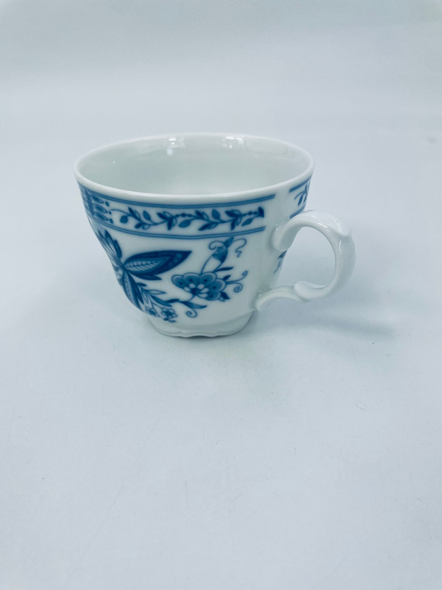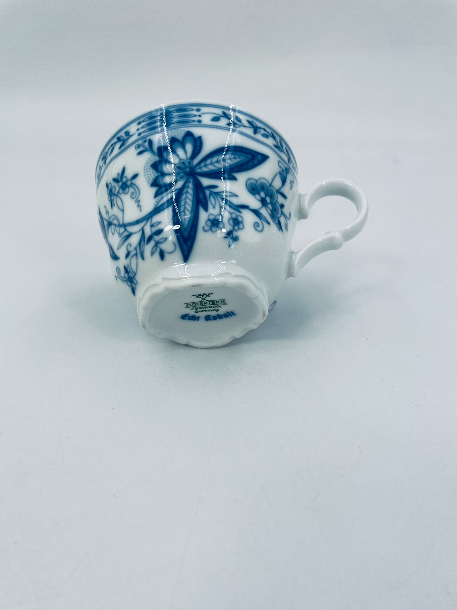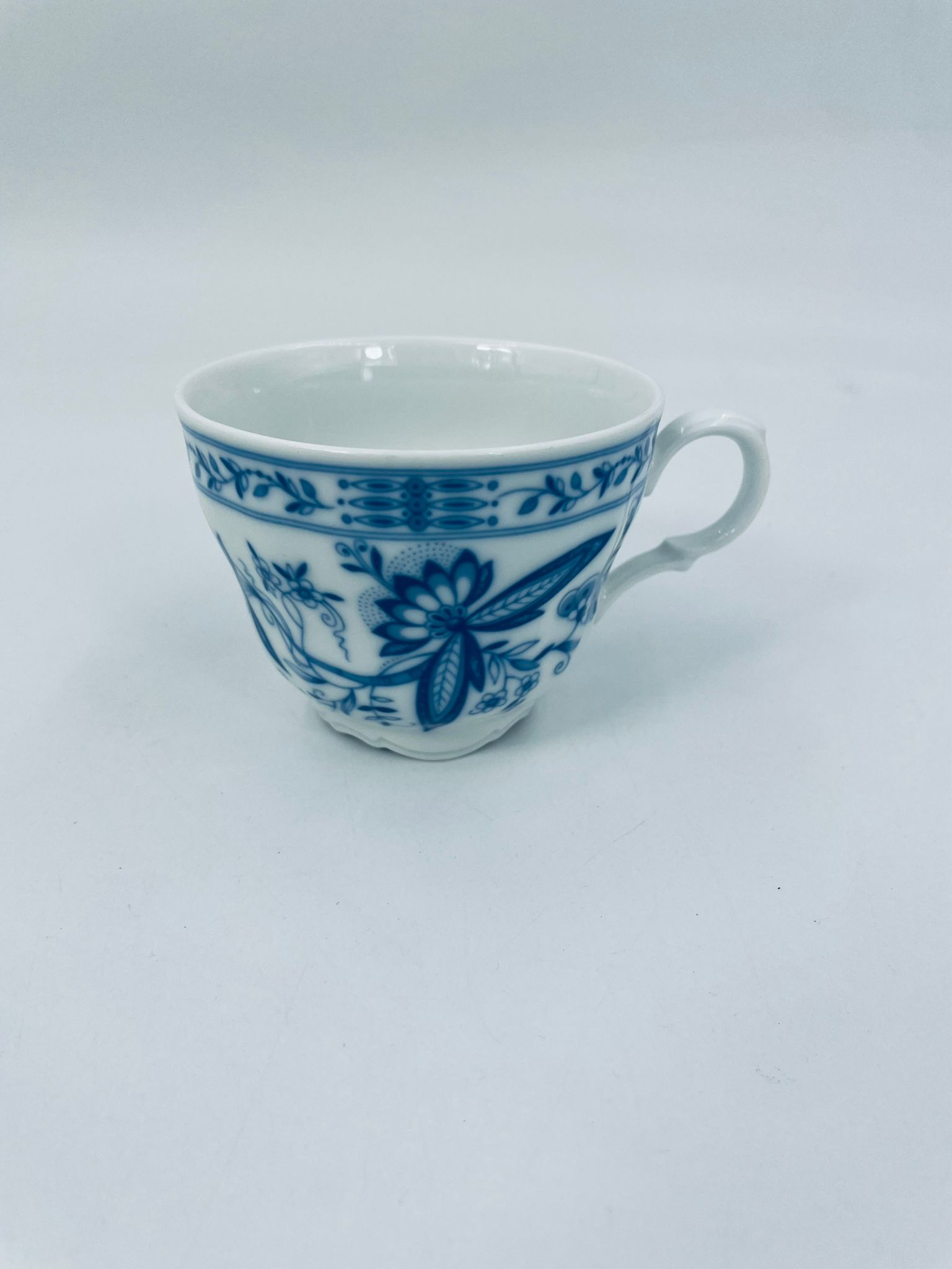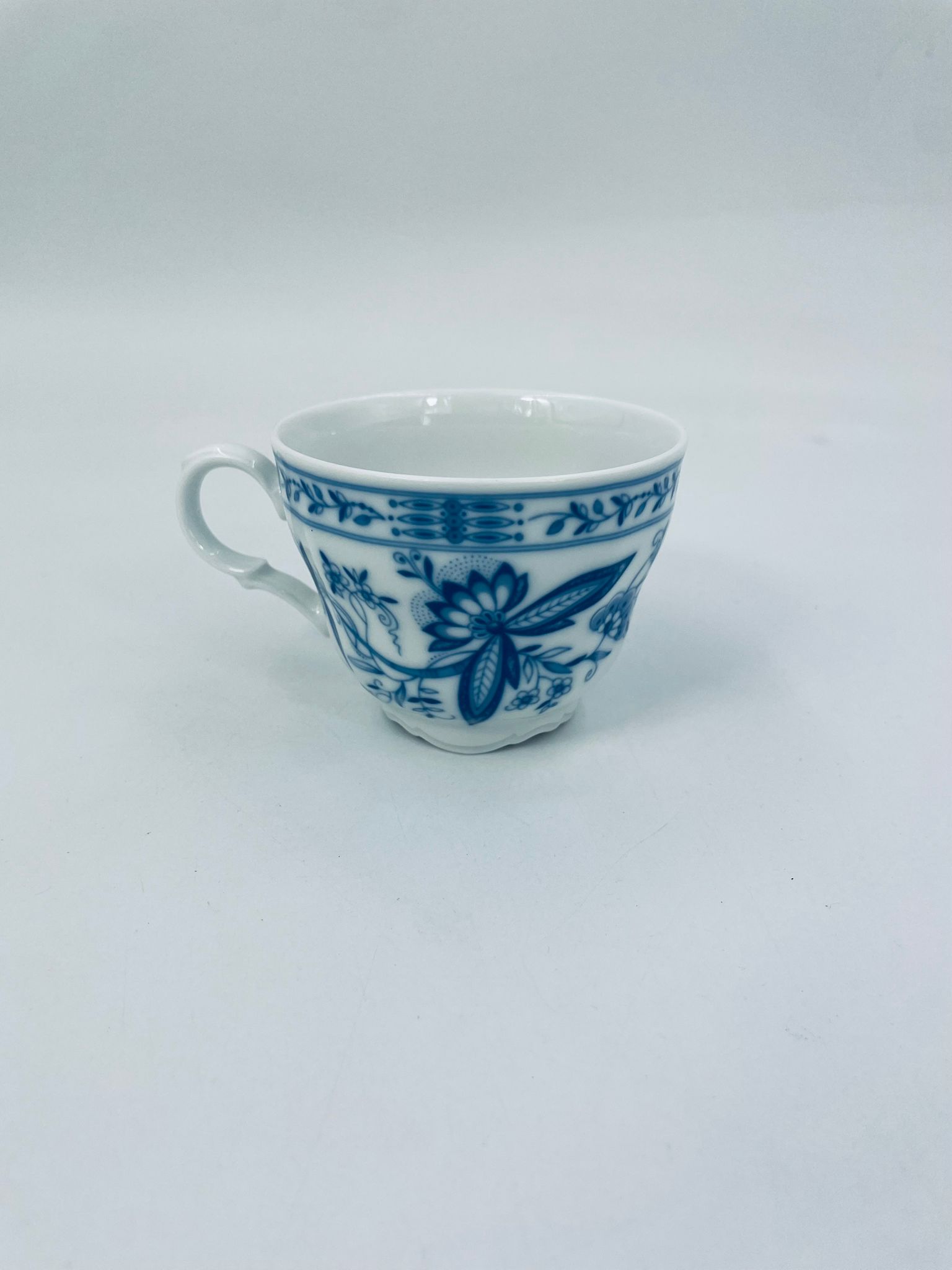 Porcelain cup by the Mitterteich Bavaria factory in the classic onion pattern. It is characterised by its baroque shape, which also fits into contemporary interiors. Porcelain in white with blue patterns.