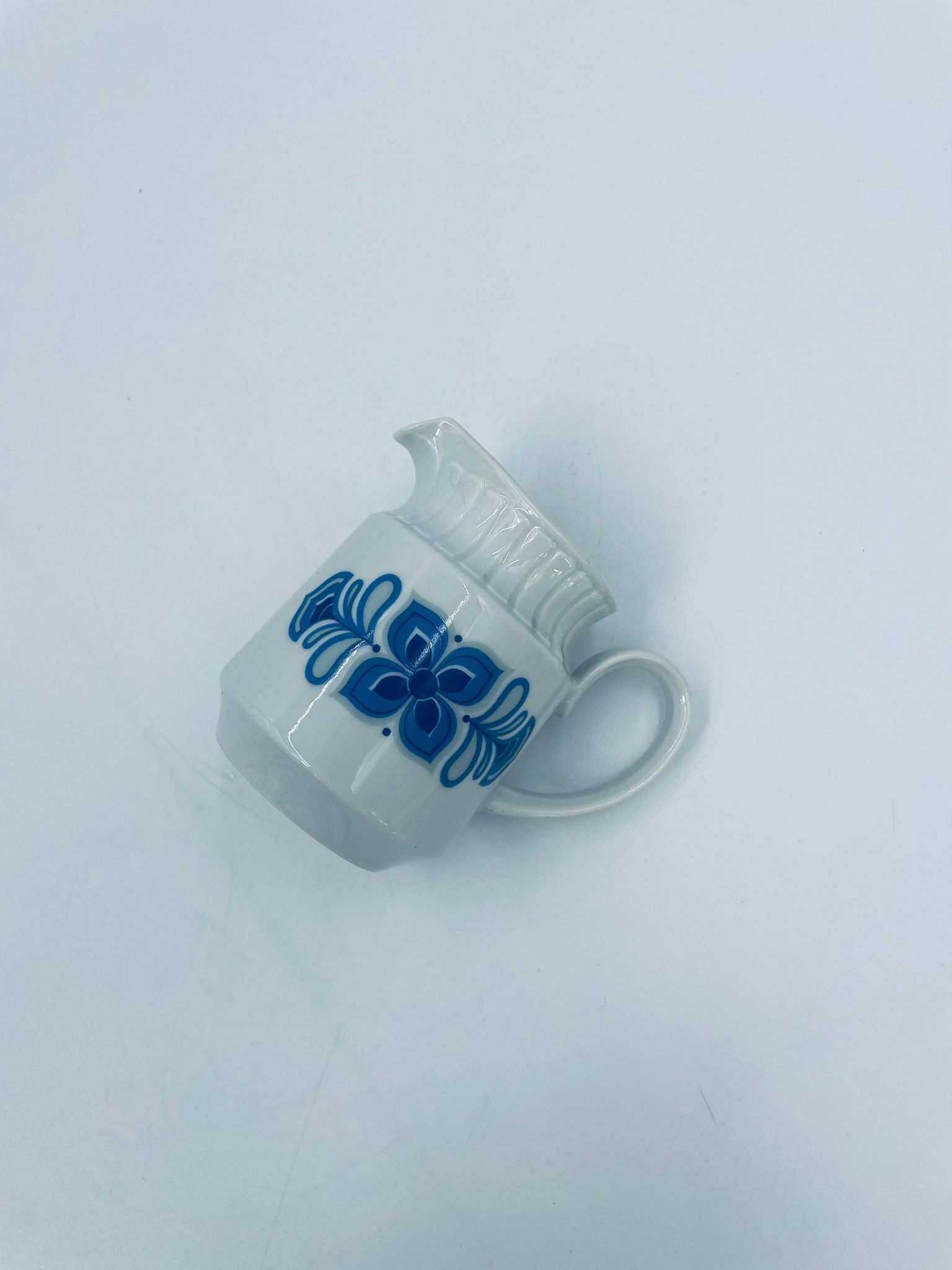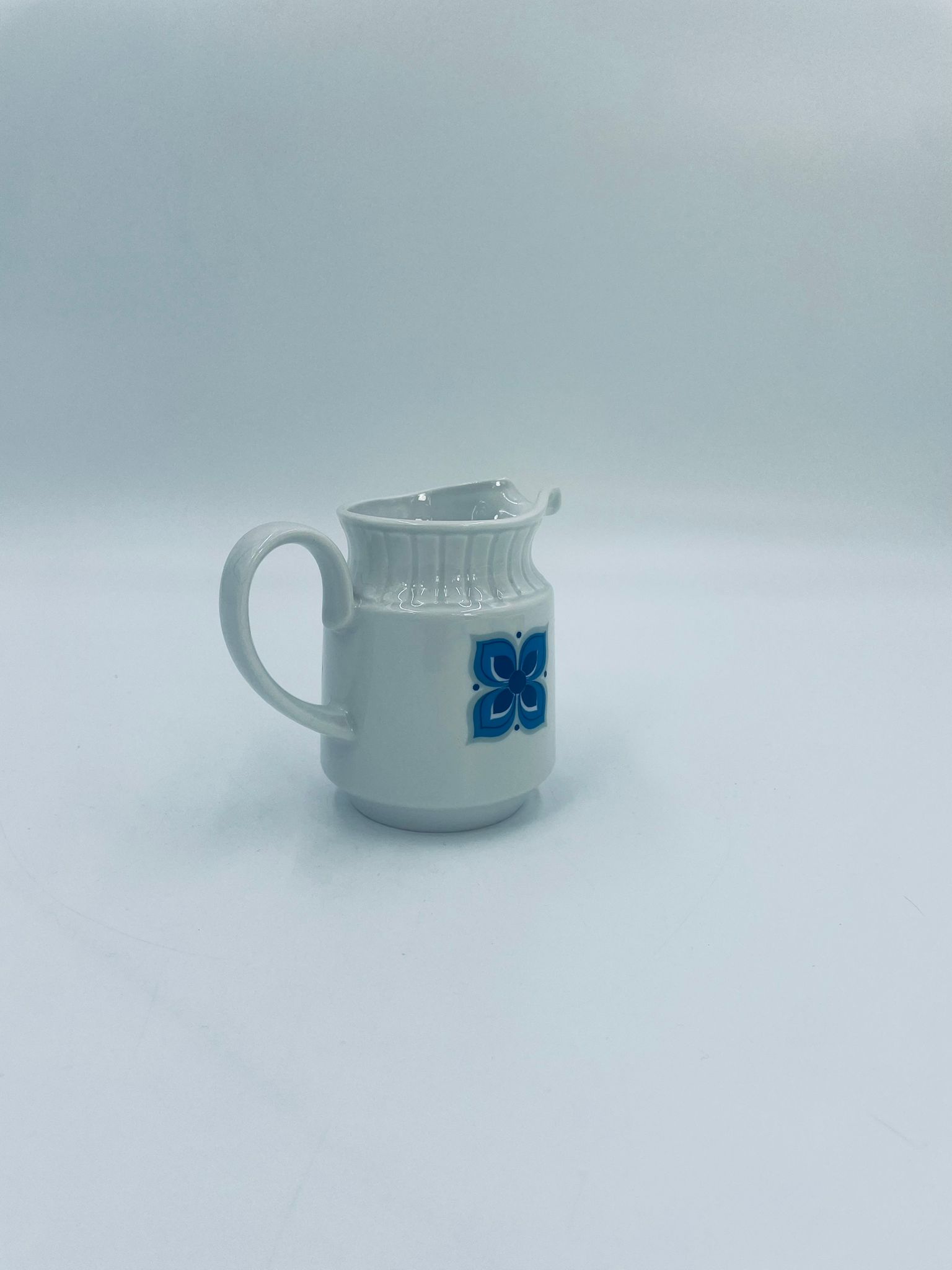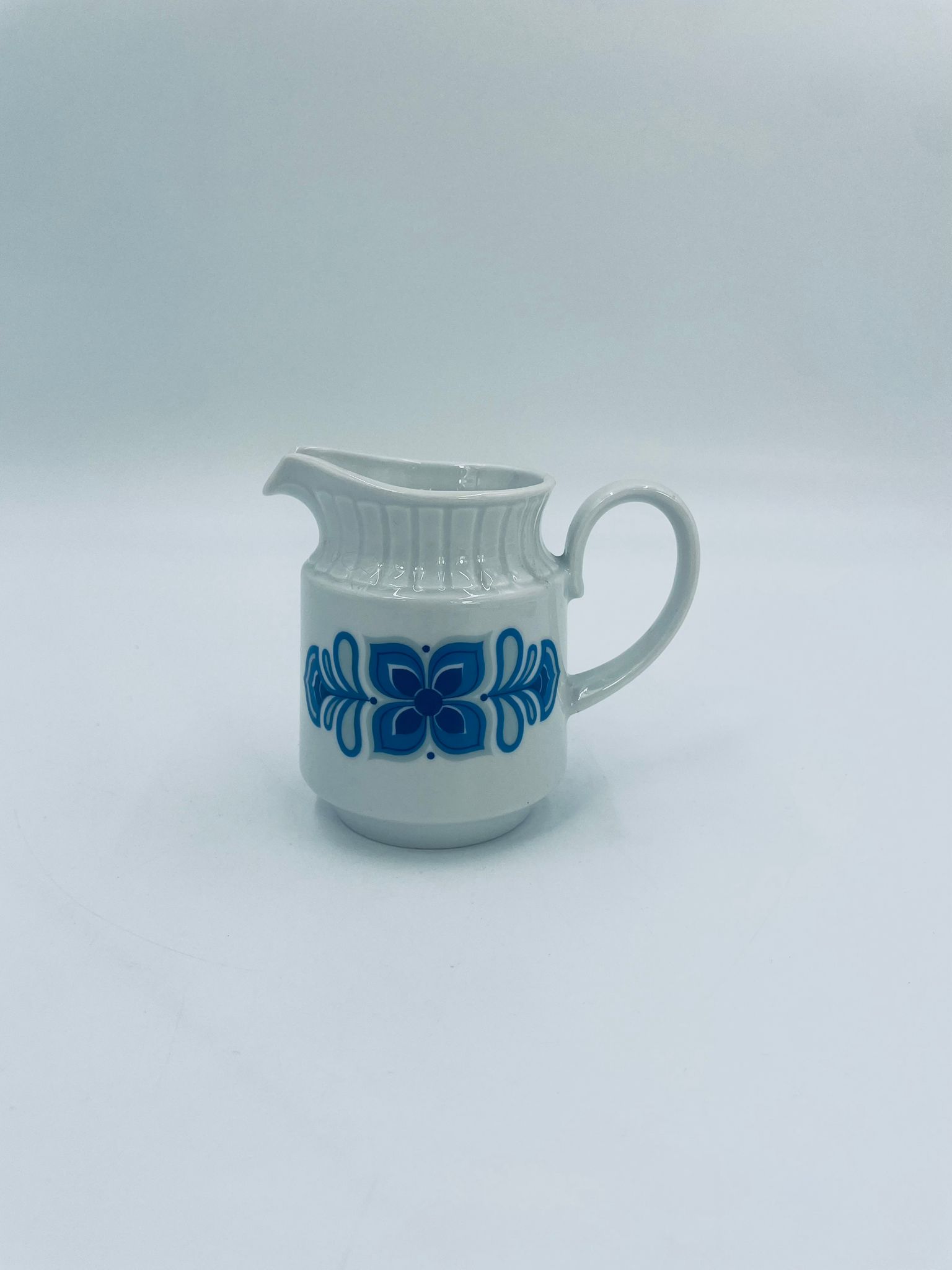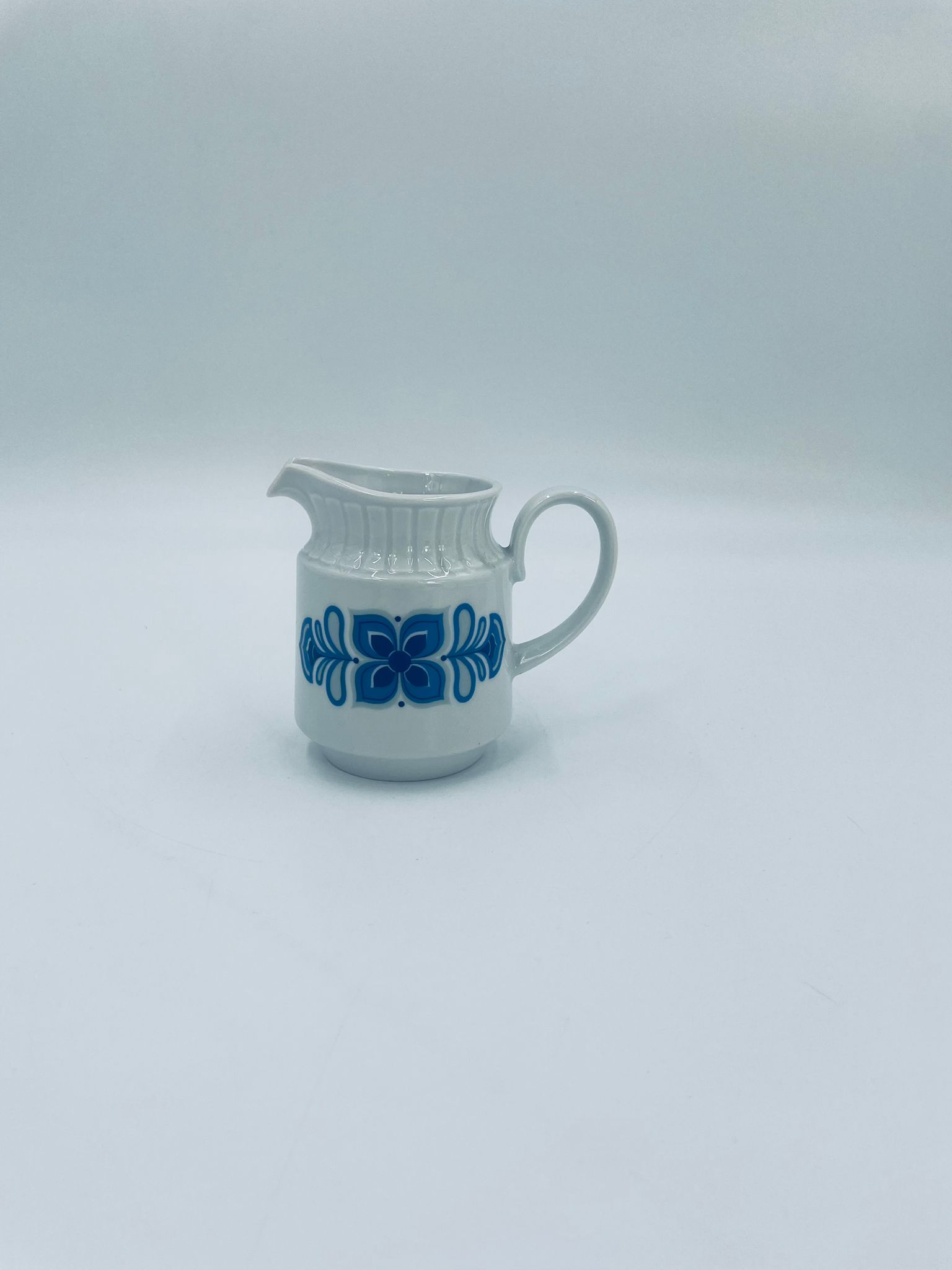 Milk jug by the Mitterteich factory, made of high-quality white porcelain. An elegant milk jug, decorated with a blue floral motif in a symmetrical, graphic arrangement with a fluted top.