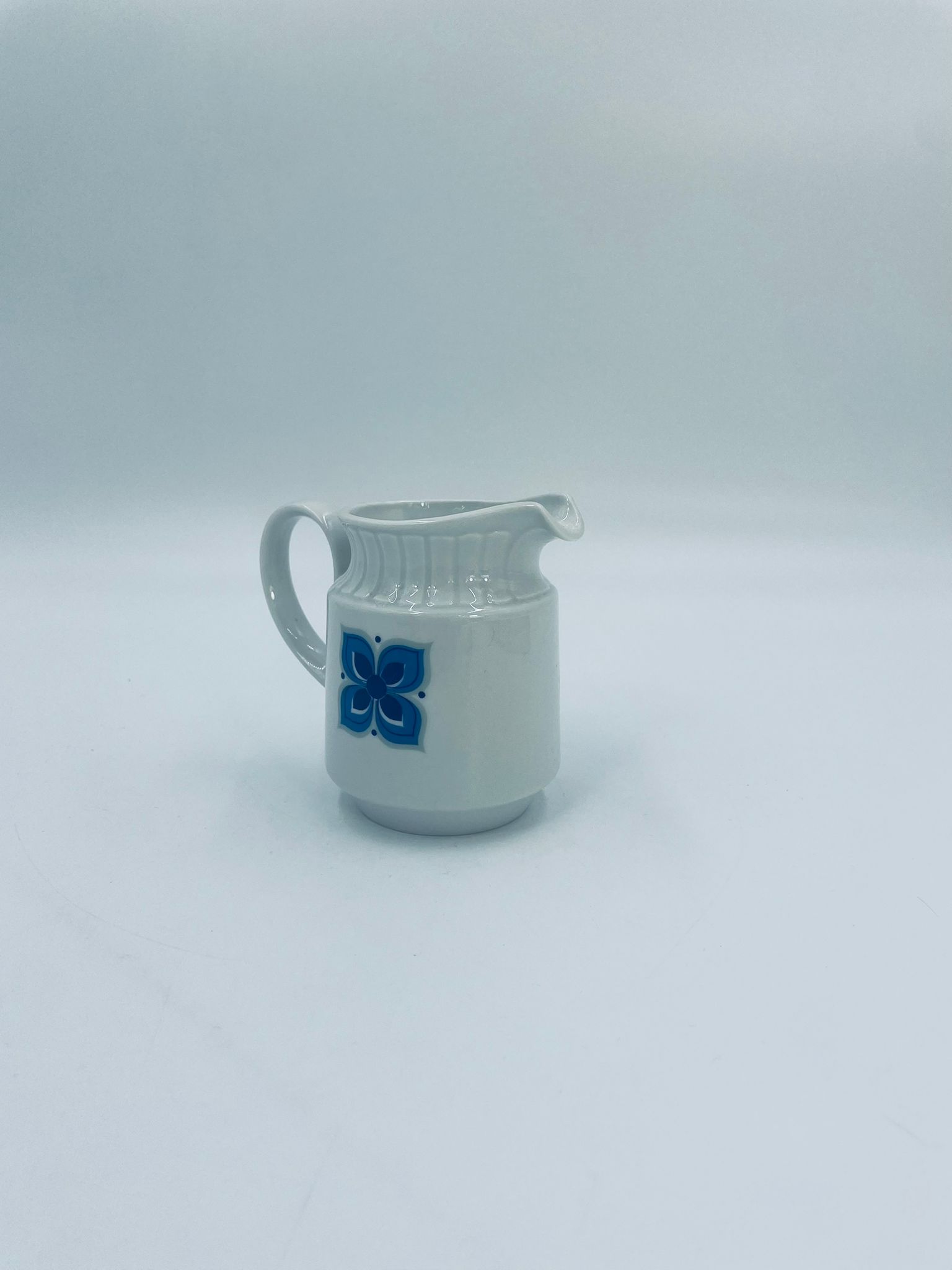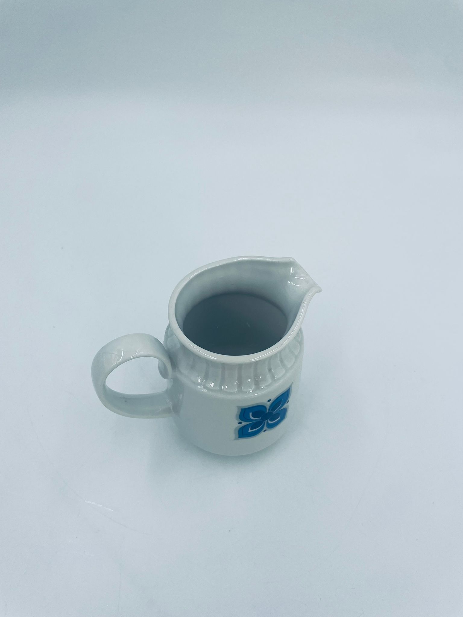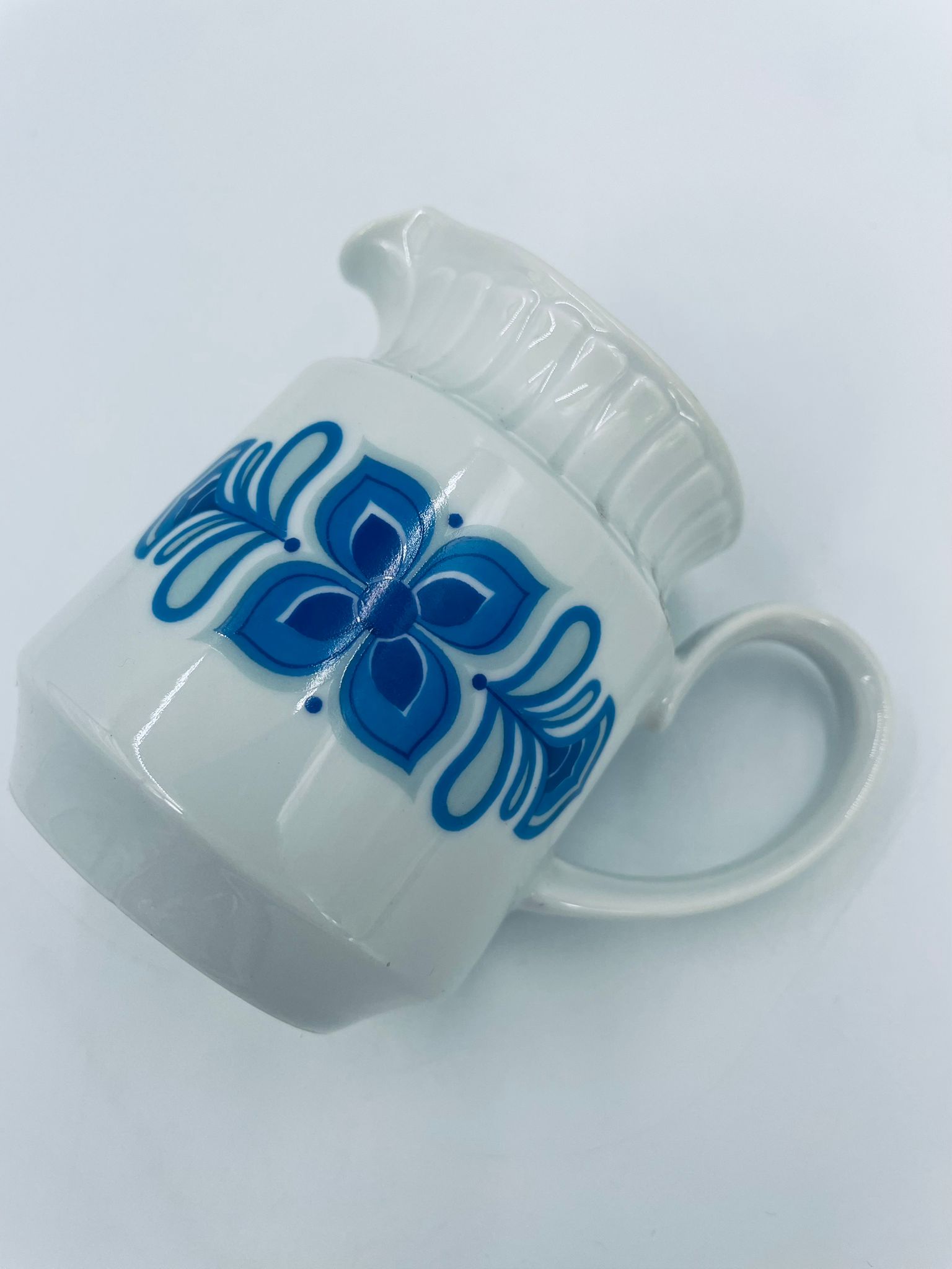 Milk jug by the Mitterteich factory, made of high-quality white porcelain. An elegant milk jug, decorated with a blue floral motif in a symmetrical, graphic arrangement with a fluted top.