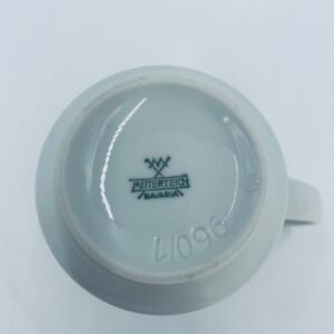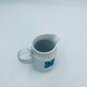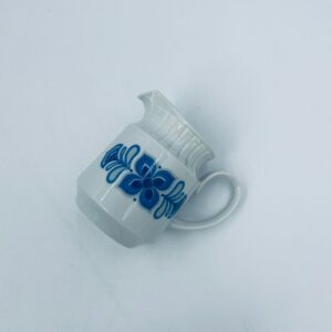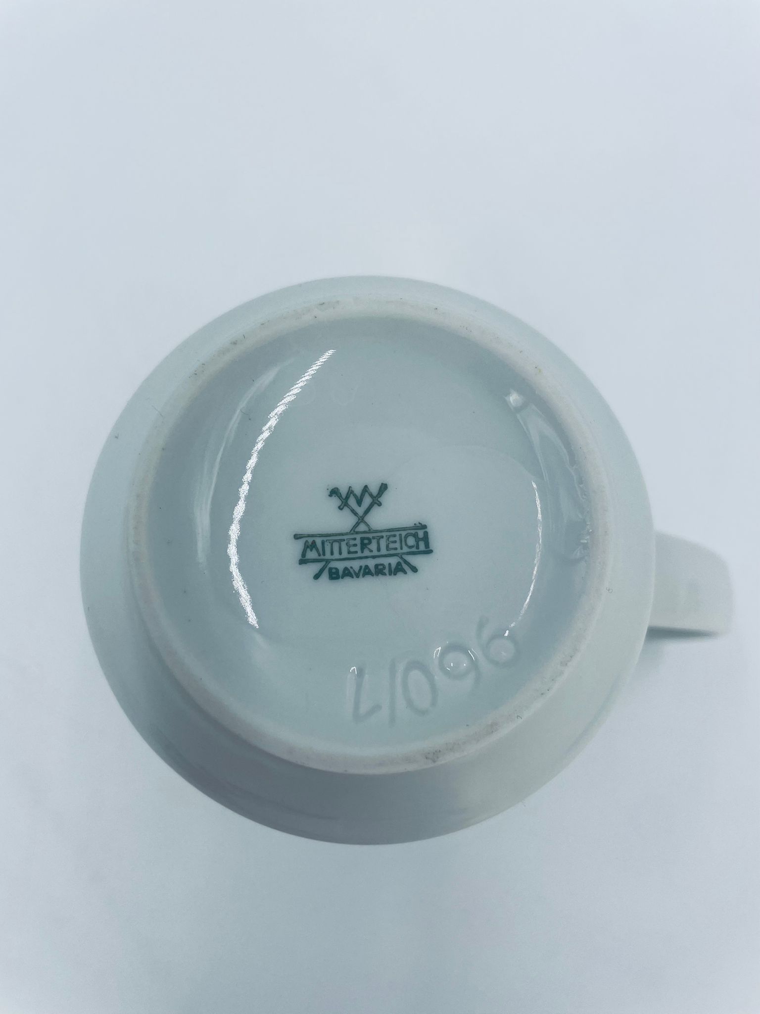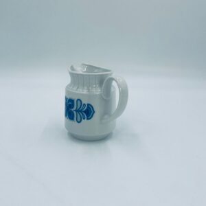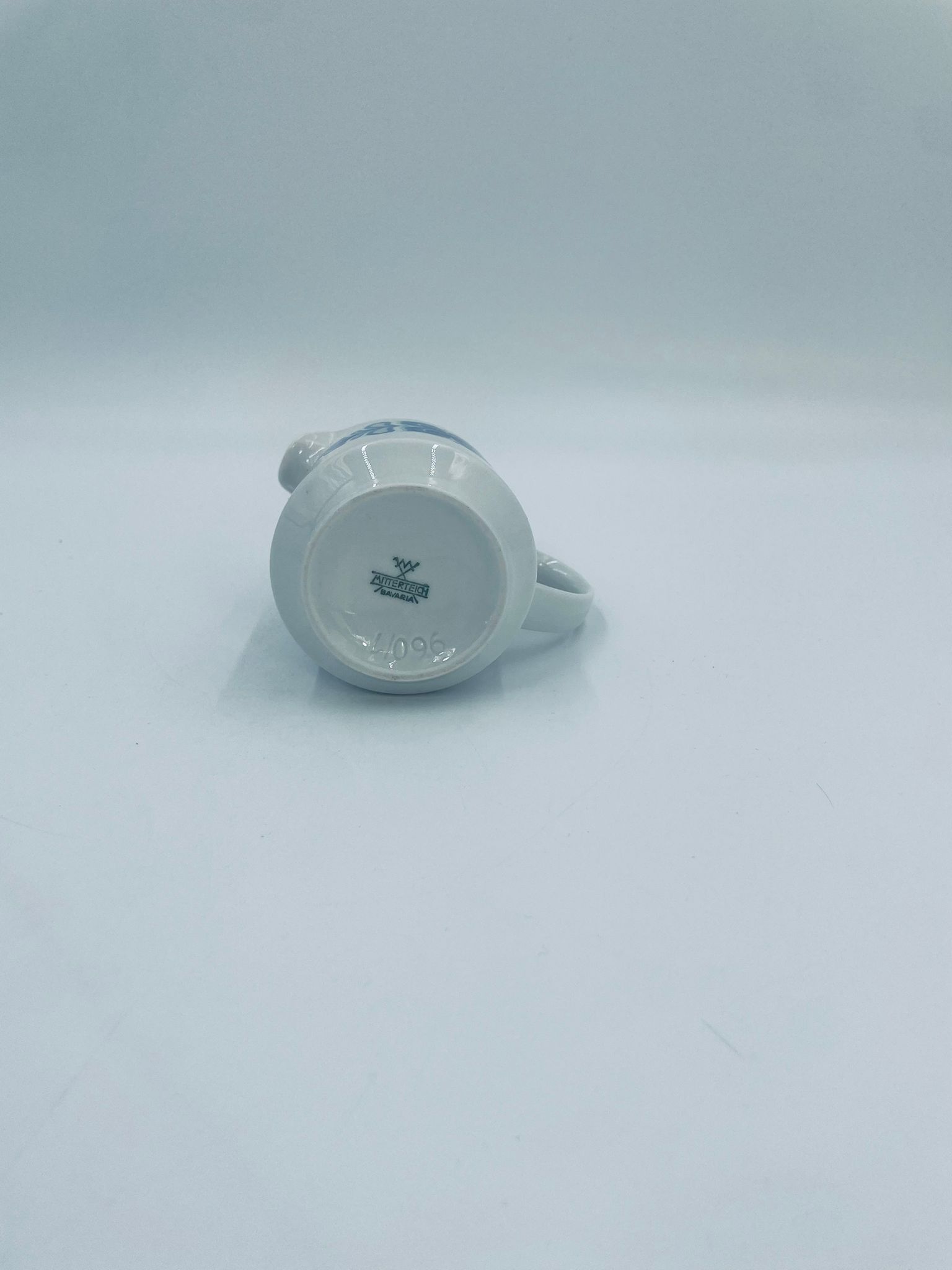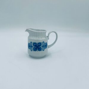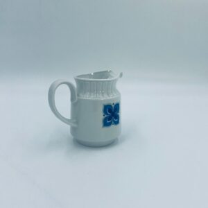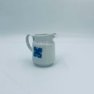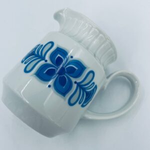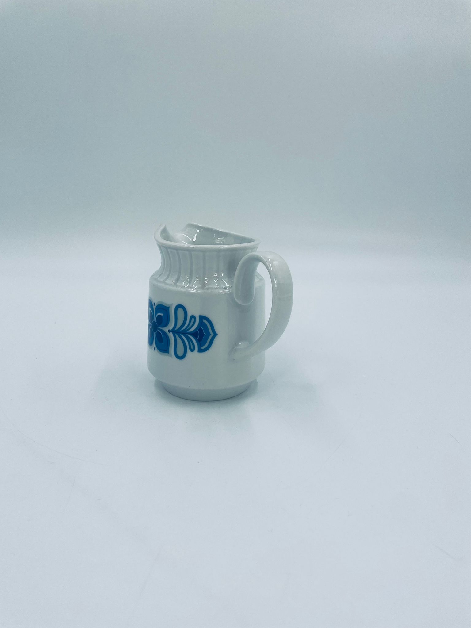 Milk jug by the Mitterteich factory, made of high-quality white porcelain. An elegant milk jug, decorated with a blue floral motif in a symmetrical, graphic arrangement with a fluted top.