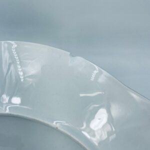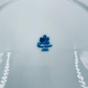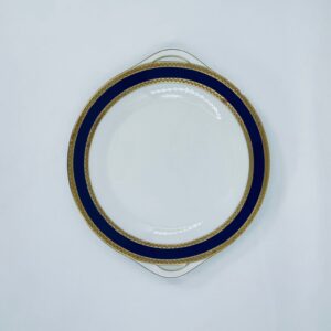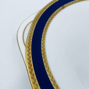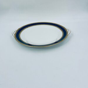 A platter by the Royal Tettau label, made of high quality white porcelain. The round platter with two handles is decorated with a wide cobalt blue band, finished in gilding with a leaf pattern. It has rubbing on the gilding and a small loss.