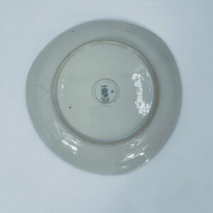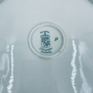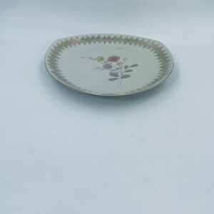 A decorative platter by Schumann Arzberg, made of high-quality porcelain in ecru. The platter has a triangular shape with rounded corners , decorated with stylised flowers in pastel colours and a gold pattern around the edge, finished with gilding on the rim. It has a discolouration.