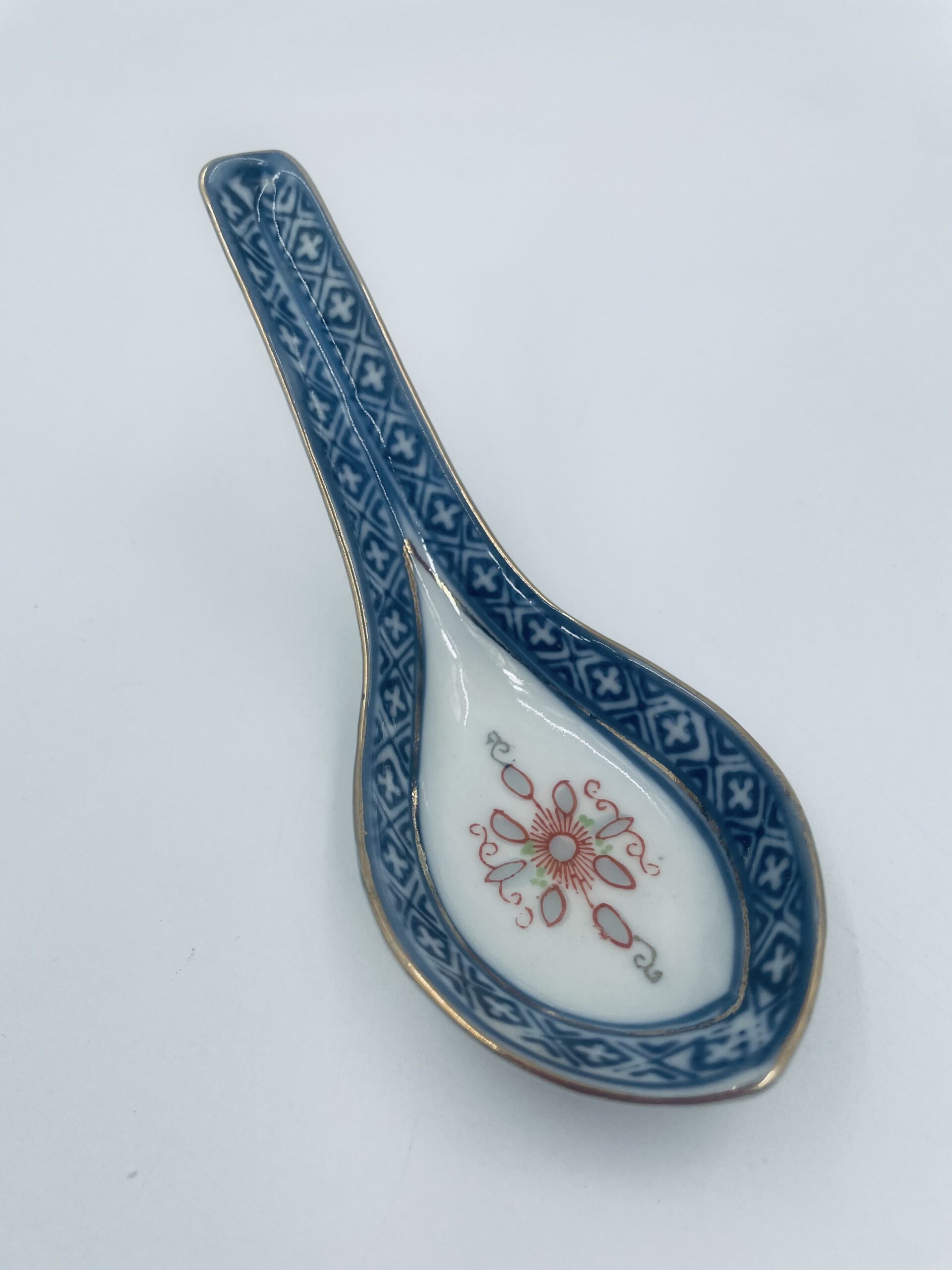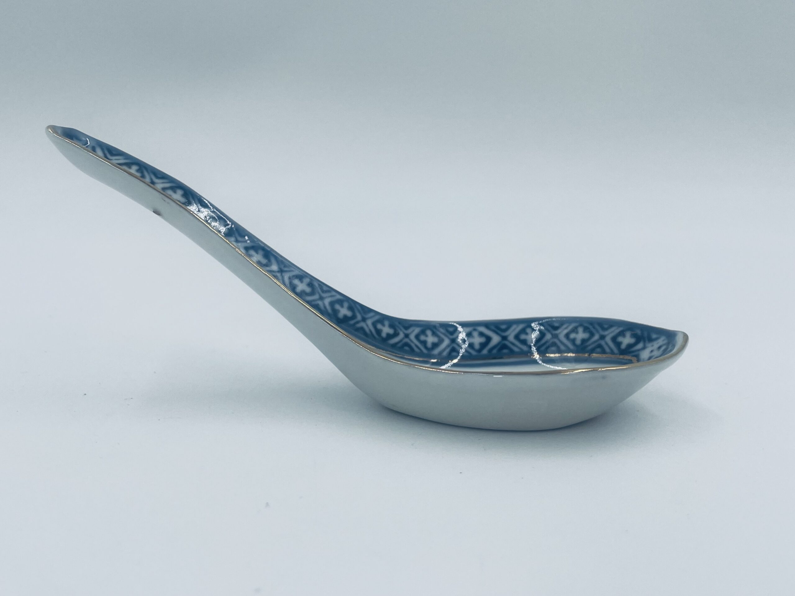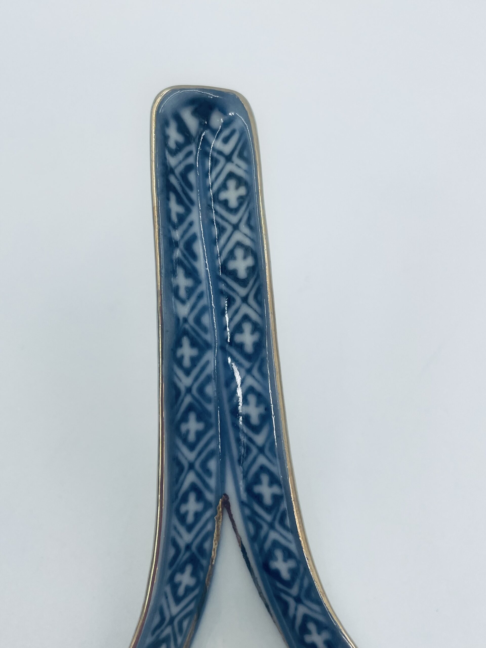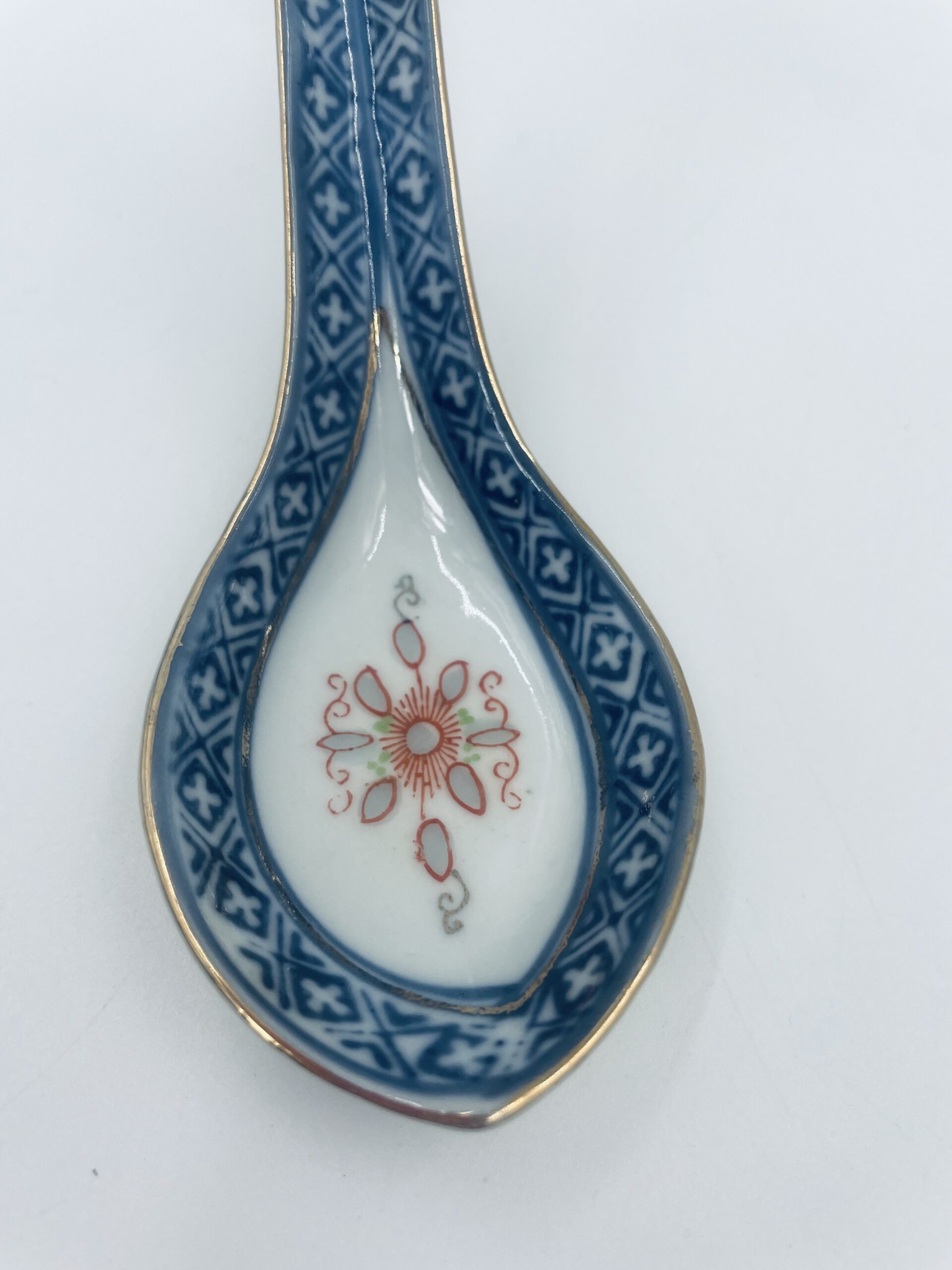 Hand decorated with blue and white borders with gilt decoration and red decoration.