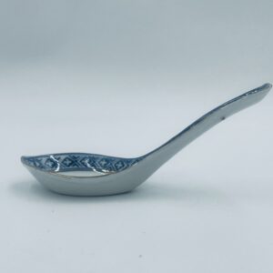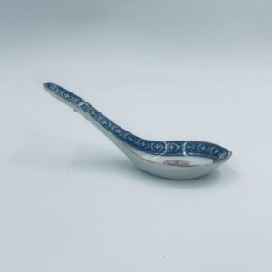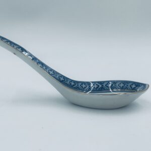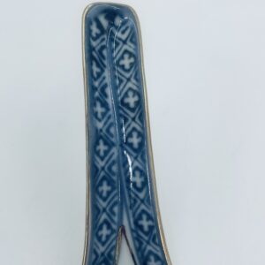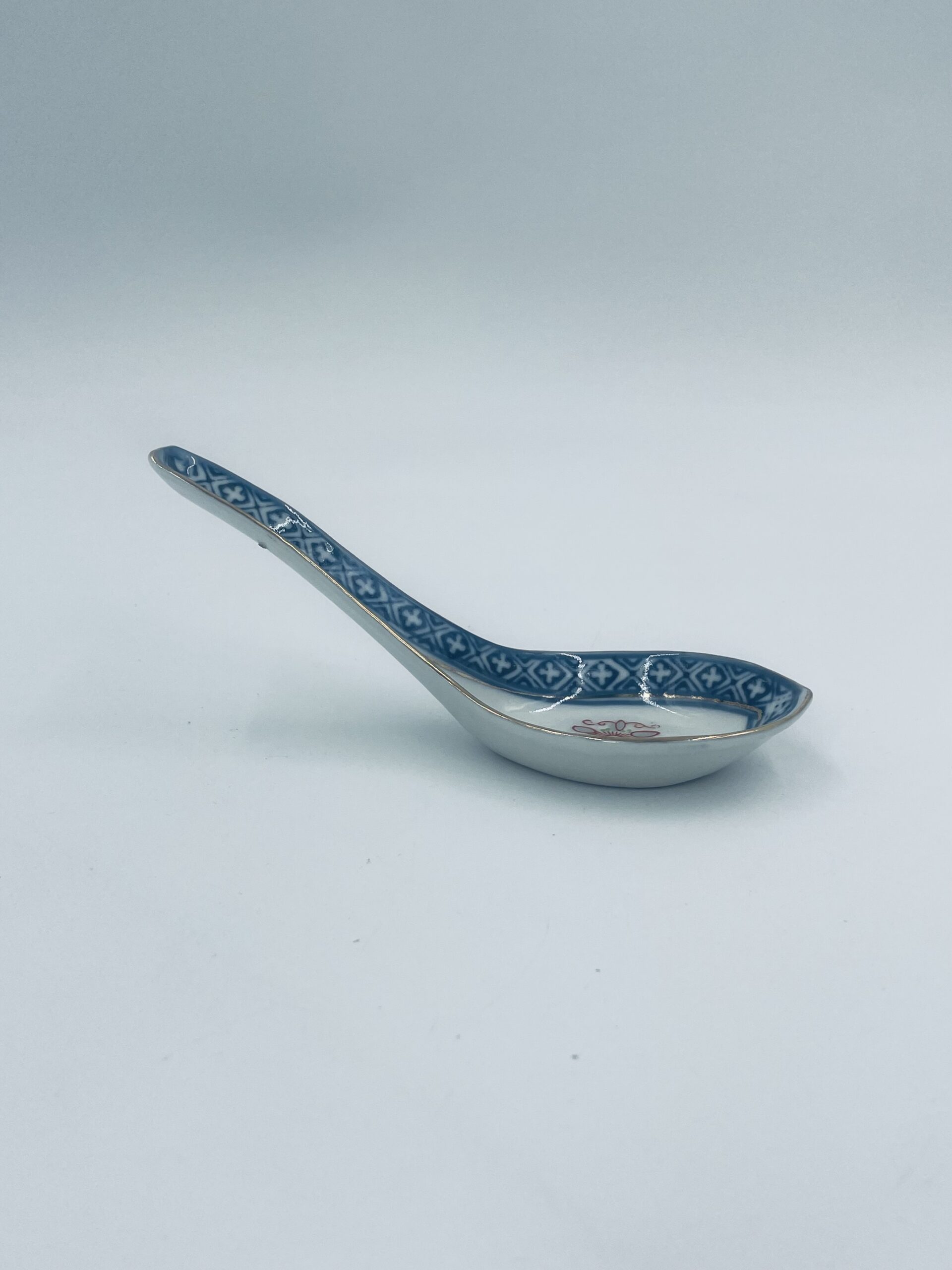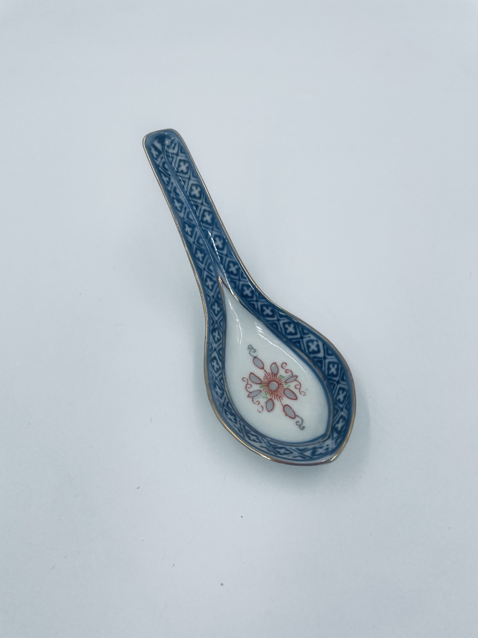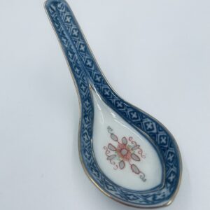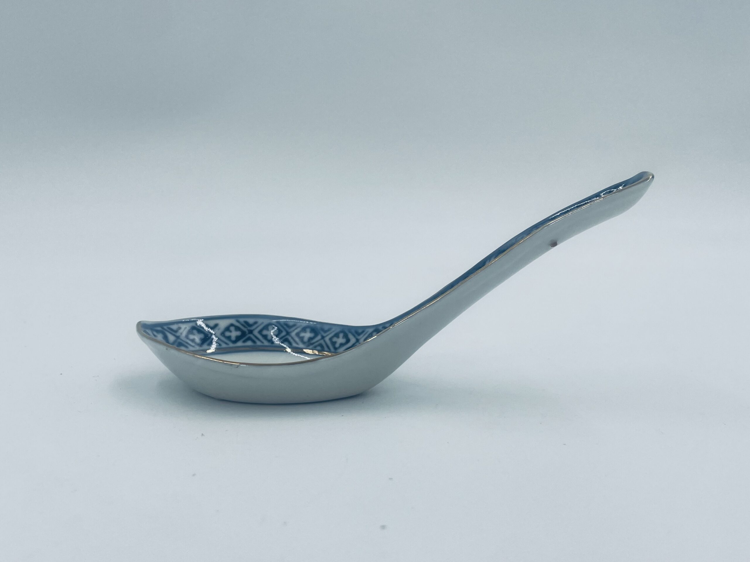 Hand decorated with blue and white borders with gilt decoration and red decoration.