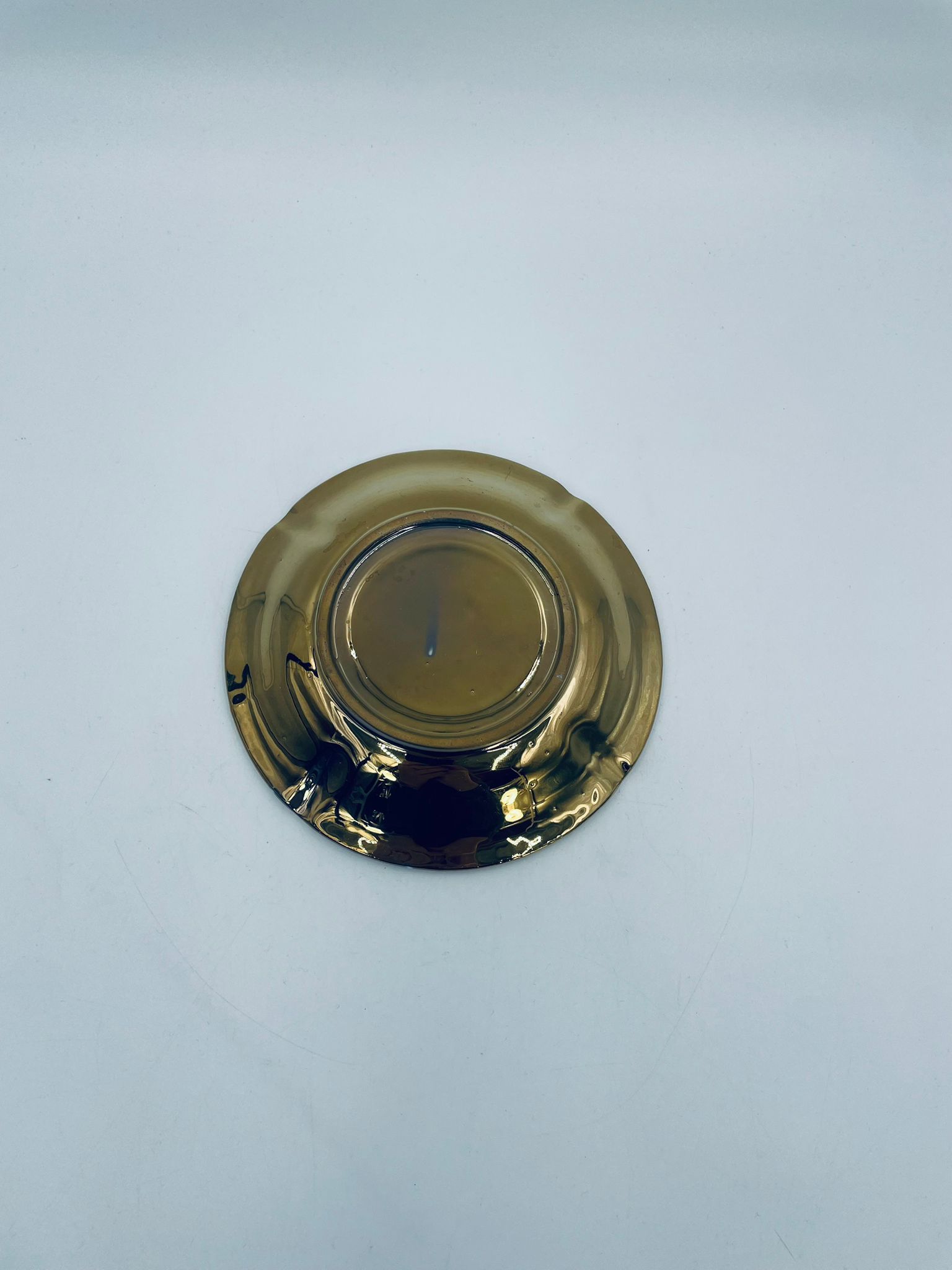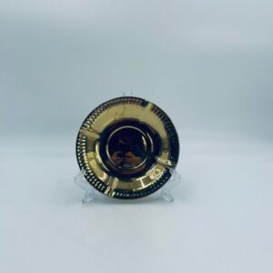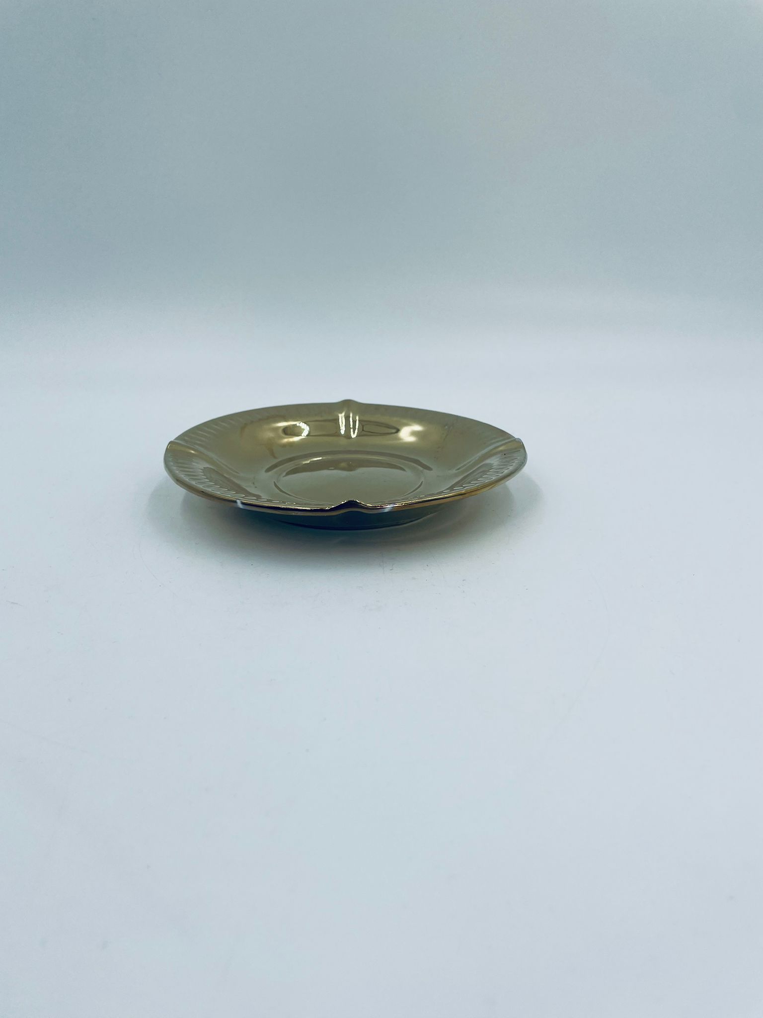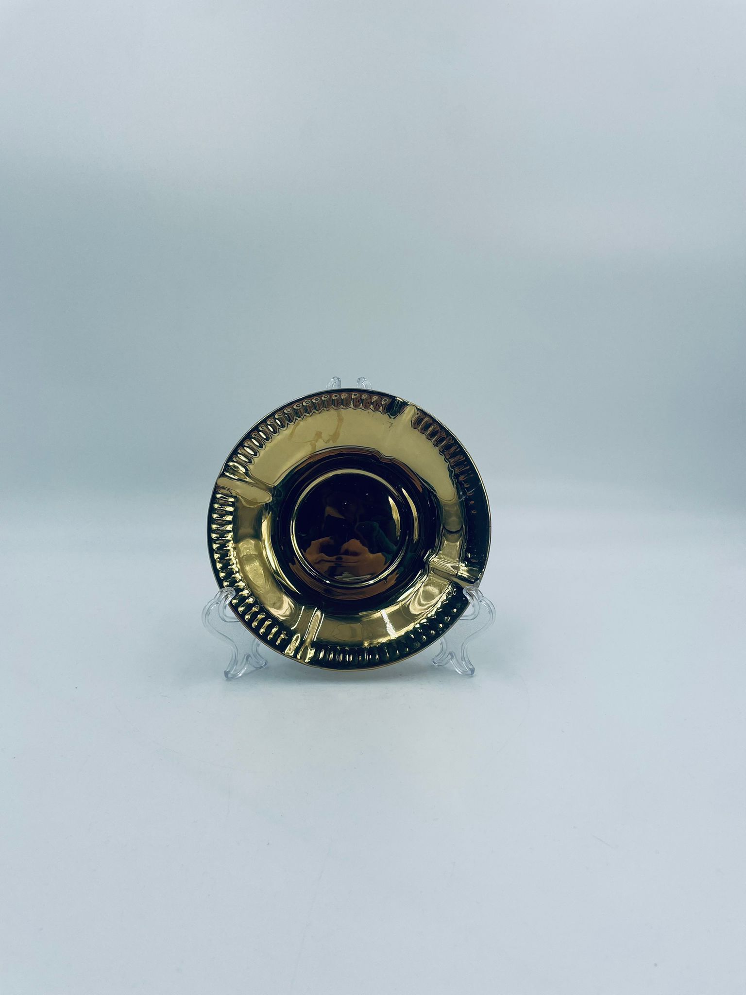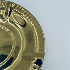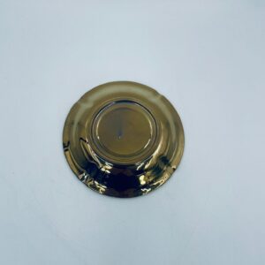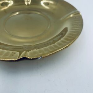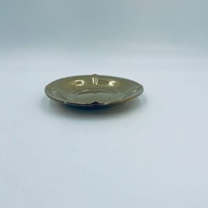 Vintage style teacup saucer, made of high quality porcelain. Richly gilded, the saucer is characterised by an irregular wavy edge decorated in relief. It has rubbing.