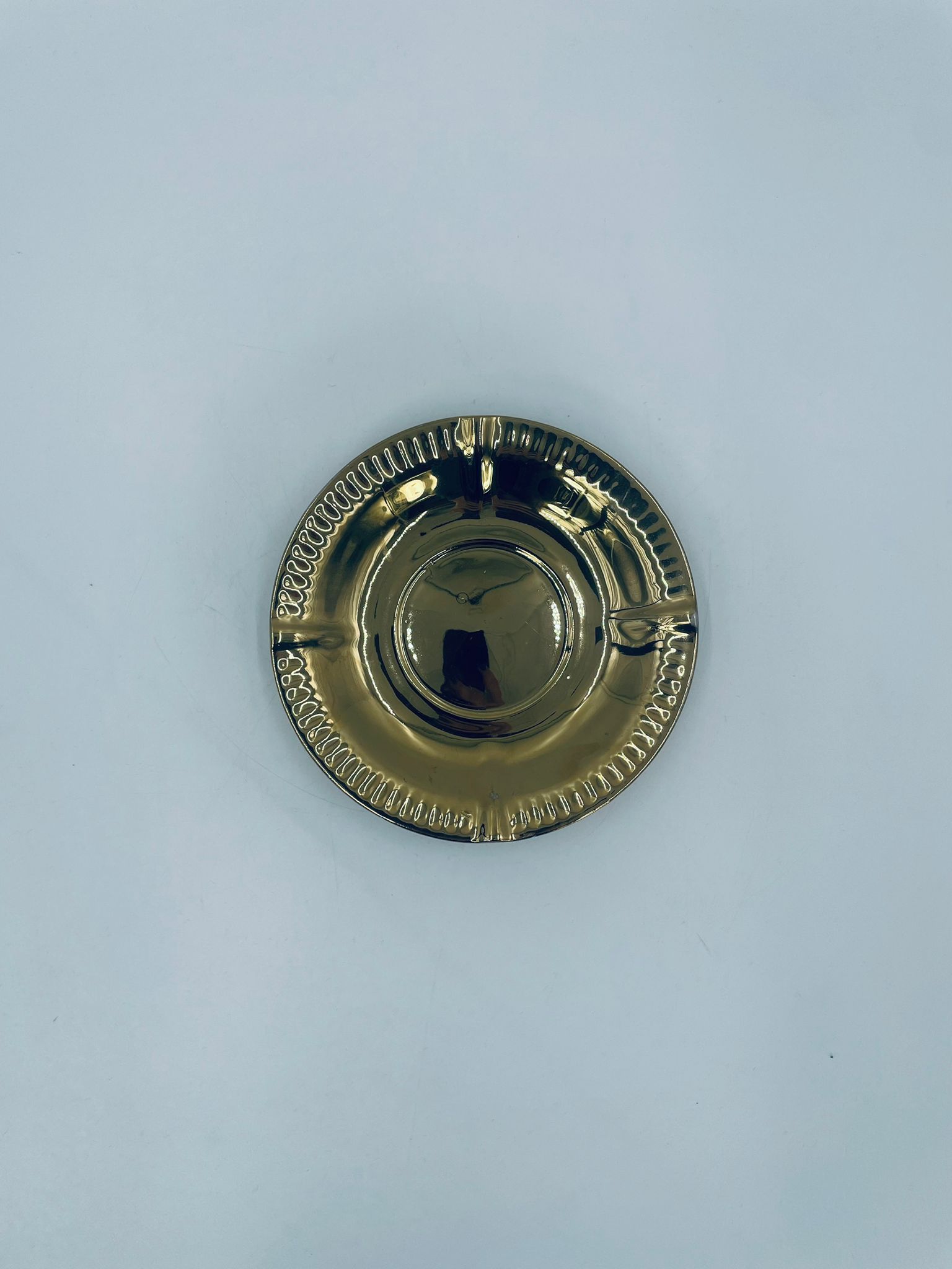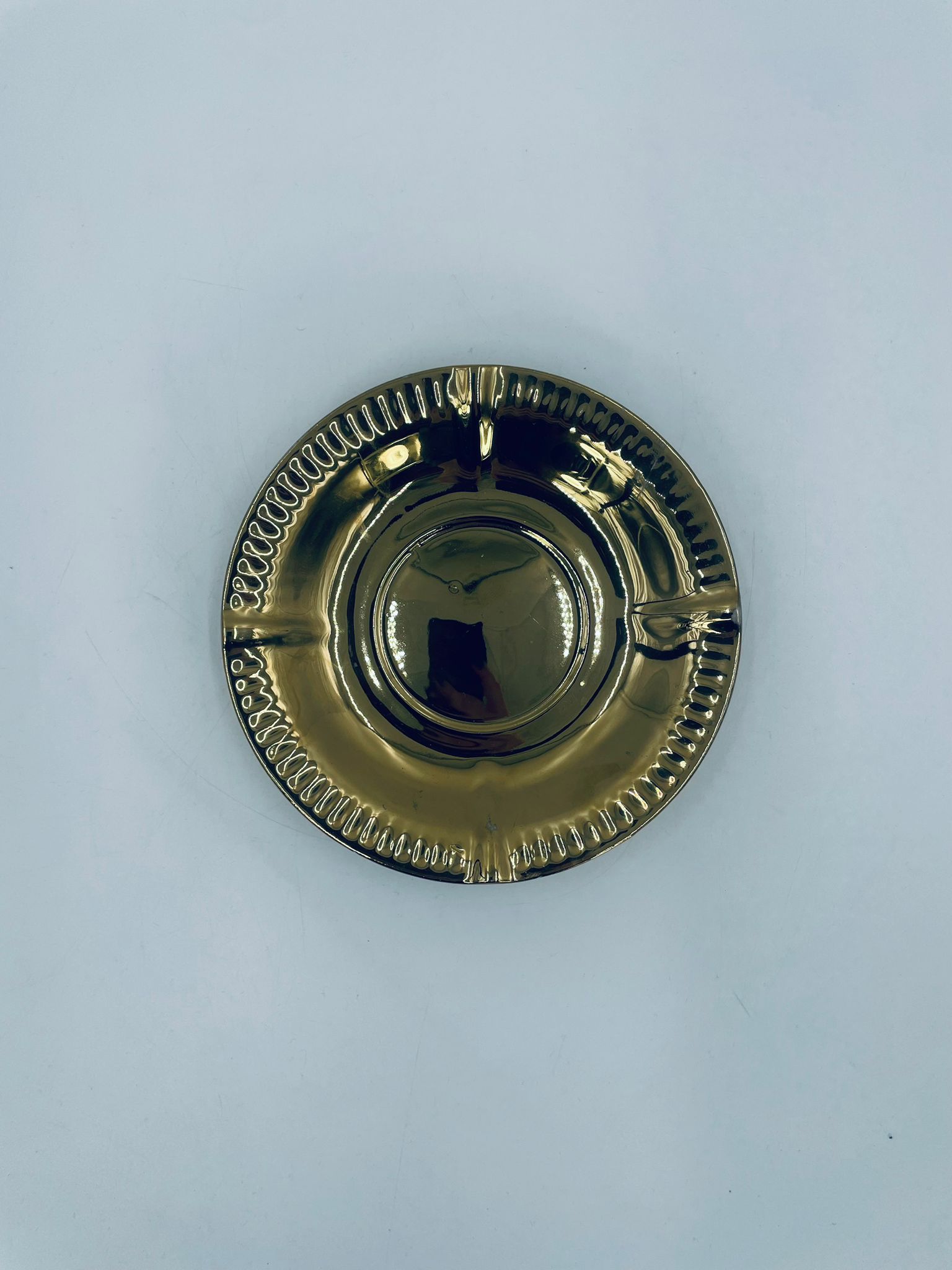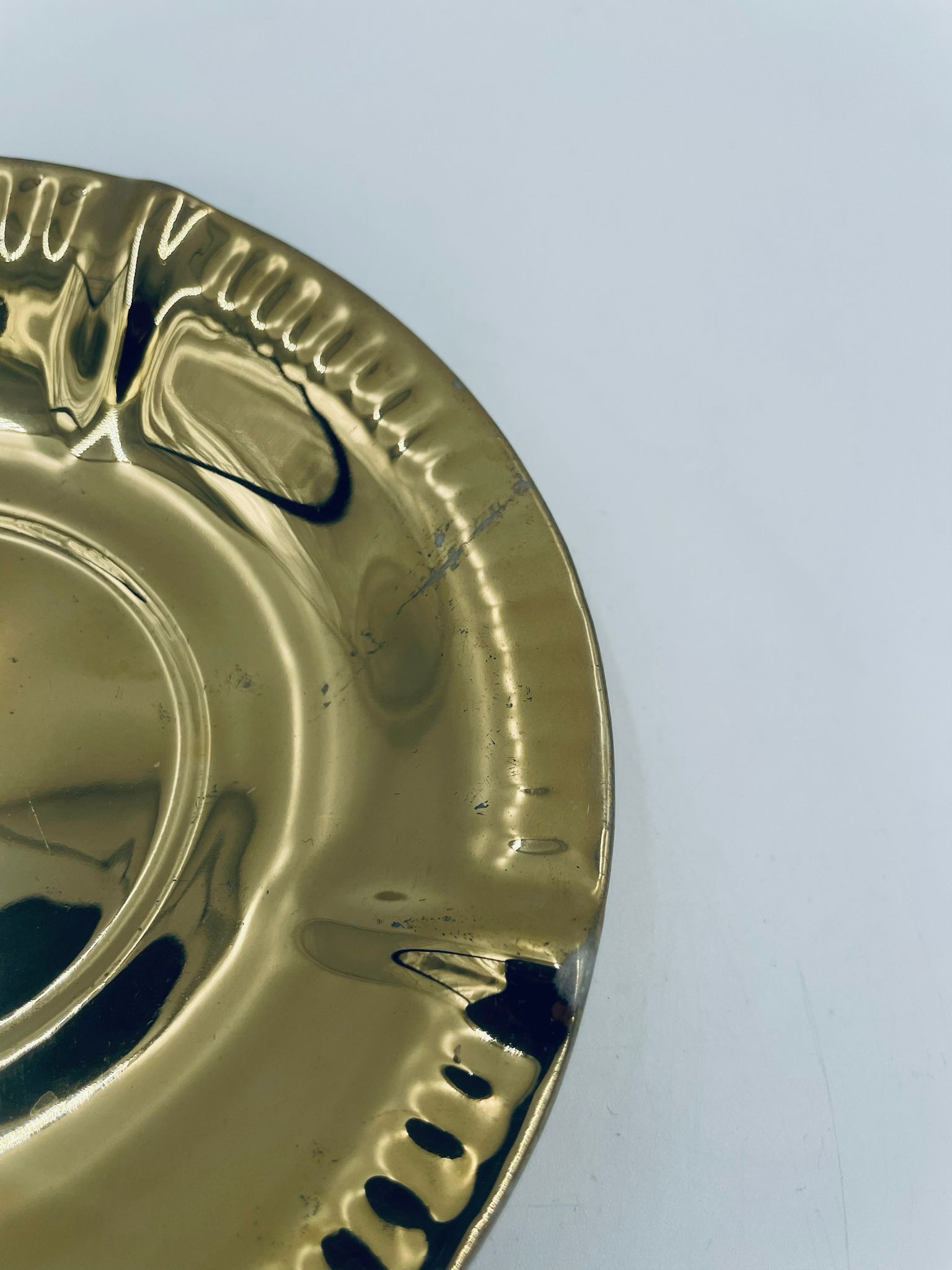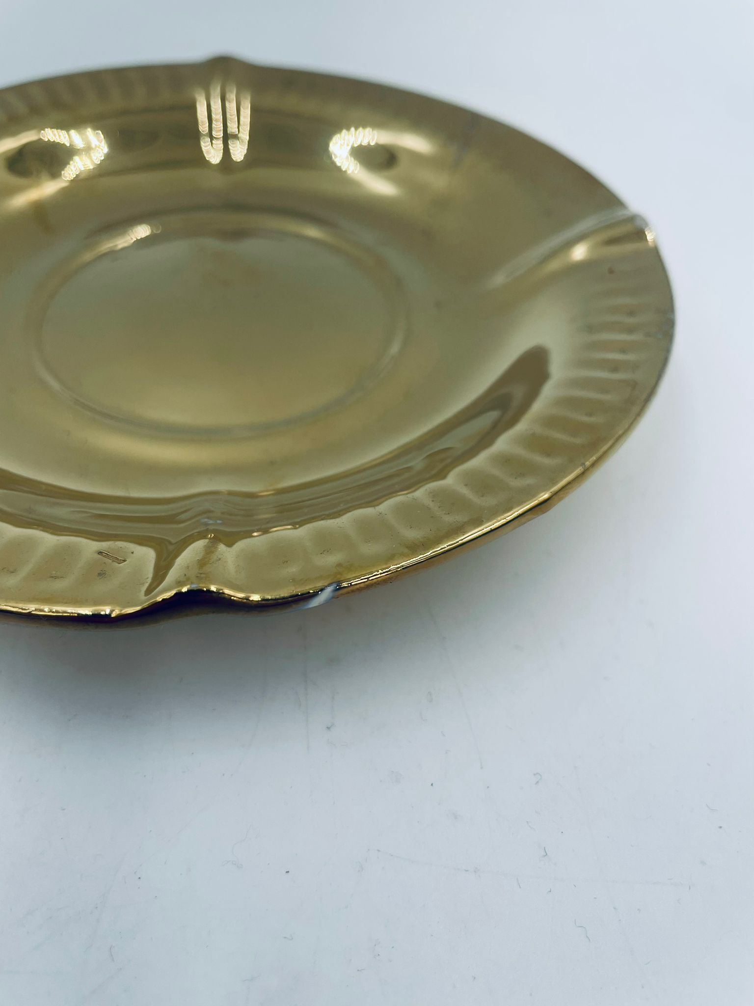 Vintage style teacup saucer, made of high quality porcelain. Richly gilded, the saucer is characterised by an irregular wavy edge decorated in relief. It has rubbing.