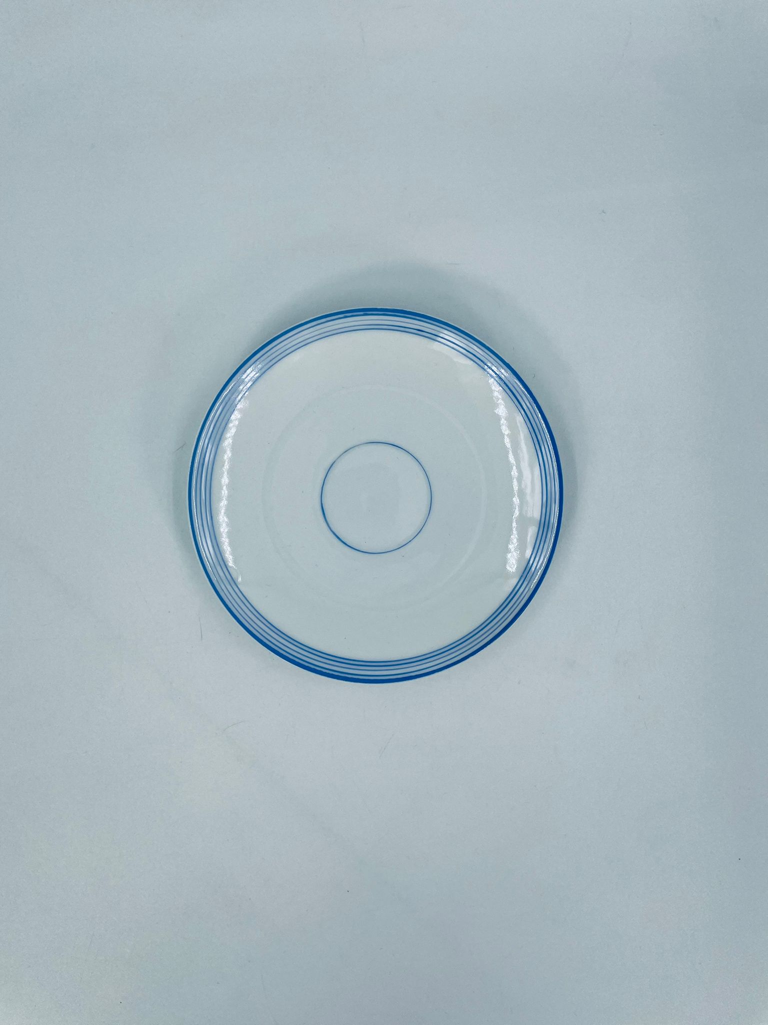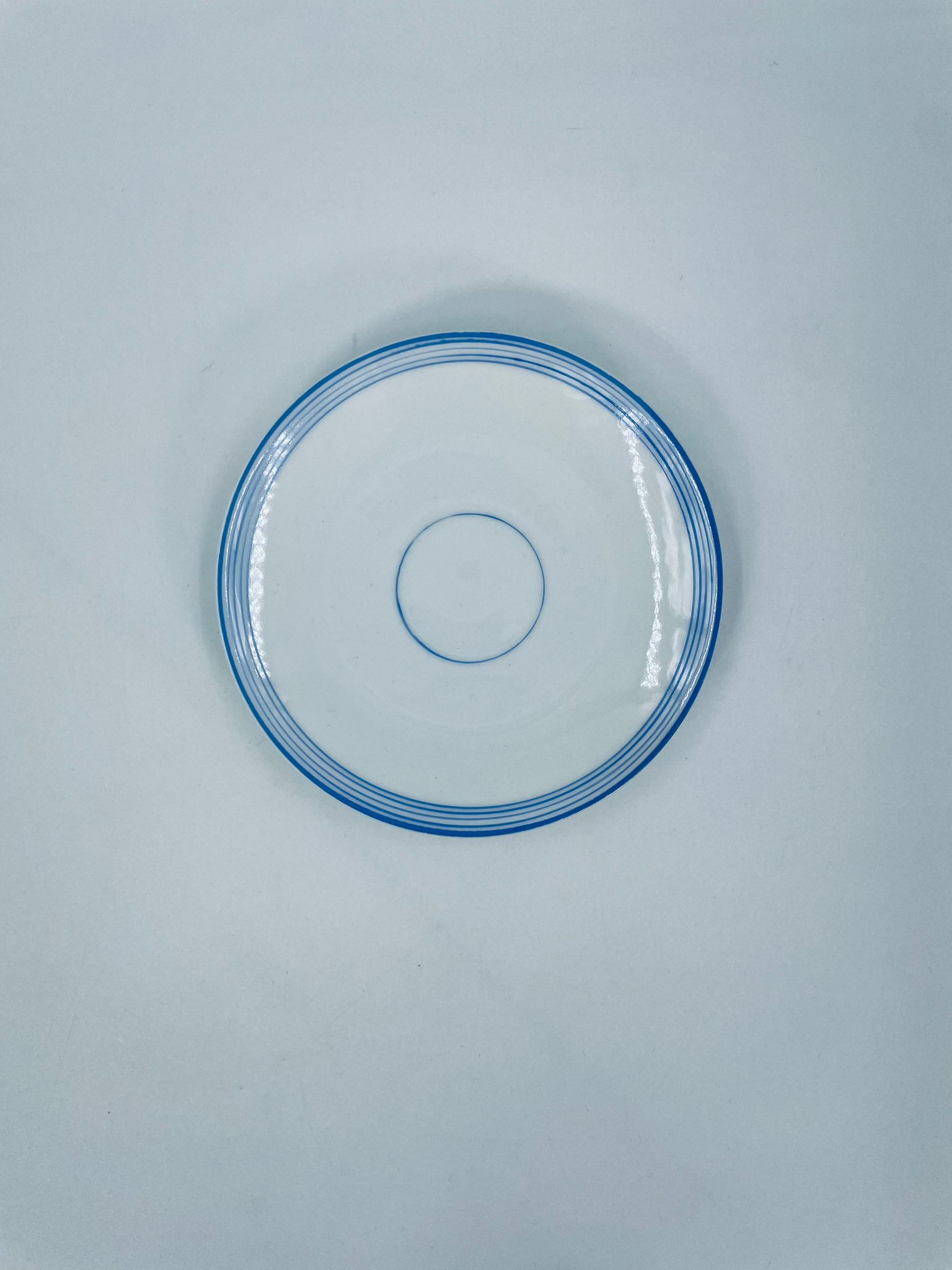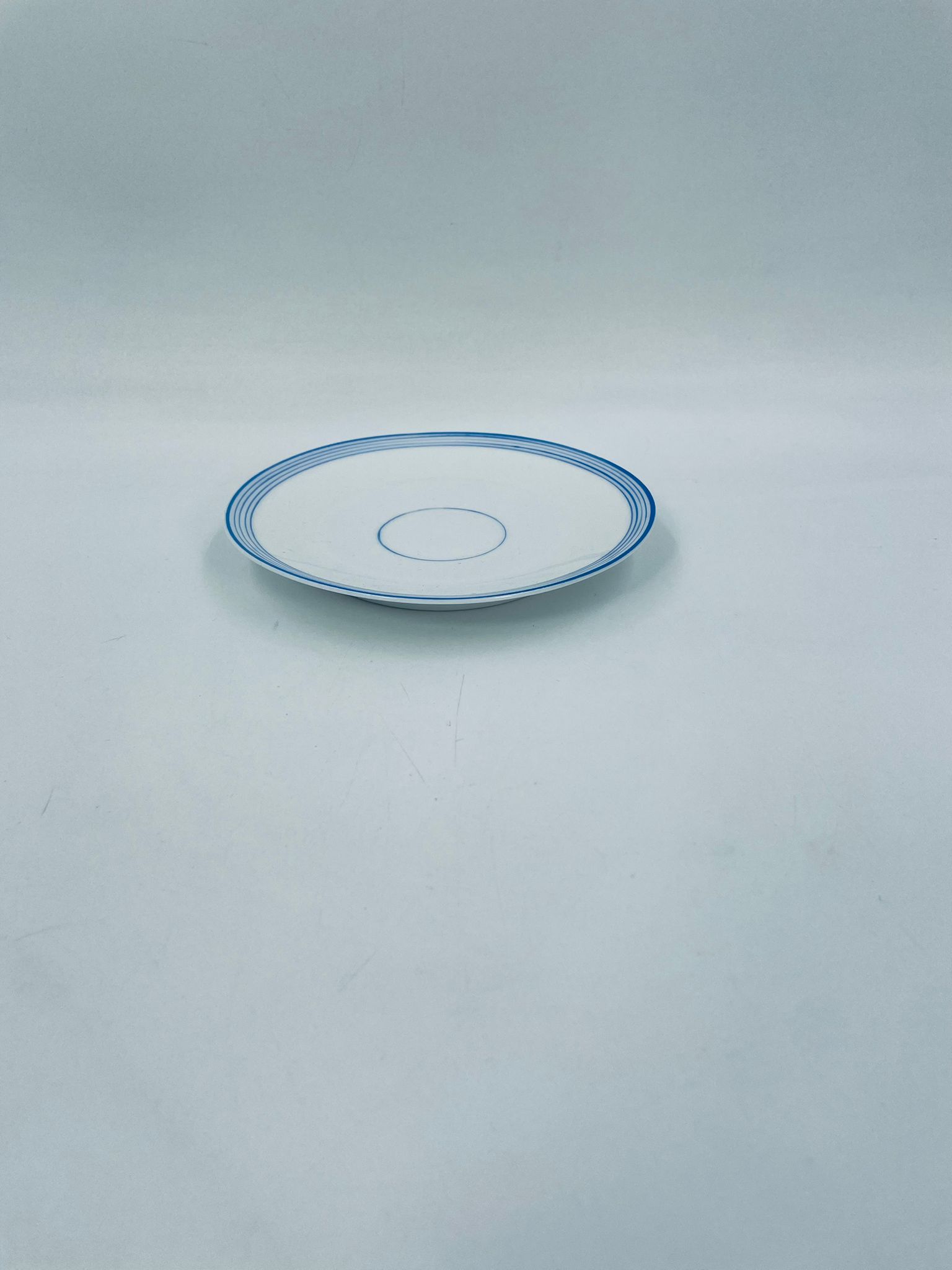 Vintage style teacup saucer, made of high quality white porcelain. Classic plate, decorated with blue stripes.