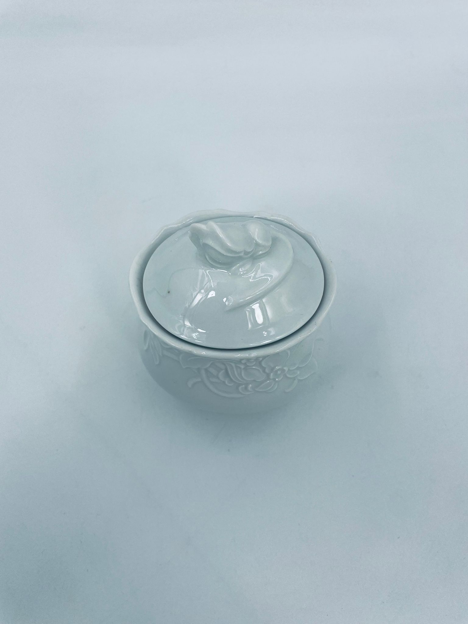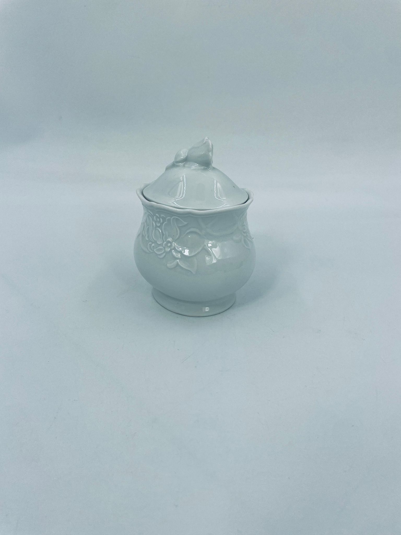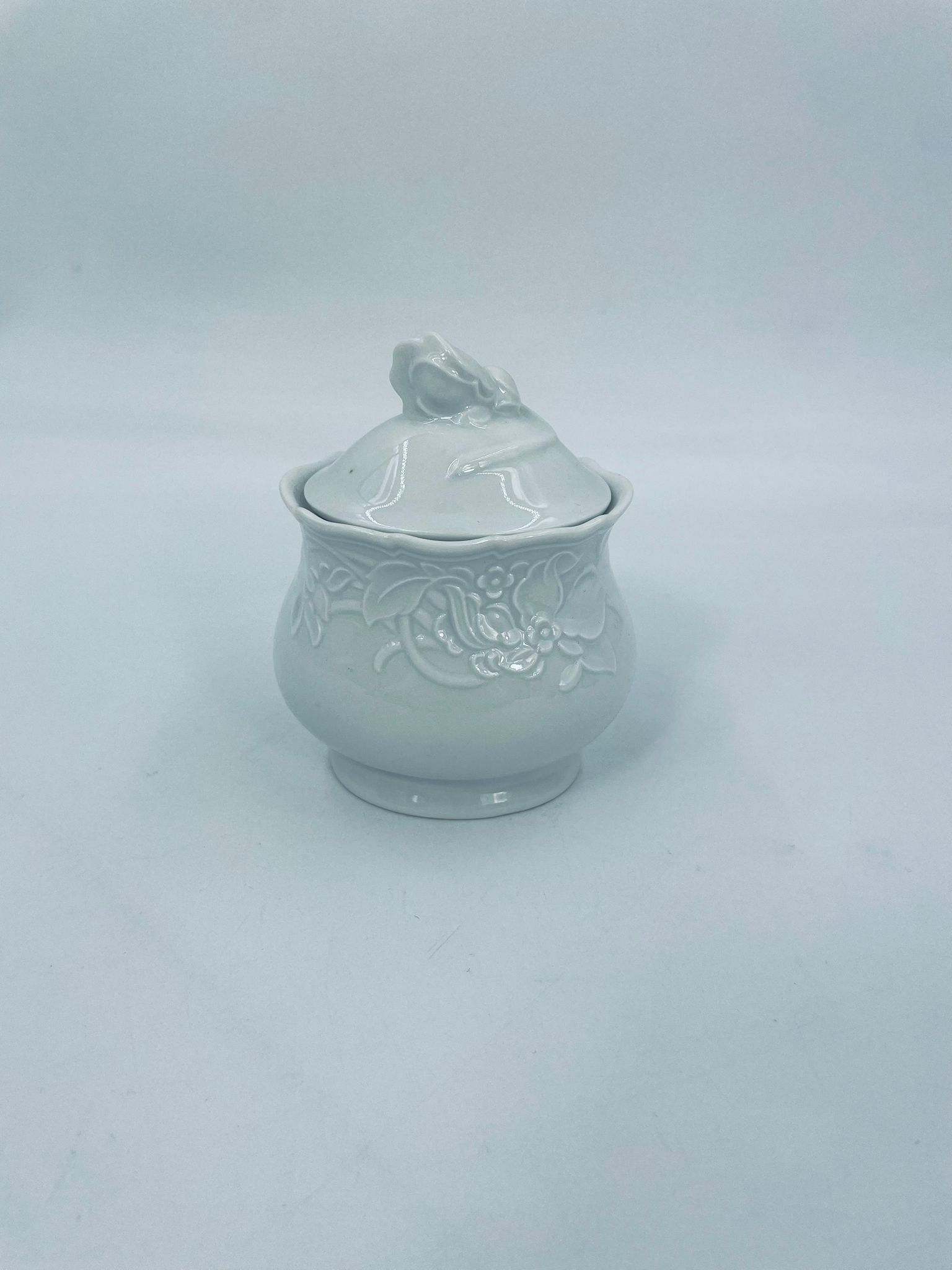 Sugar bowl by the Mitterteich Bavaria factory, made of top-quality white porcelain. A classic sugar bowl, decorated with floral reliefs and with a cover with a decorative handle in the shape of a flower.