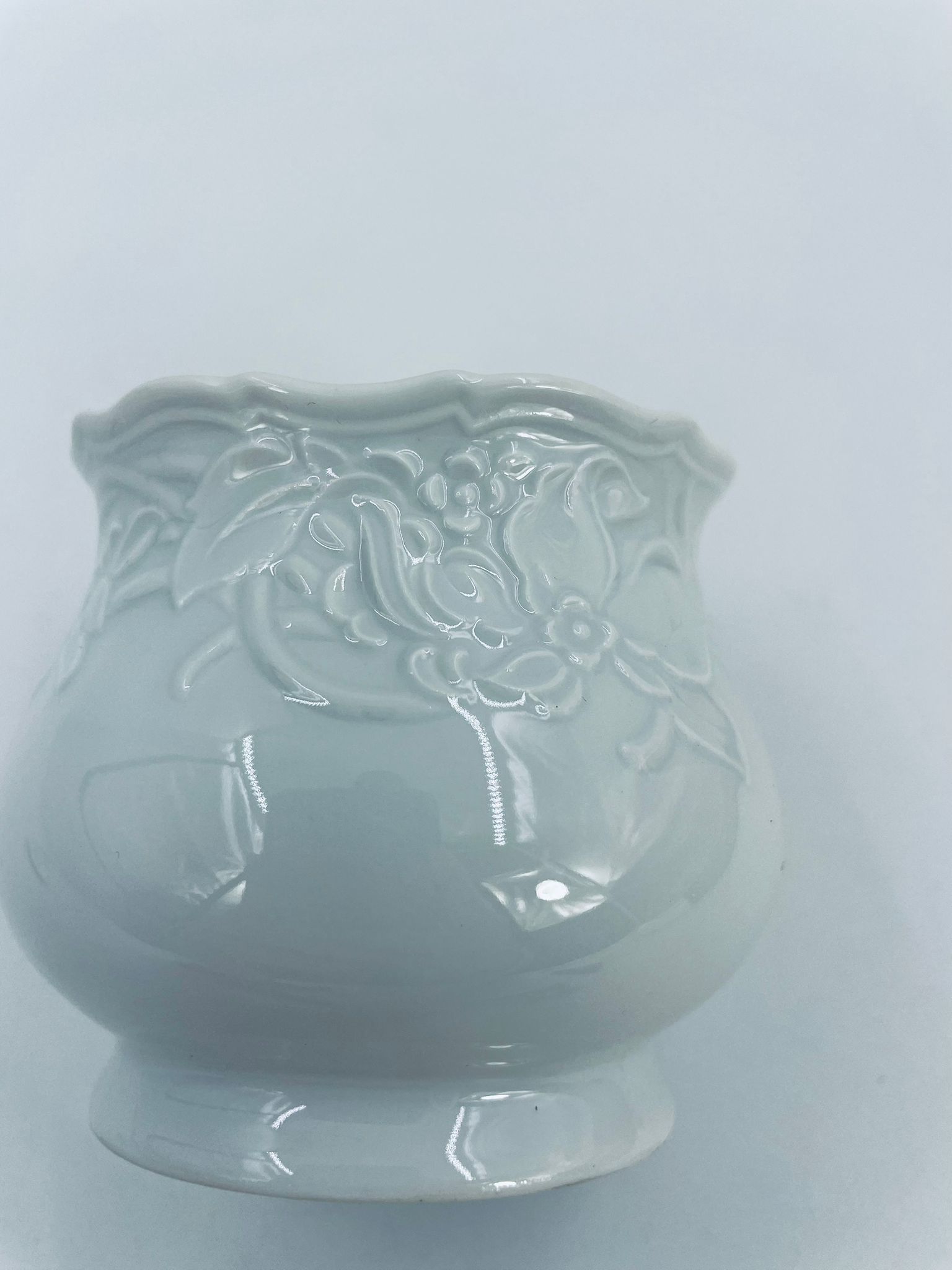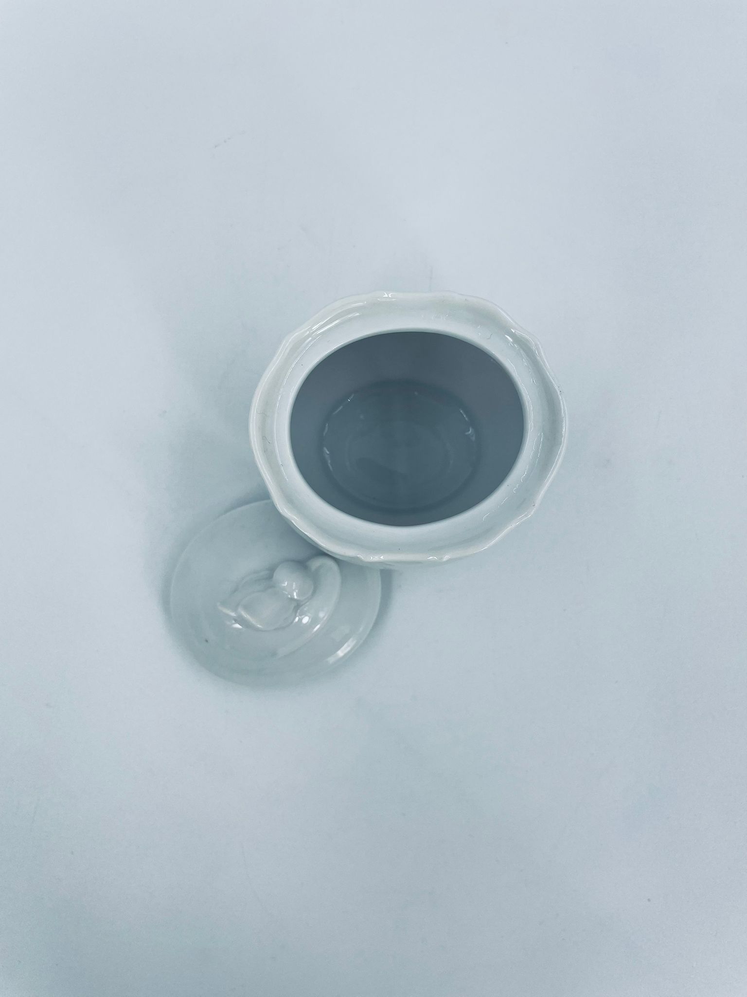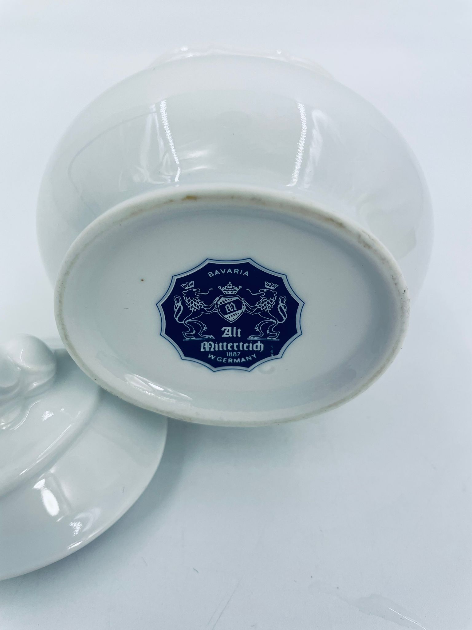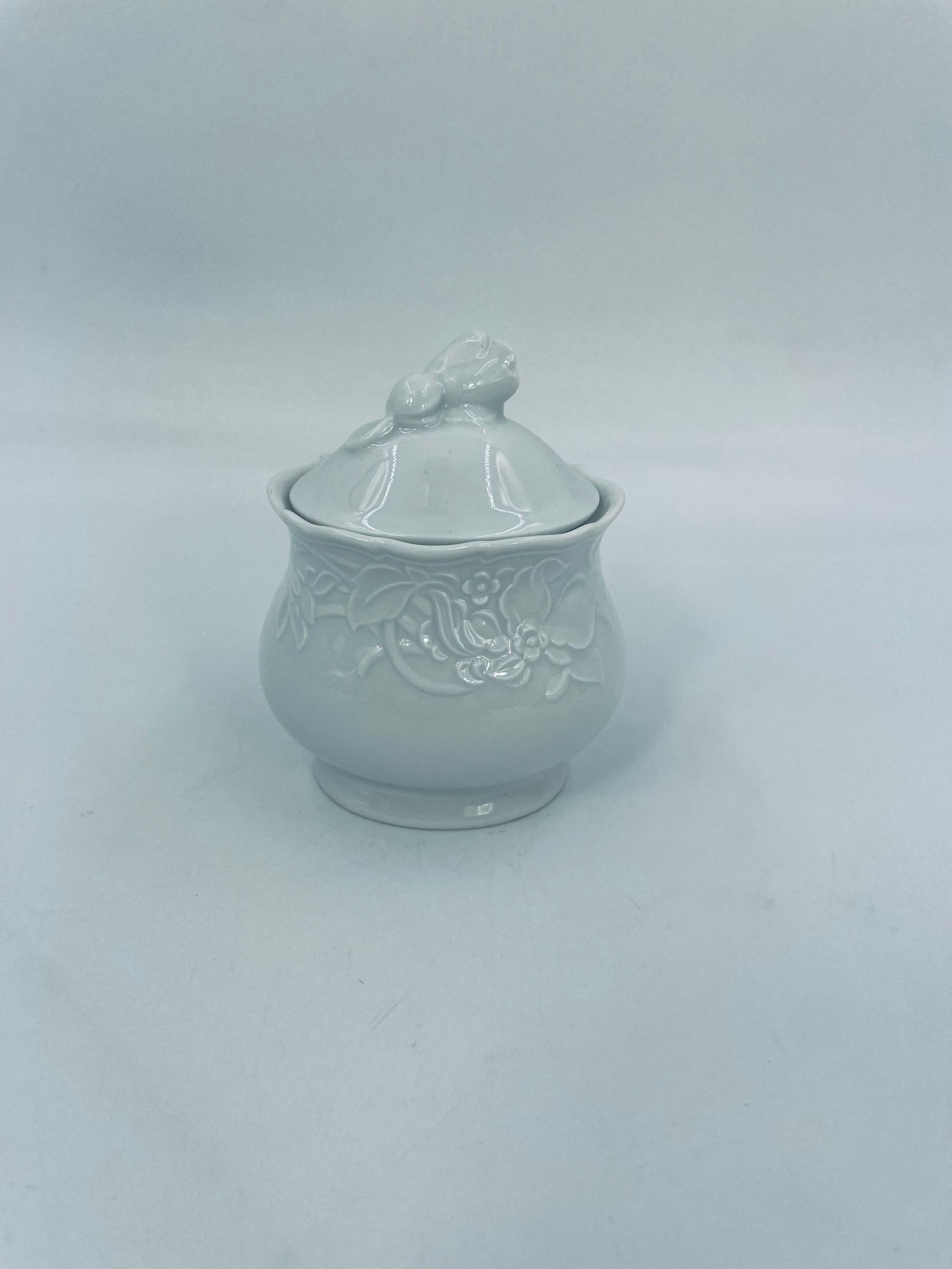 Sugar bowl by the Mitterteich Bavaria factory, made of top-quality white porcelain. A classic sugar bowl, decorated with floral reliefs and with a cover with a decorative handle in the shape of a flower.