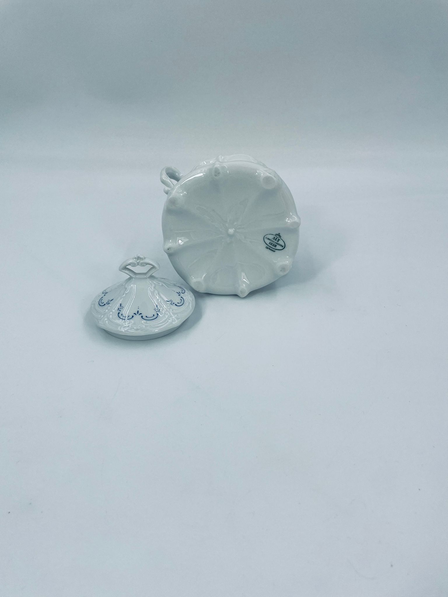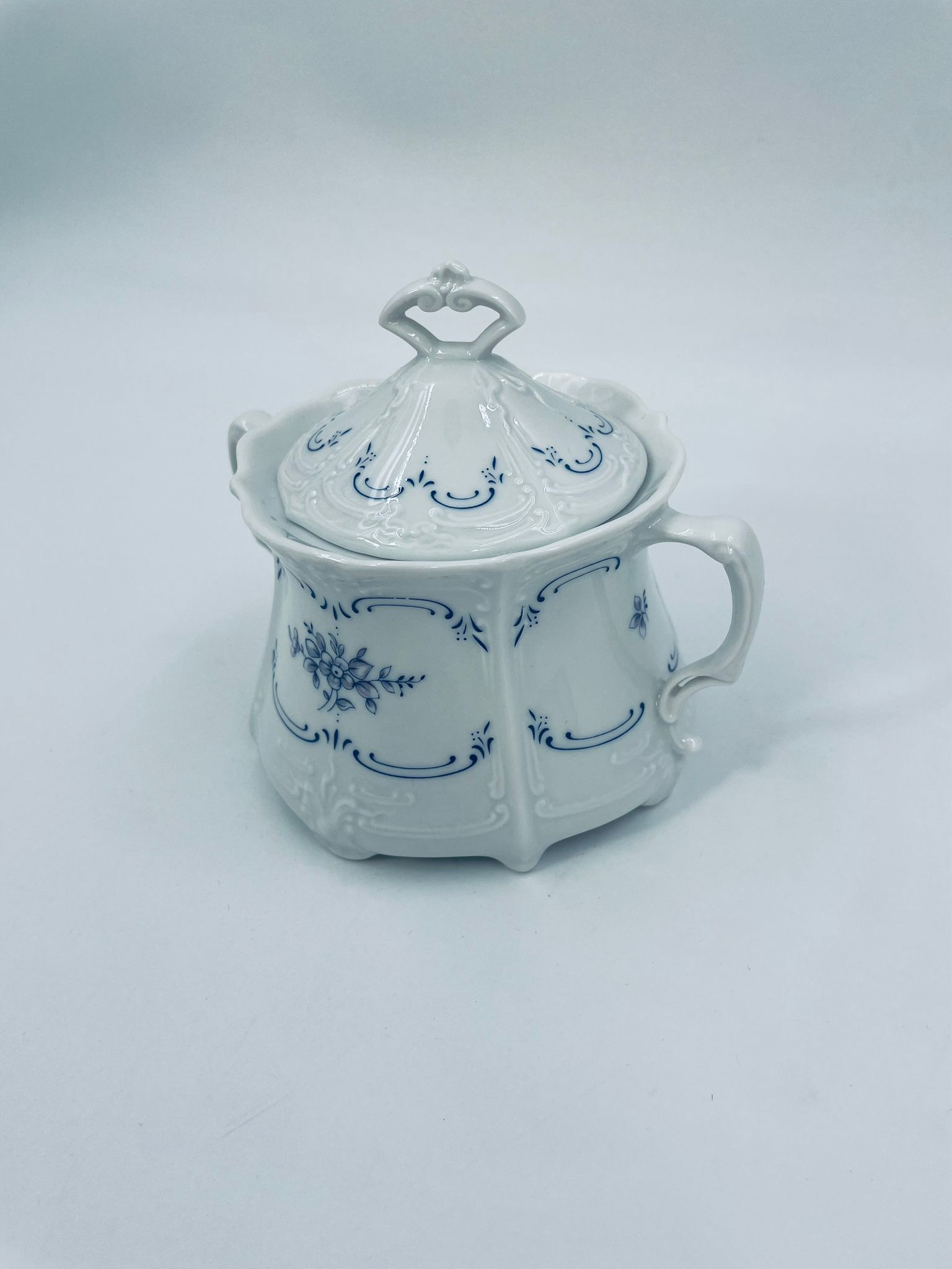 Sugar bowl by the Tirschenreutch label made of high-quality white porcelain. Sugar bowl in the Fleur De Lis Blue design, characterised by blue accents, floral pattern, decorative reliefs and a wavy rim.