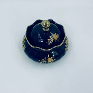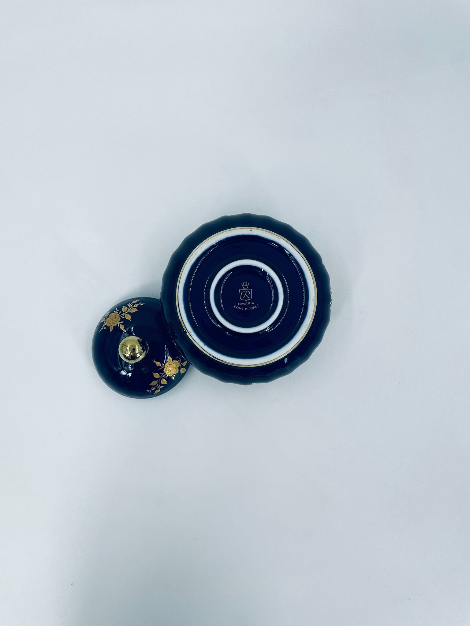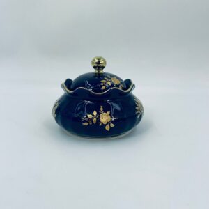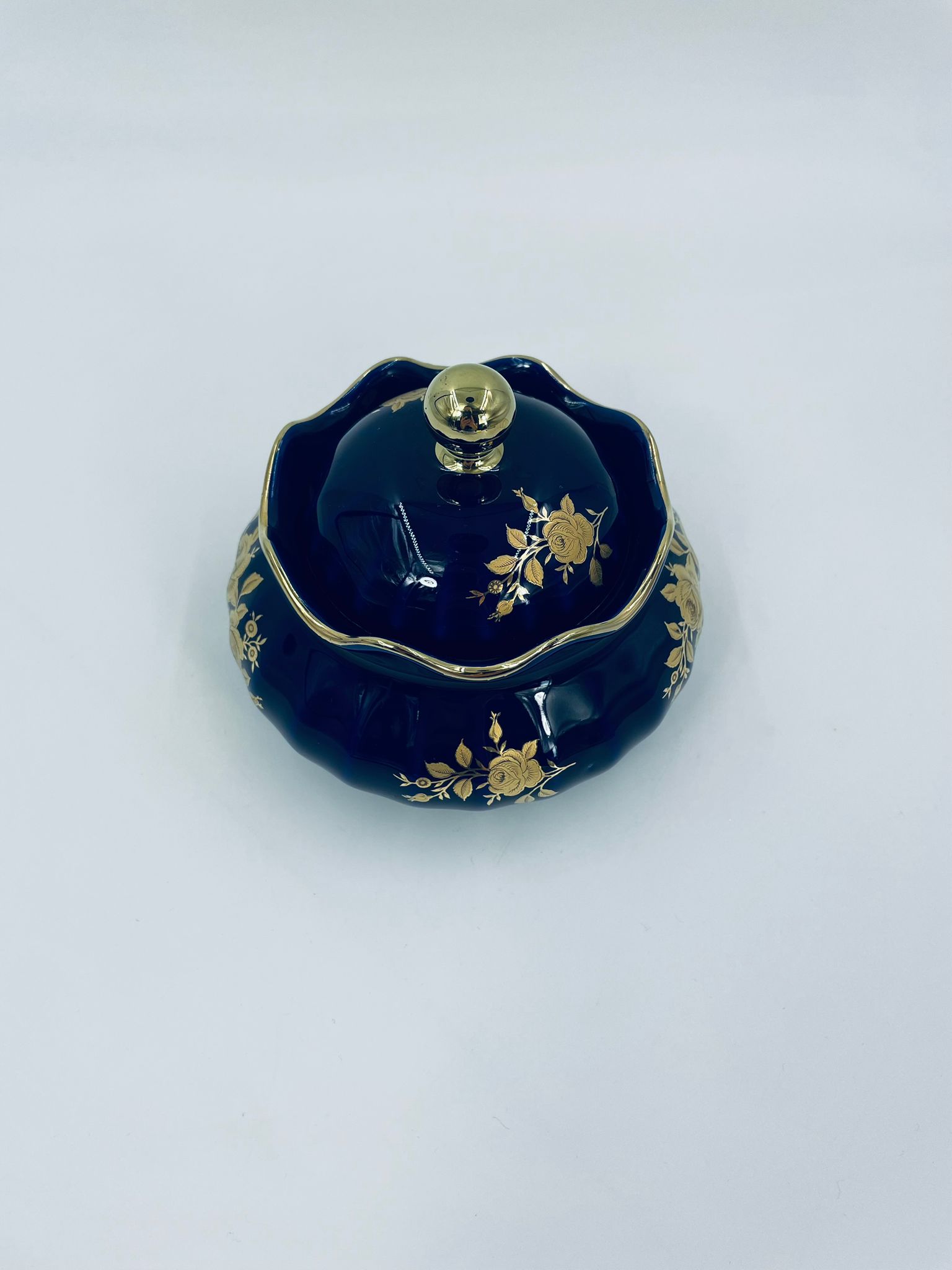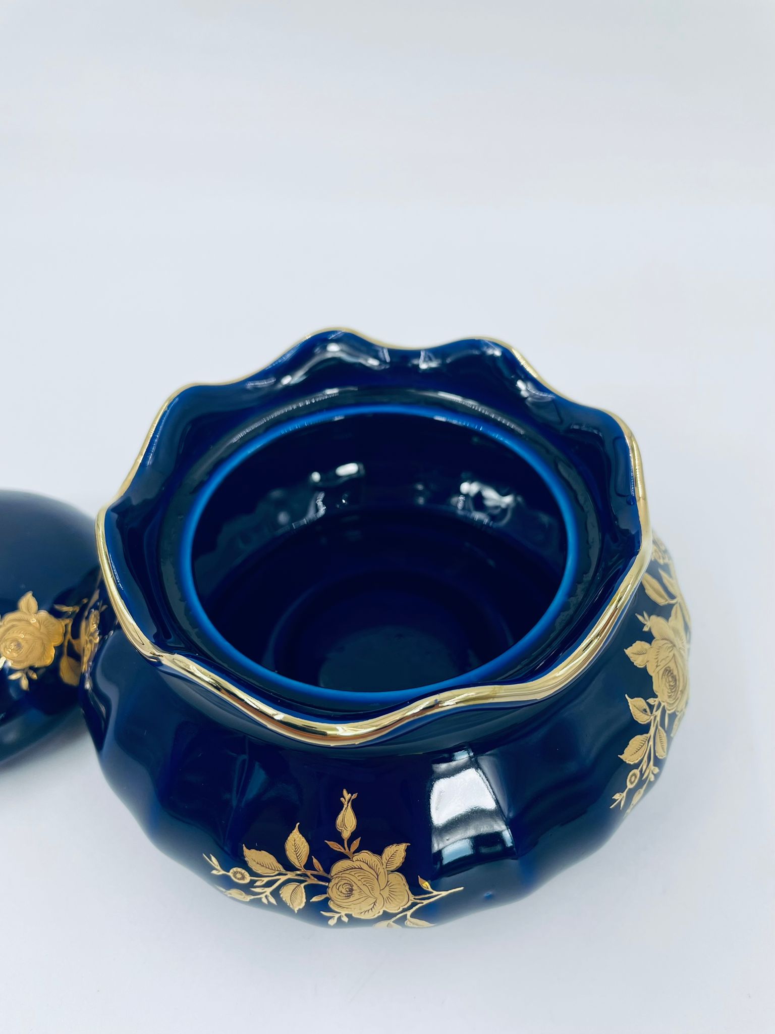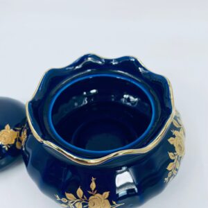 Sugar bowl by the Wunsiedel Echt Kobalt Bavaria label, made of high-quality porcelain in cobalt colour. The sugar bowl has a decorative wavy top edge, a rounded body shape and a 24 carat gold-plated Rose design.