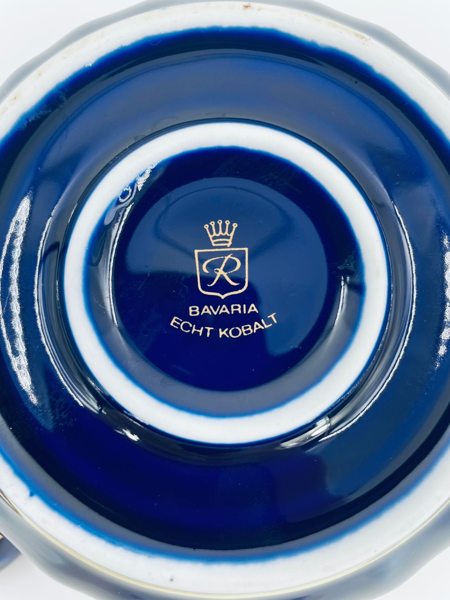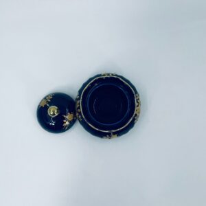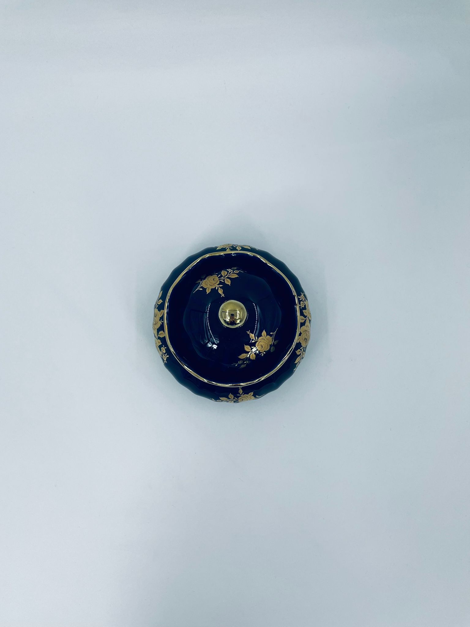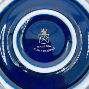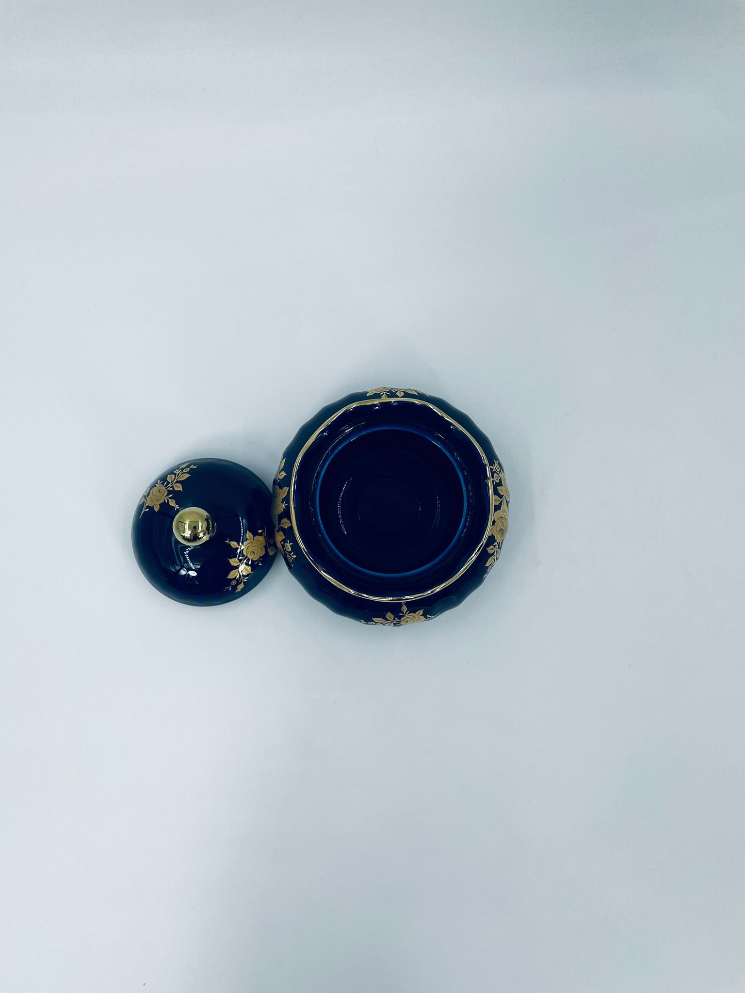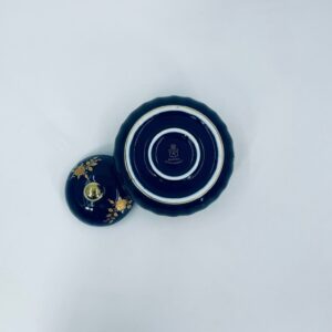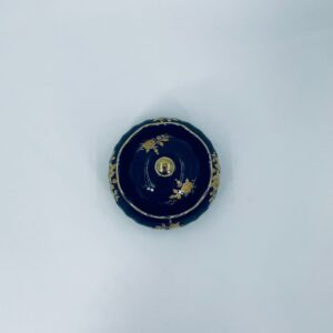 Sugar bowl by the Wunsiedel Echt Kobalt Bavaria label, made of high-quality porcelain in cobalt colour. The sugar bowl has a decorative wavy top edge, a rounded body shape and a 24 carat gold-plated Rose design.